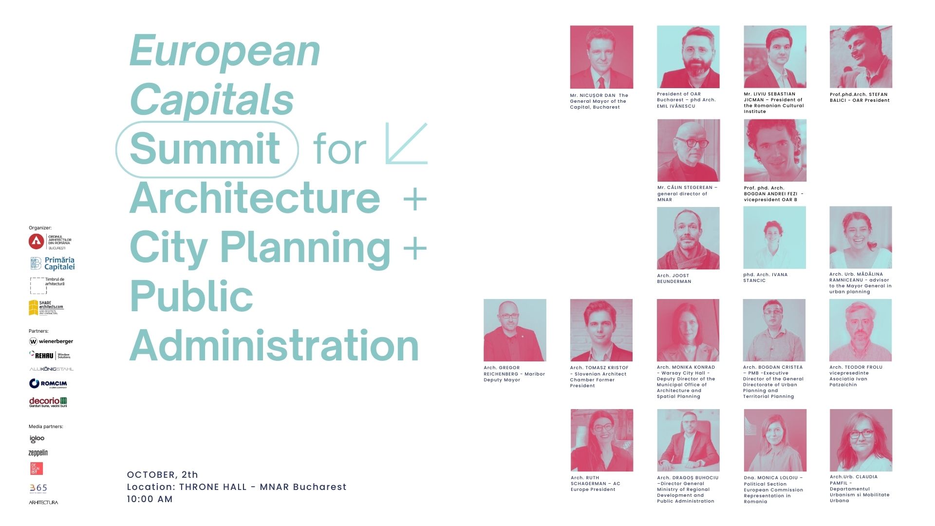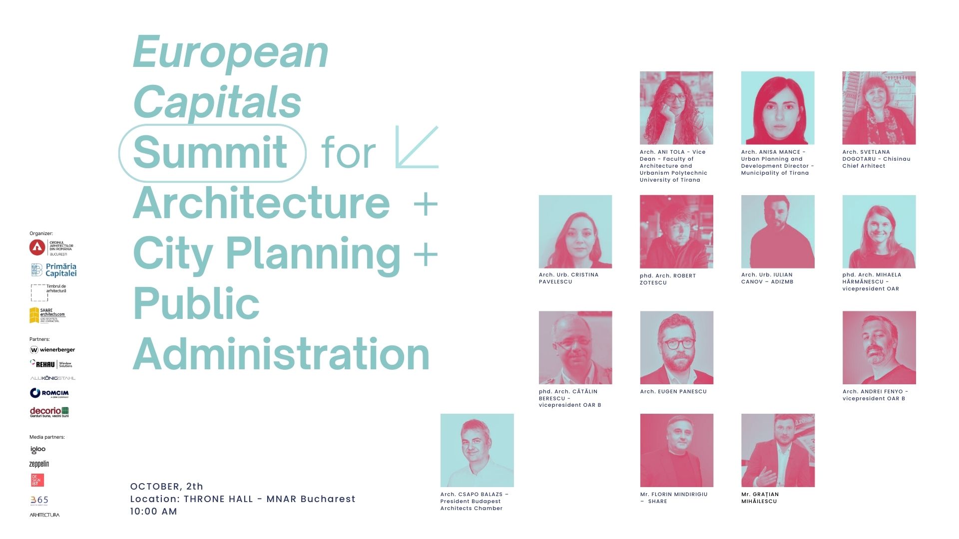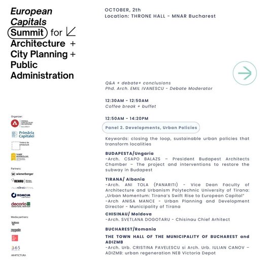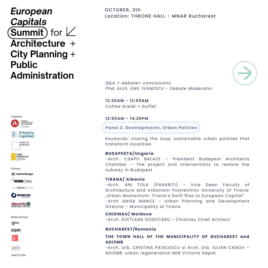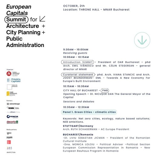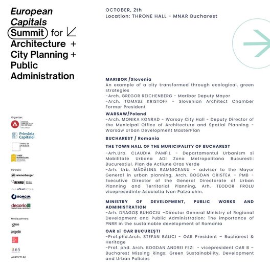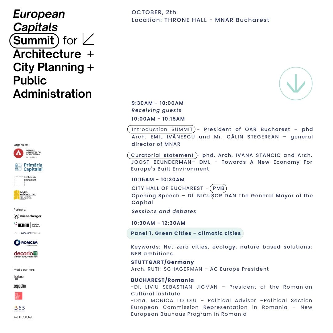 Summitul este organizat de Filiala București a Ordinului Arhitecților din România alături de Primăria Municipiului București, în cadrul Anualei de Arhitectură București 2024, ediția a XXII-a, fiind un eveniment internațional prin care aducem împreună experiențe valoroase din mediul administrativ alături de cele din mediul profesional, de arhitectură, design și urbanism din Europa, exemple care pot inspira și pot asigura acțiuni viitoare utile dezvoltării orașelor europene.