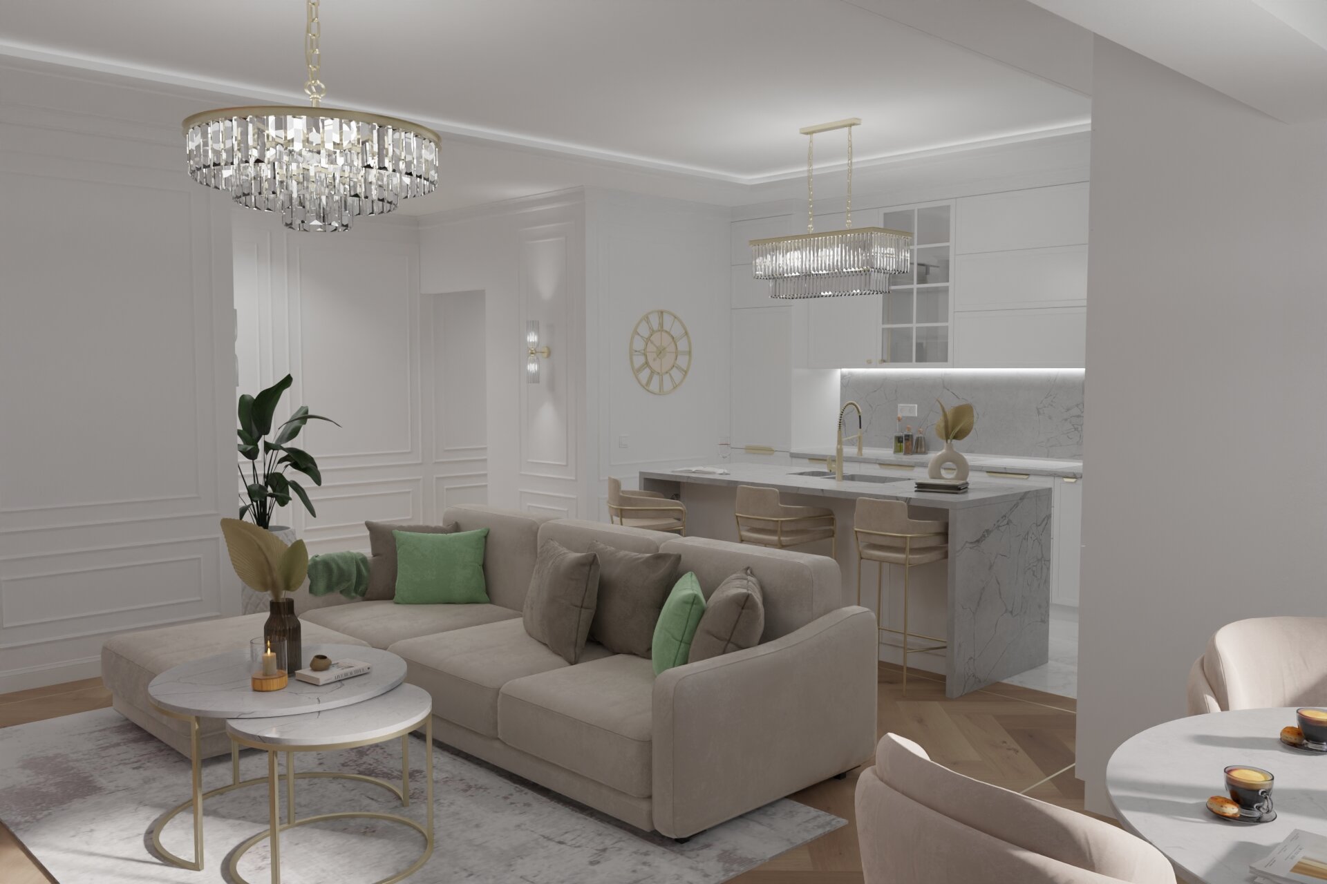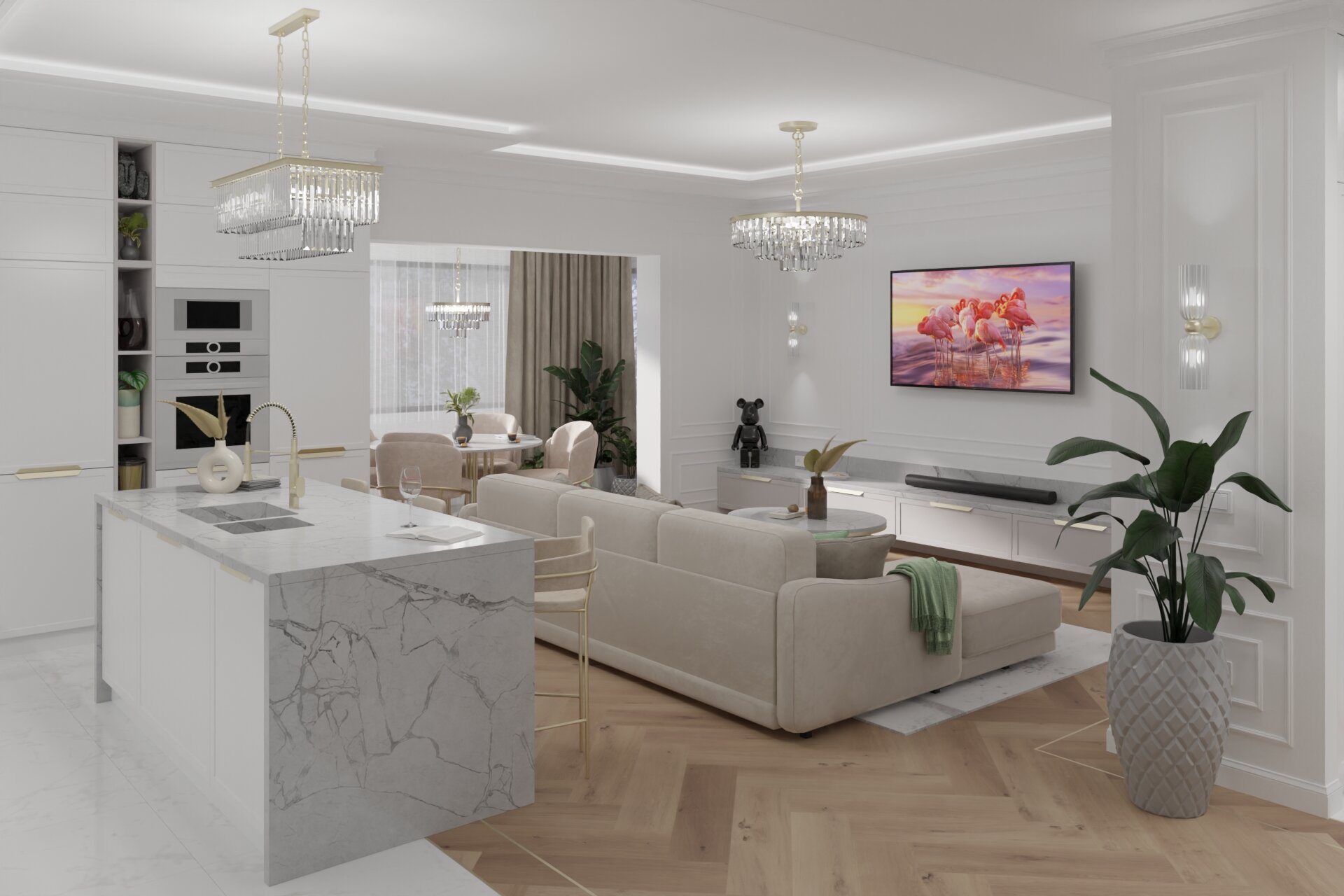 The open-plan living room is the heart of the apartment, where the kitchen, dining area, and relaxation space harmoniously blend together. The kitchen features a generous island, perfect for cooking and enjoying breakfast in a stylish yet informal setting.