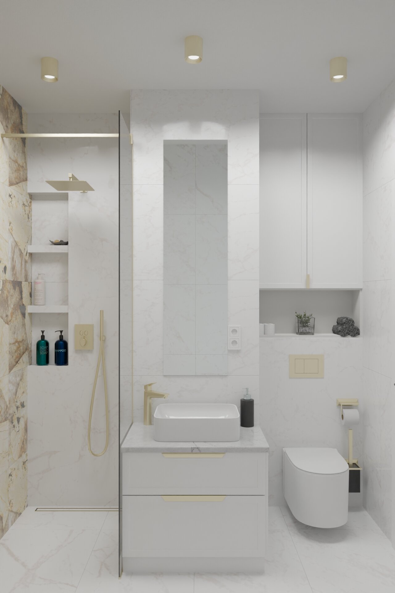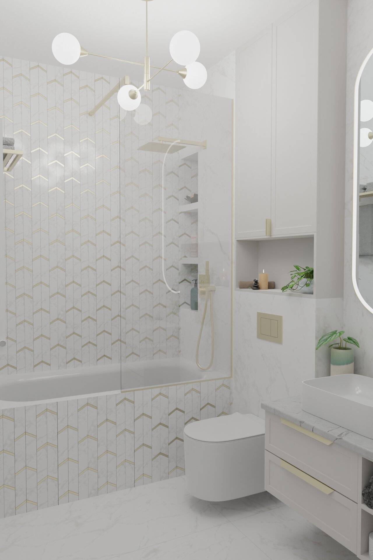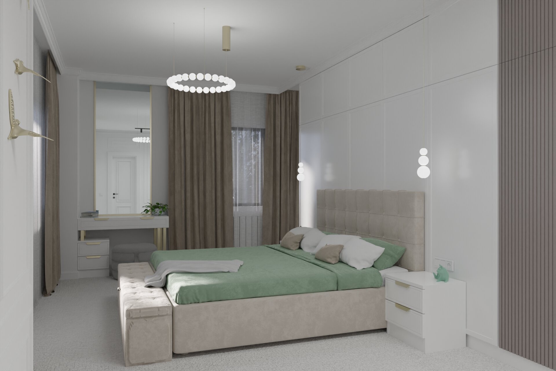 The entire apartment is characterized by warm tones – beige, cream, and cappuccino – complemented by subtle green accents that bring a touch of freshness. Additionally, gold accents, discreetly used in various furniture pieces and decorations, add a luxurious and refined air. The marble-like tiles enhance the elegance, amplifying the sense of space and brightness.