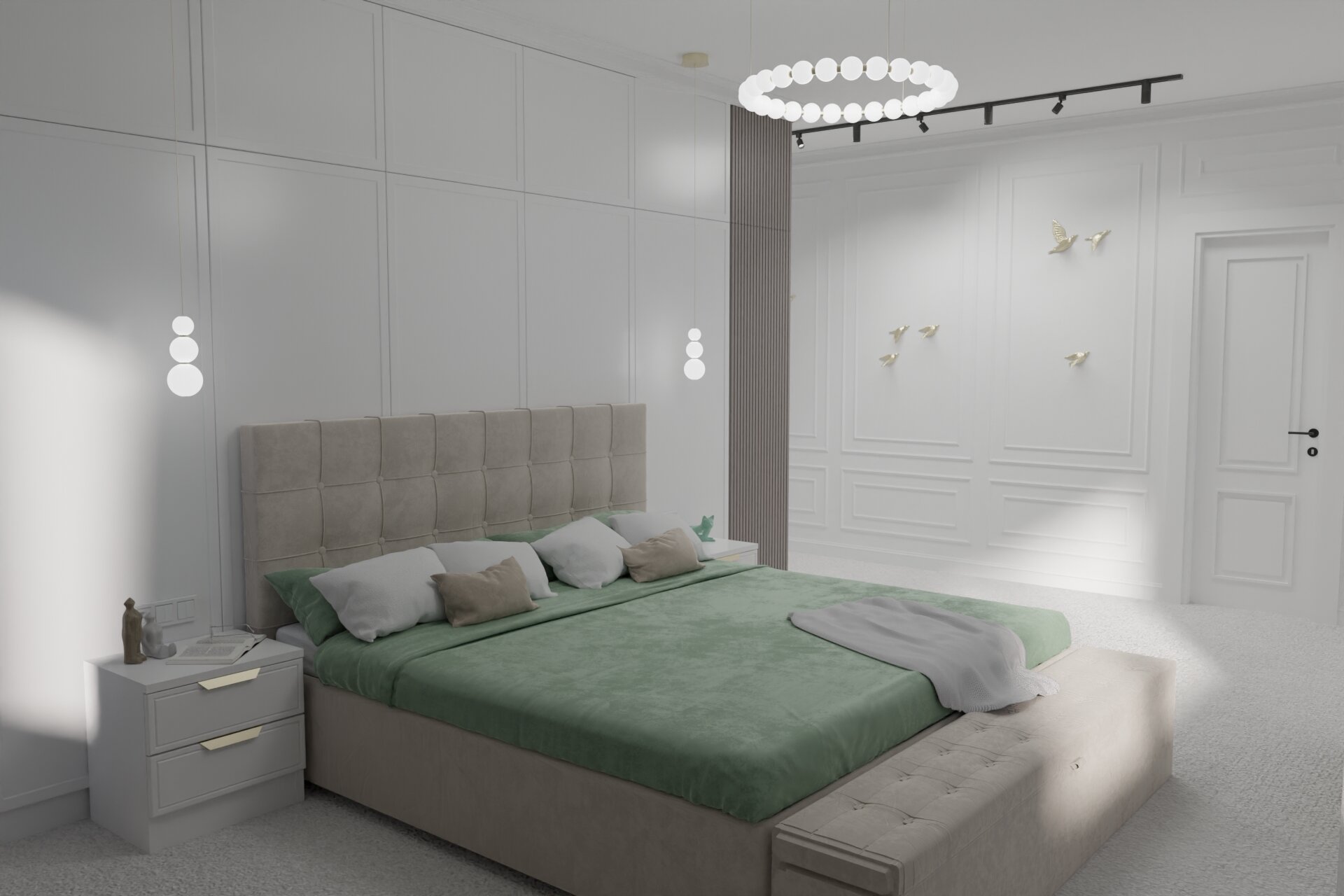The master bedroom is a true retreat, offering ample space and featuring a private bathroom and a large dressing room. The room also includes a dedicated corner for a makeup vanity, emphasizing attention to detail and personal comfort.