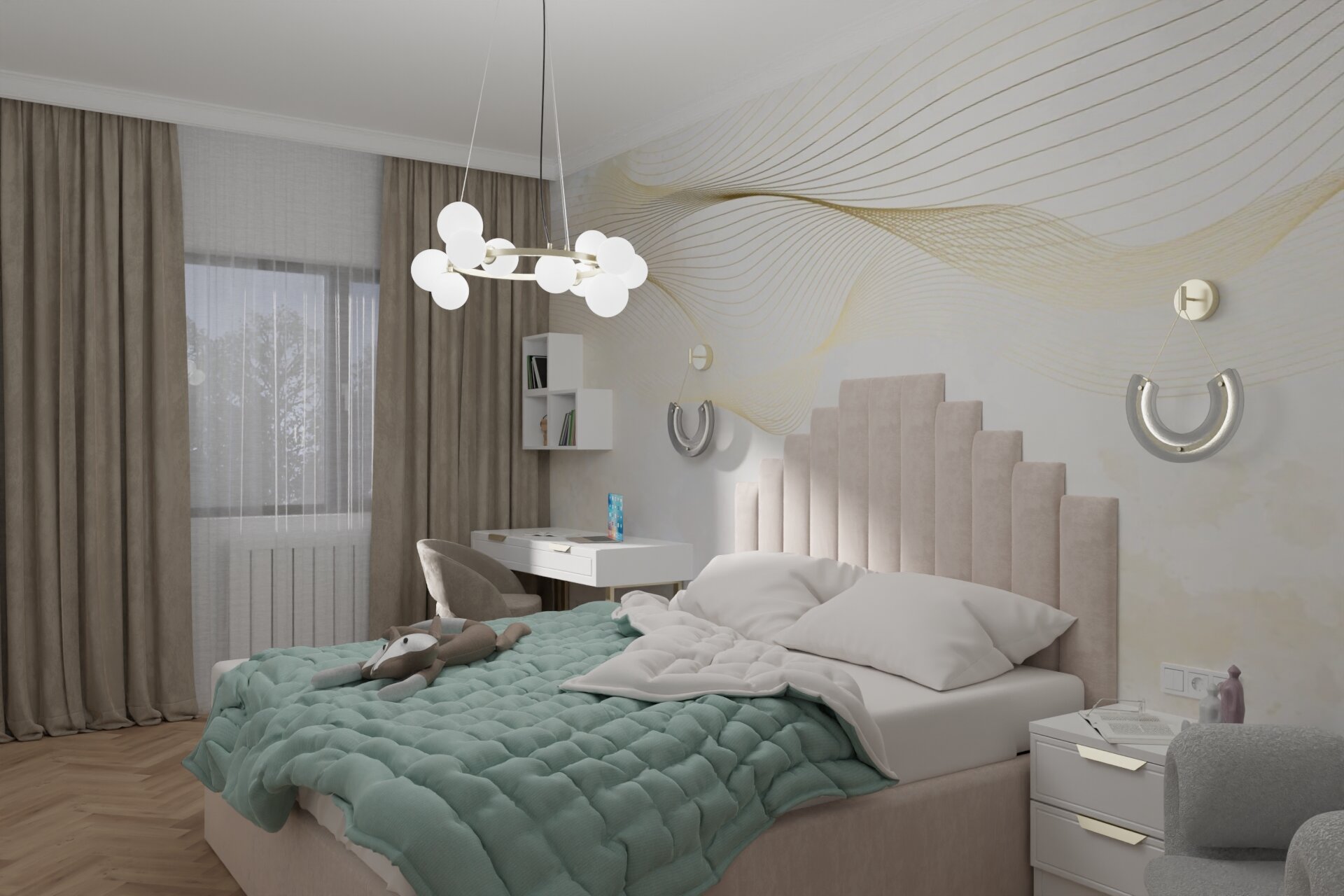 The child’s bedroom is decorated in warm, pleasant tones, offering a comfortable and inviting space. With a thoughtful design, the room provides plenty of space for play, ensuring both functionality and a relaxing atmosphere.