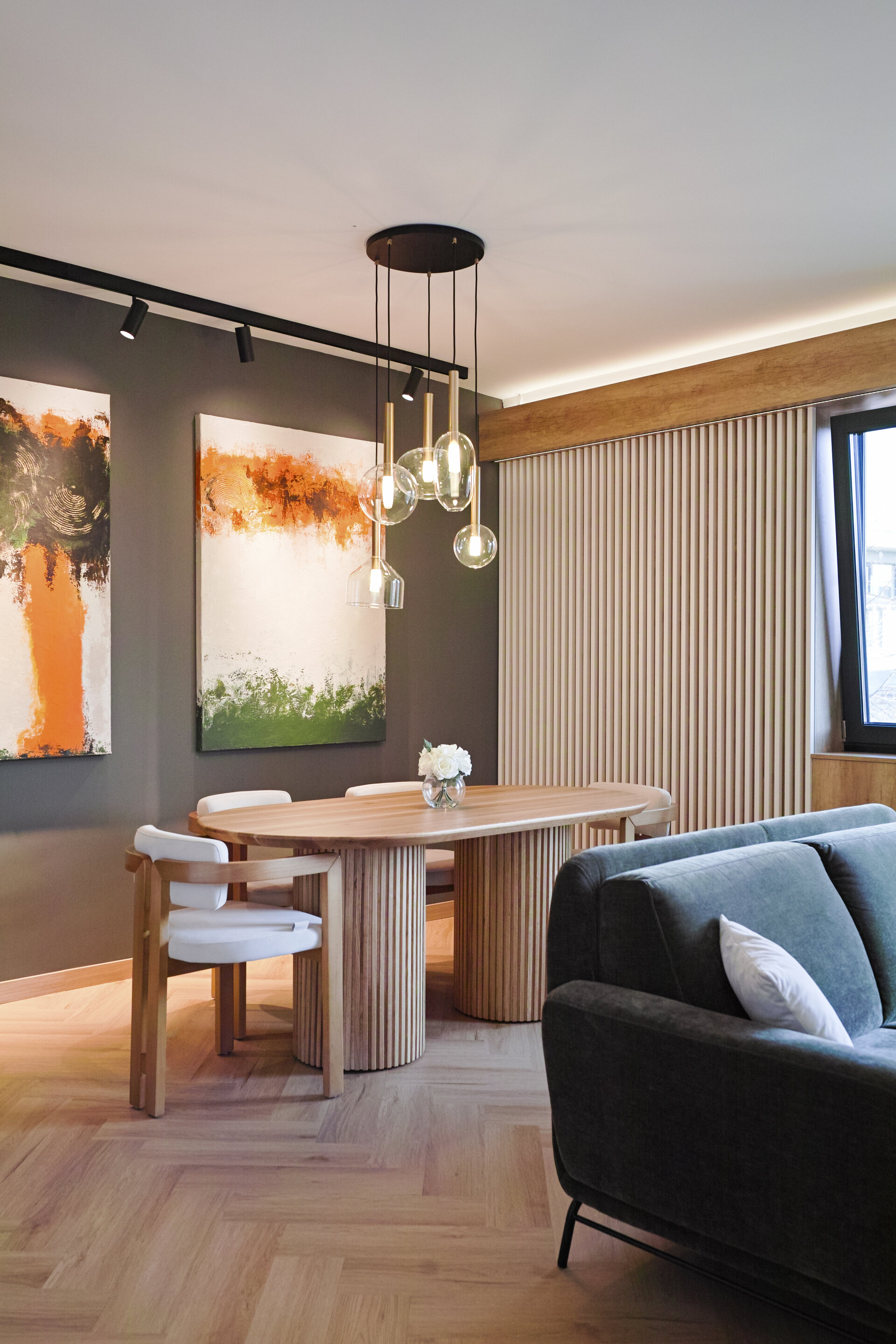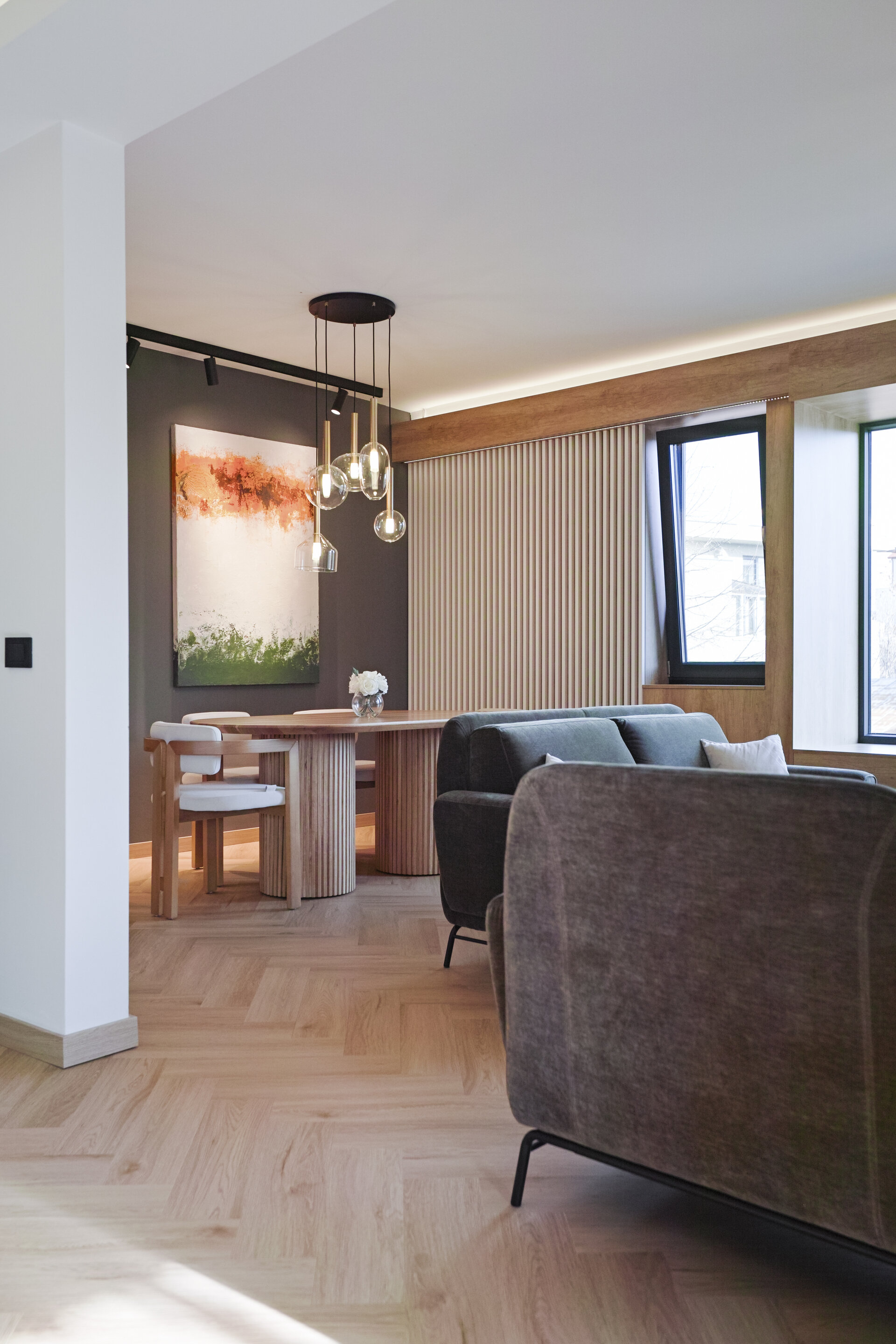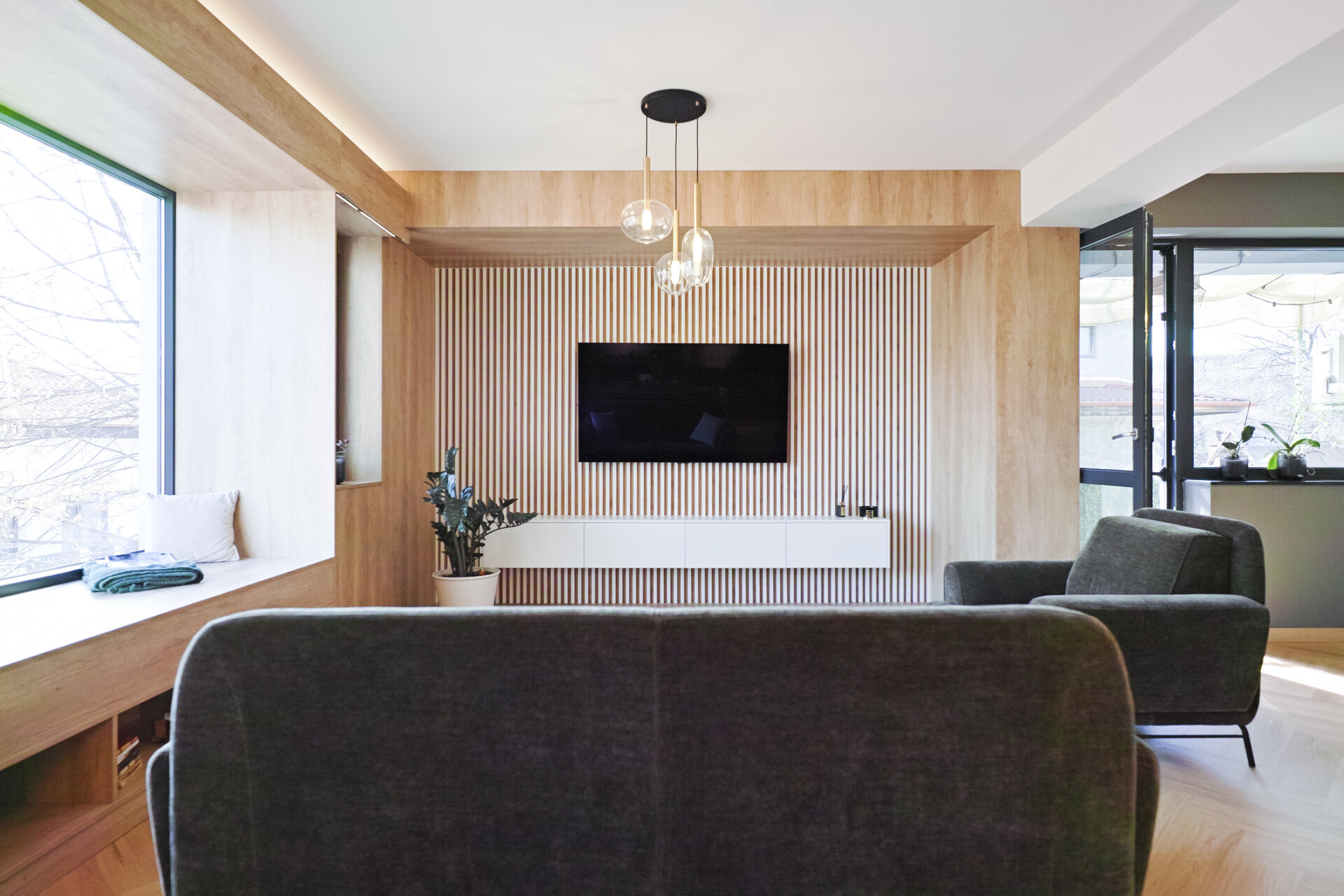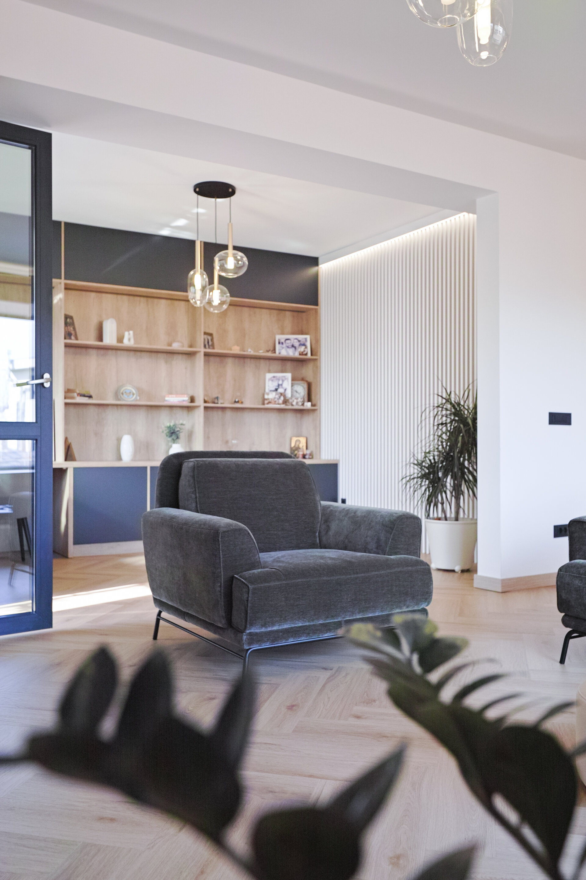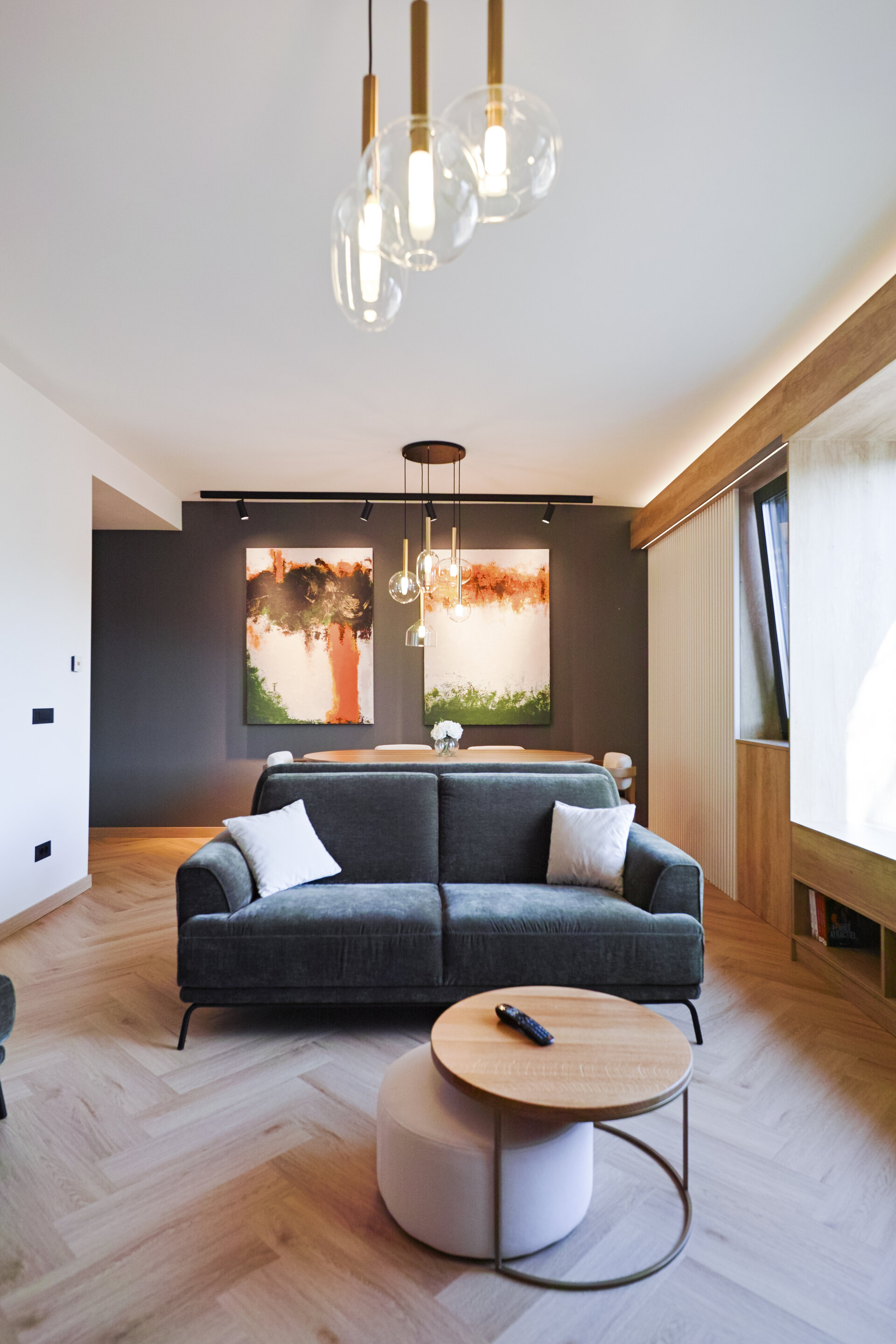 The aim of this project was to redesign the interior of an old 4 room apartment in a beautiful area of Bucharest, Cotroceni, using a contemporary and minimalist style. The project involved designing all the fixed furniture and choosing the materials, textures, finishes, furniture, lighting, art and accessories to create a harmonious and aesthetically pleasing environment. The design process started with a 3d construction of the apartment to better communicate our ideas to the client, we chose the main 2 materials to be wood and white plaster and we played with a few accent colors like pale green and contrasted with dark gray.