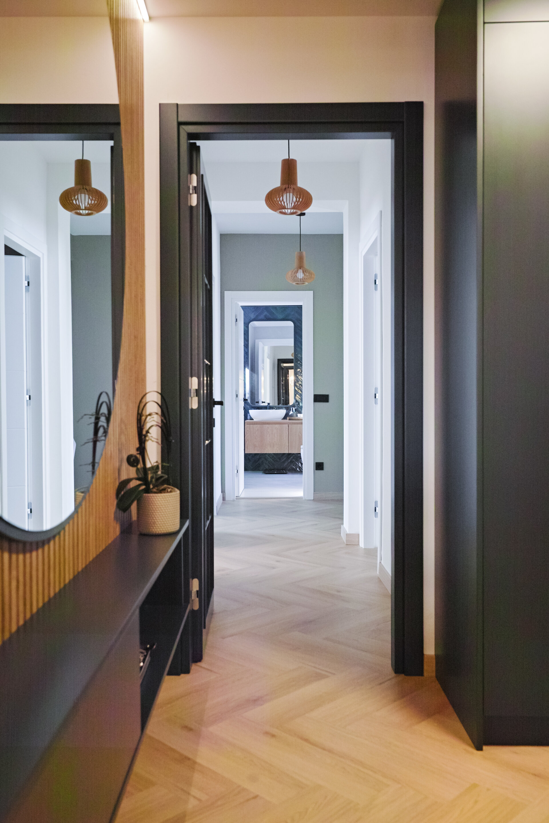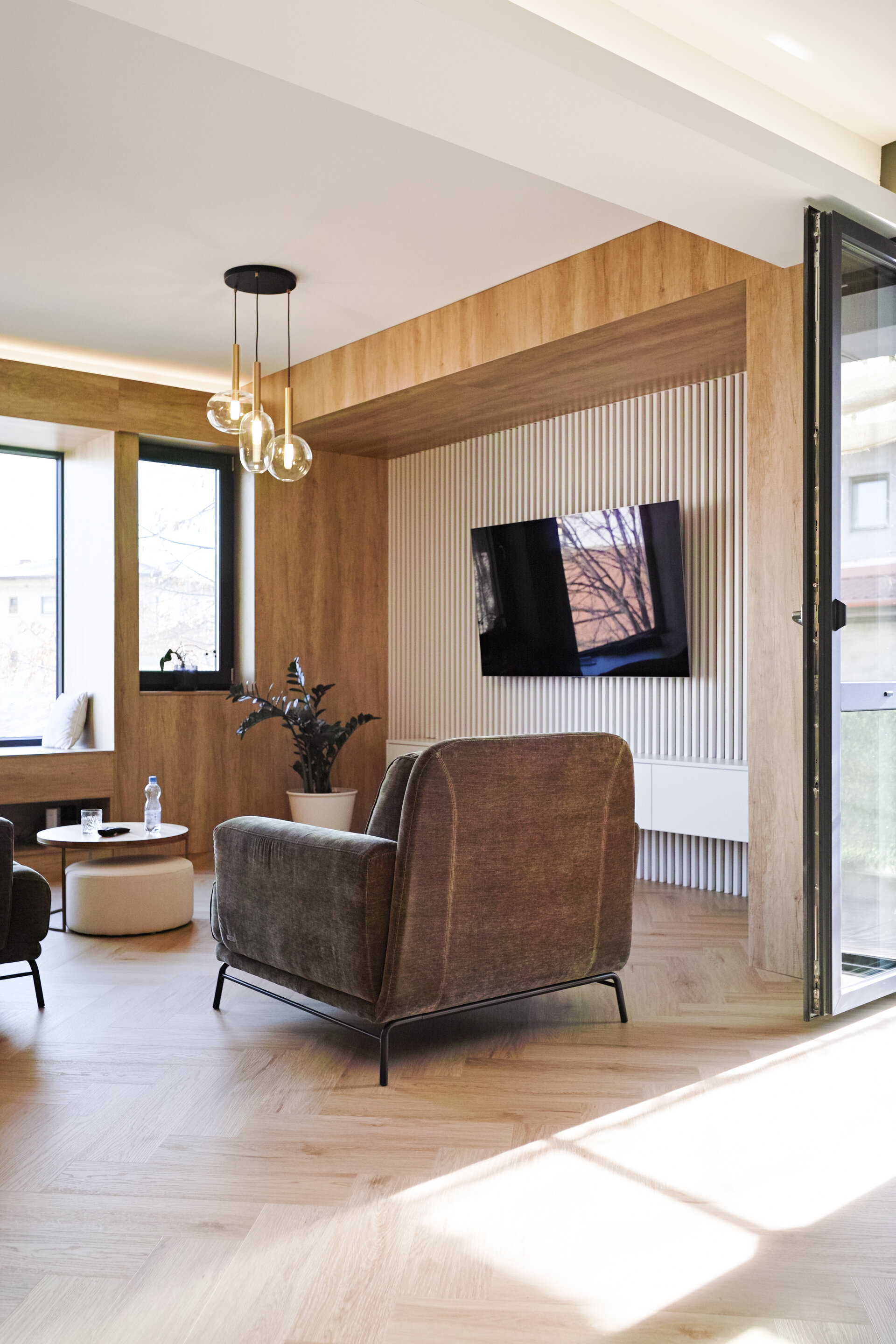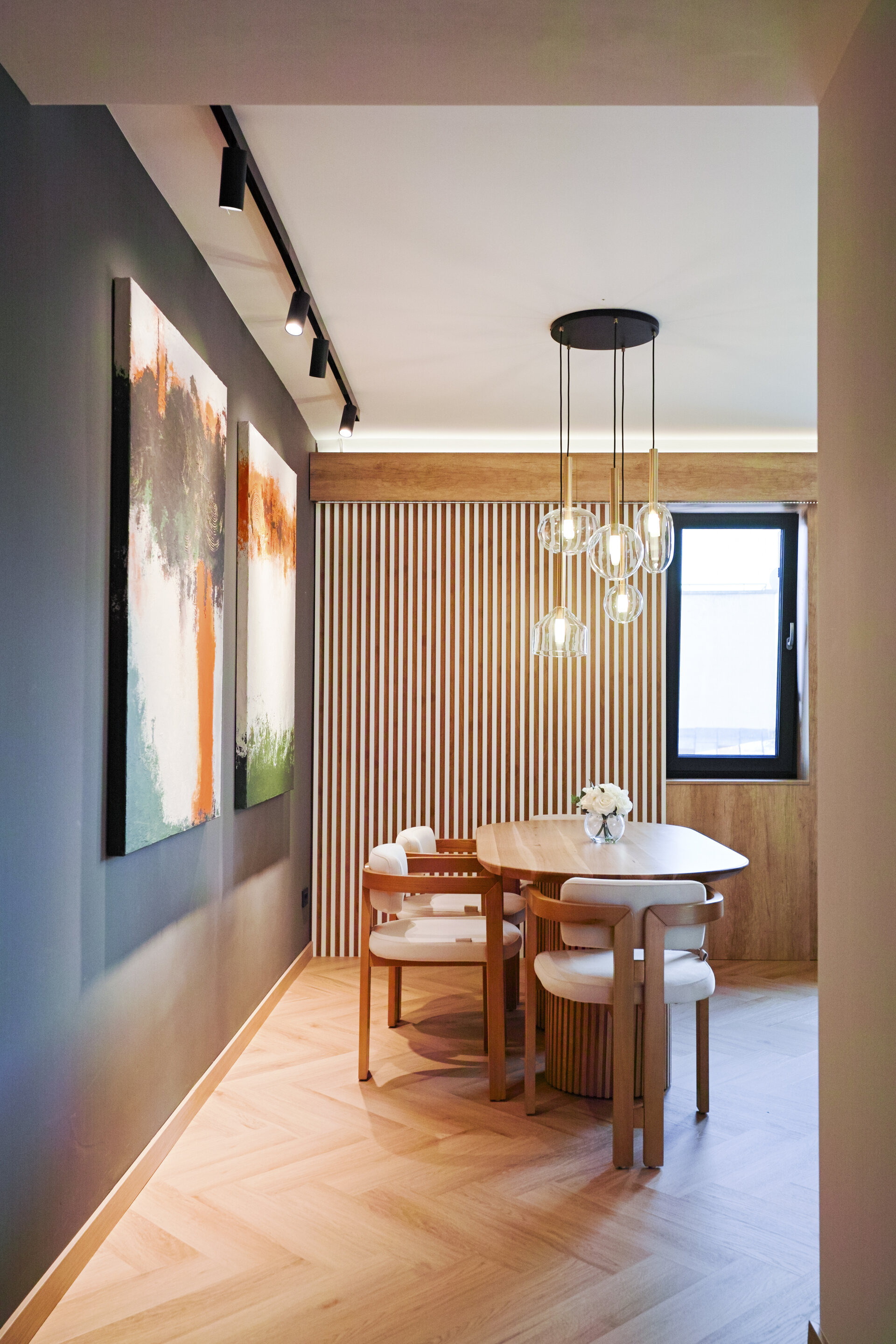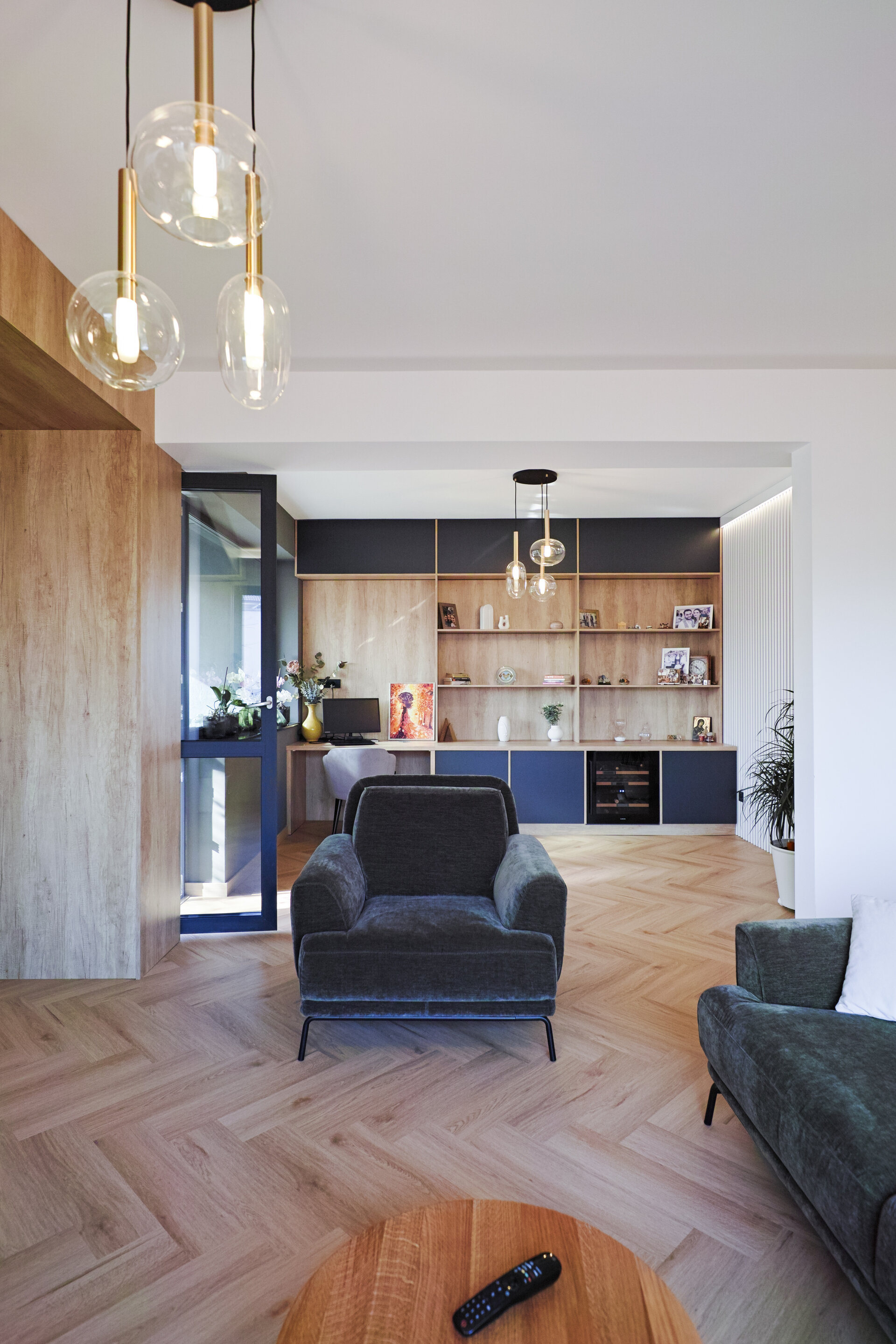 The aim of this project was to redesign the interior of an old 4 room apartment in a beautiful area of Bucharest, Cotroceni, using a contemporary and minimalist style. The project involved designing all the fixed furniture and choosing the materials, textures, finishes, furniture, lighting, art and accessories to create a harmonious and aesthetically pleasing environment. The design process started with a 3d construction of the apartment to better communicate our ideas to the client, we chose the main 2 materials to be wood and white plaster and we played with a few accent colors like pale green and contrasted with dark gray.