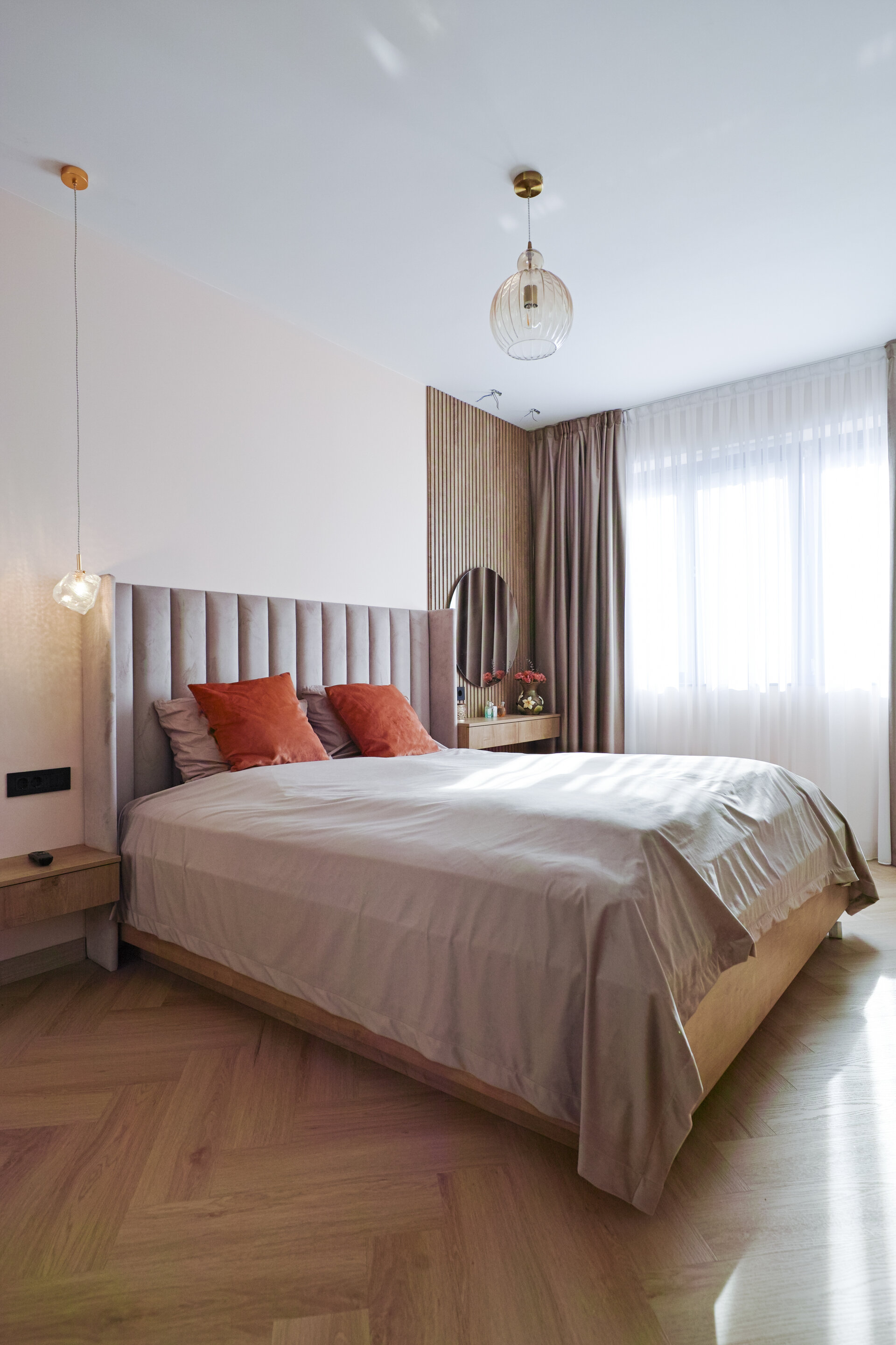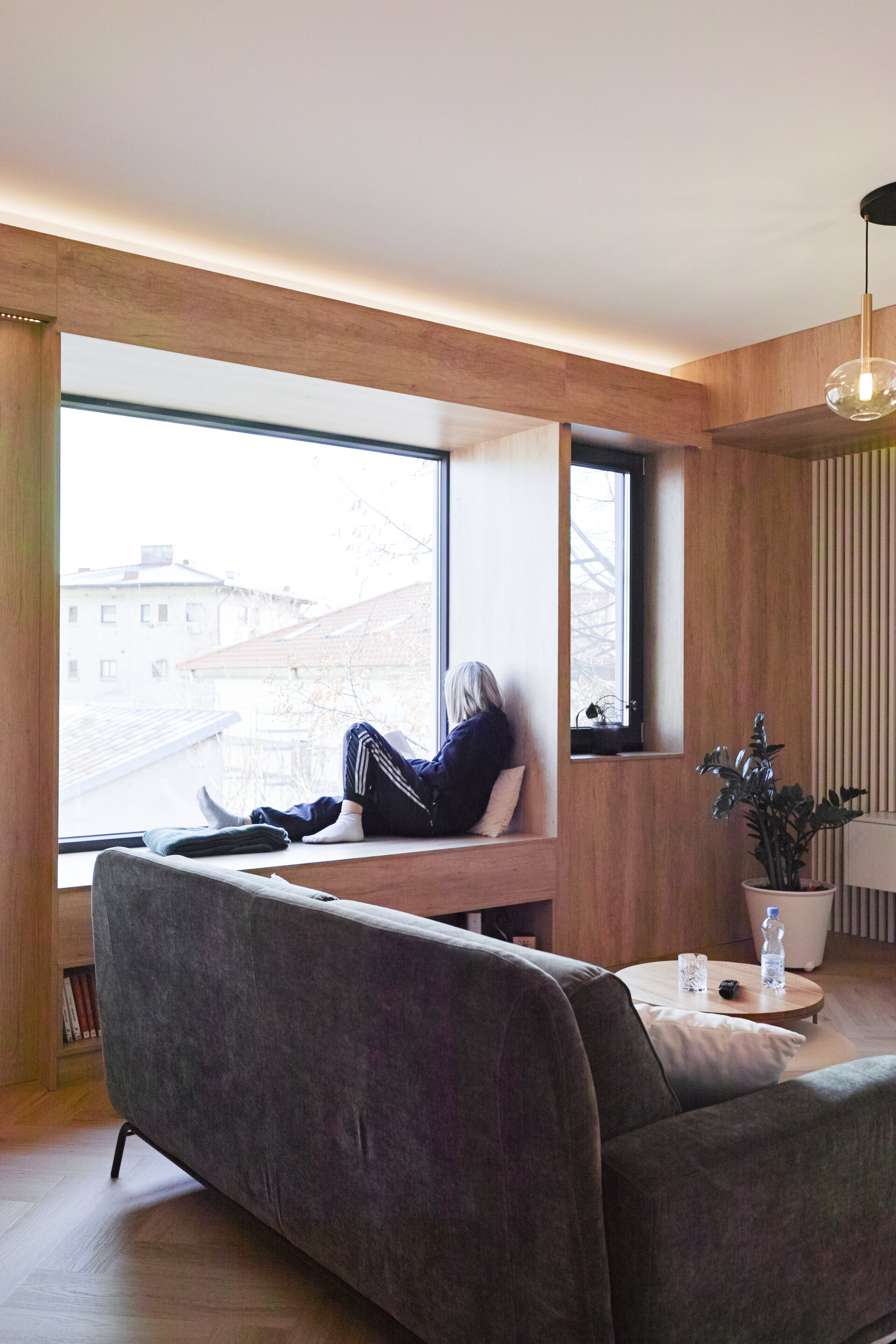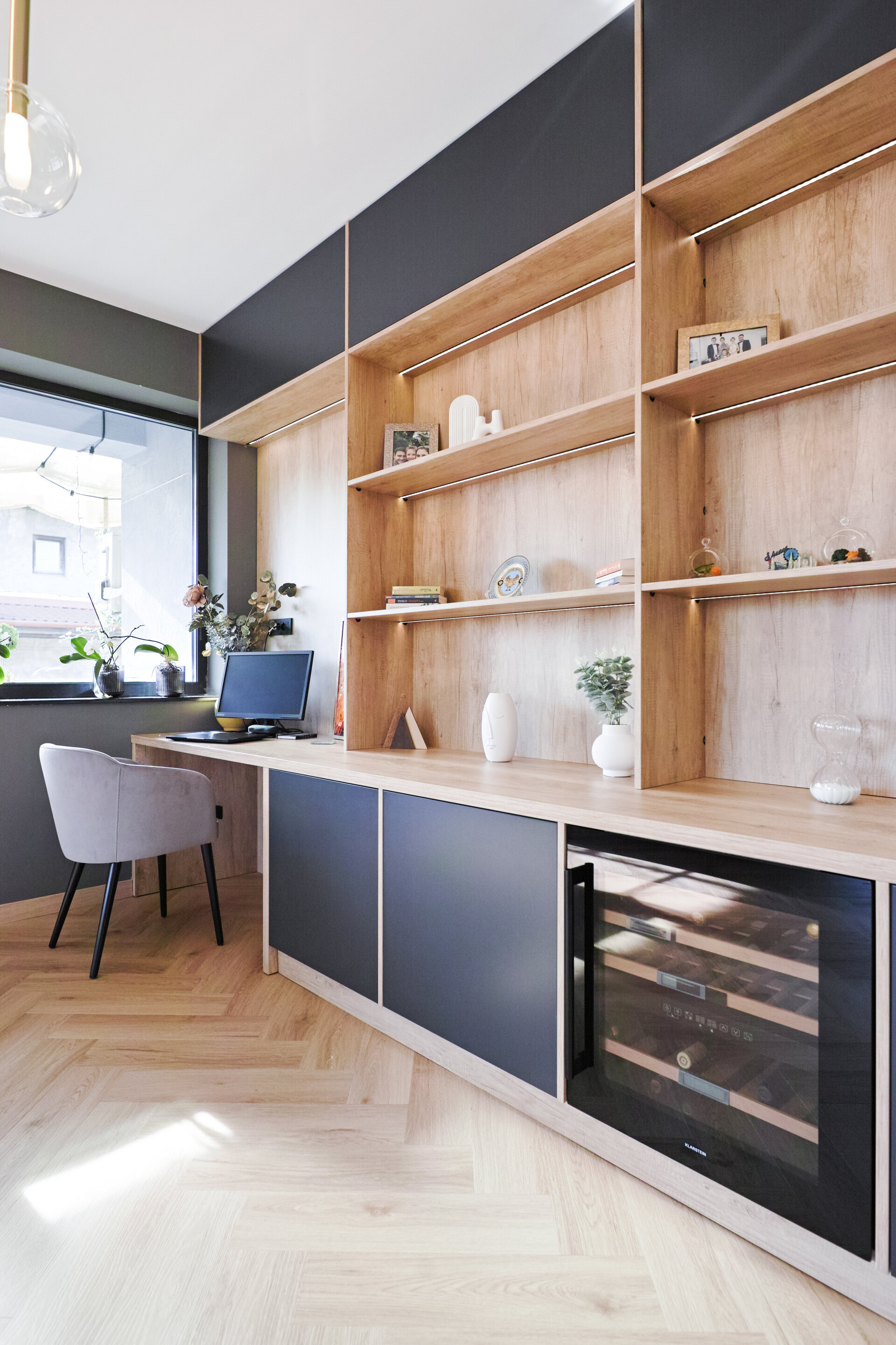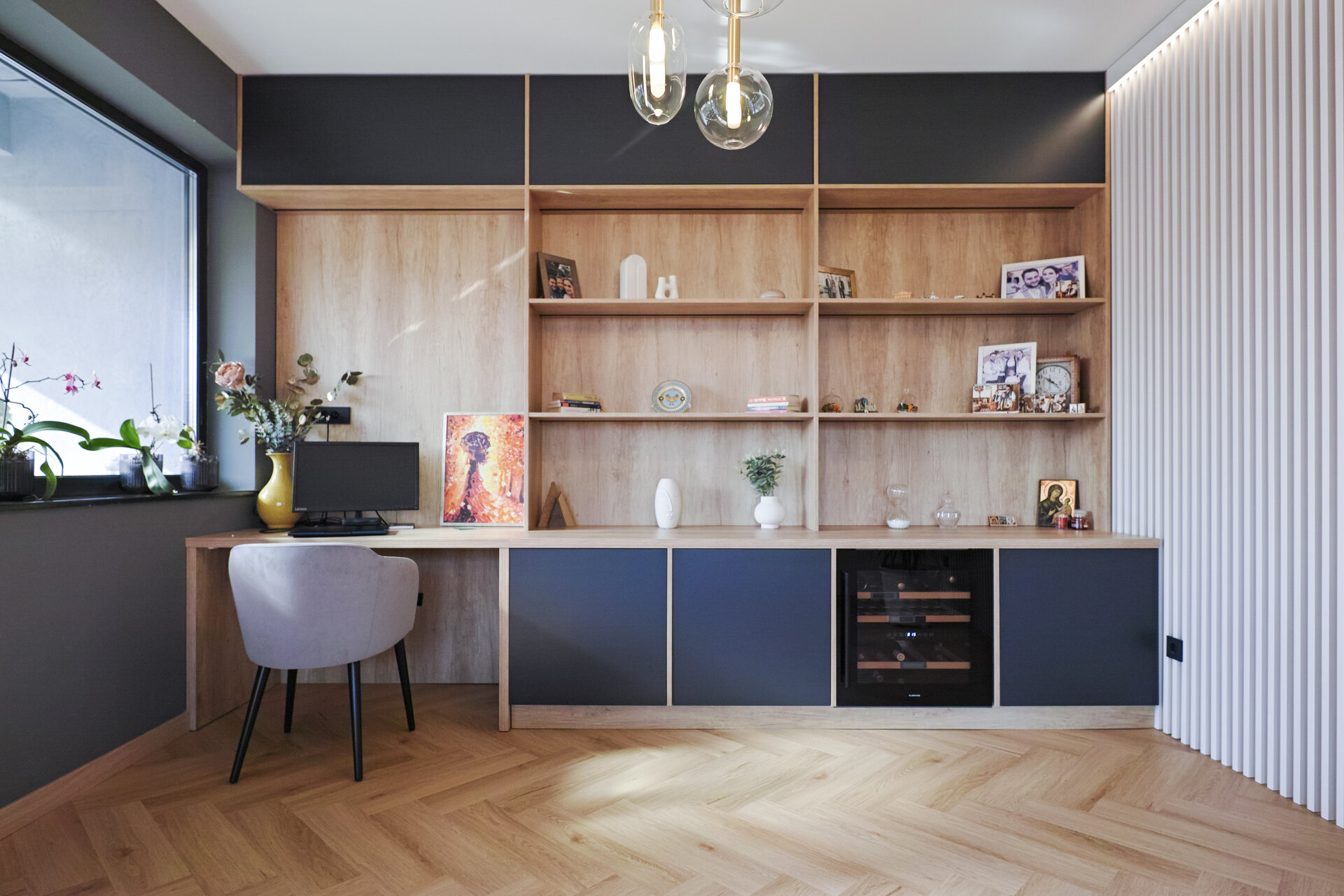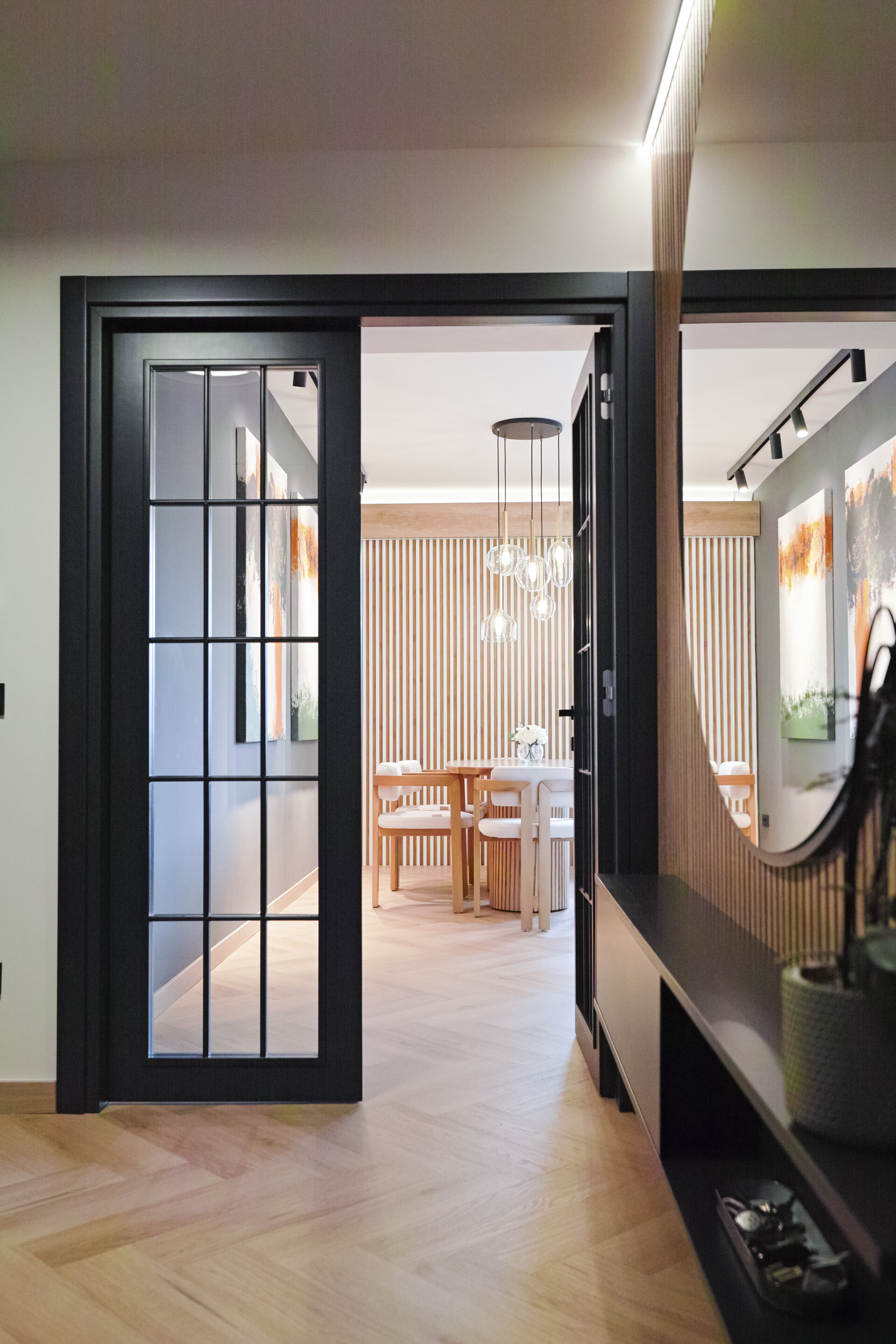The aim of this project was to redesign the interior of an old 4 room apartment in a beautiful area of Bucharest, Cotroceni, using a contemporary and minimalist style. The project involved designing all the fixed furniture and choosing the materials, textures, finishes, furniture, lighting, art and accessories to create a harmonious and aesthetically pleasing environment. The design process started with a 3d construction of the apartment to better communicate our ideas to the client, we chose the main 2 materials to be wood and white plaster and we played with a few accent colors like pale green and contrasted with dark gray.