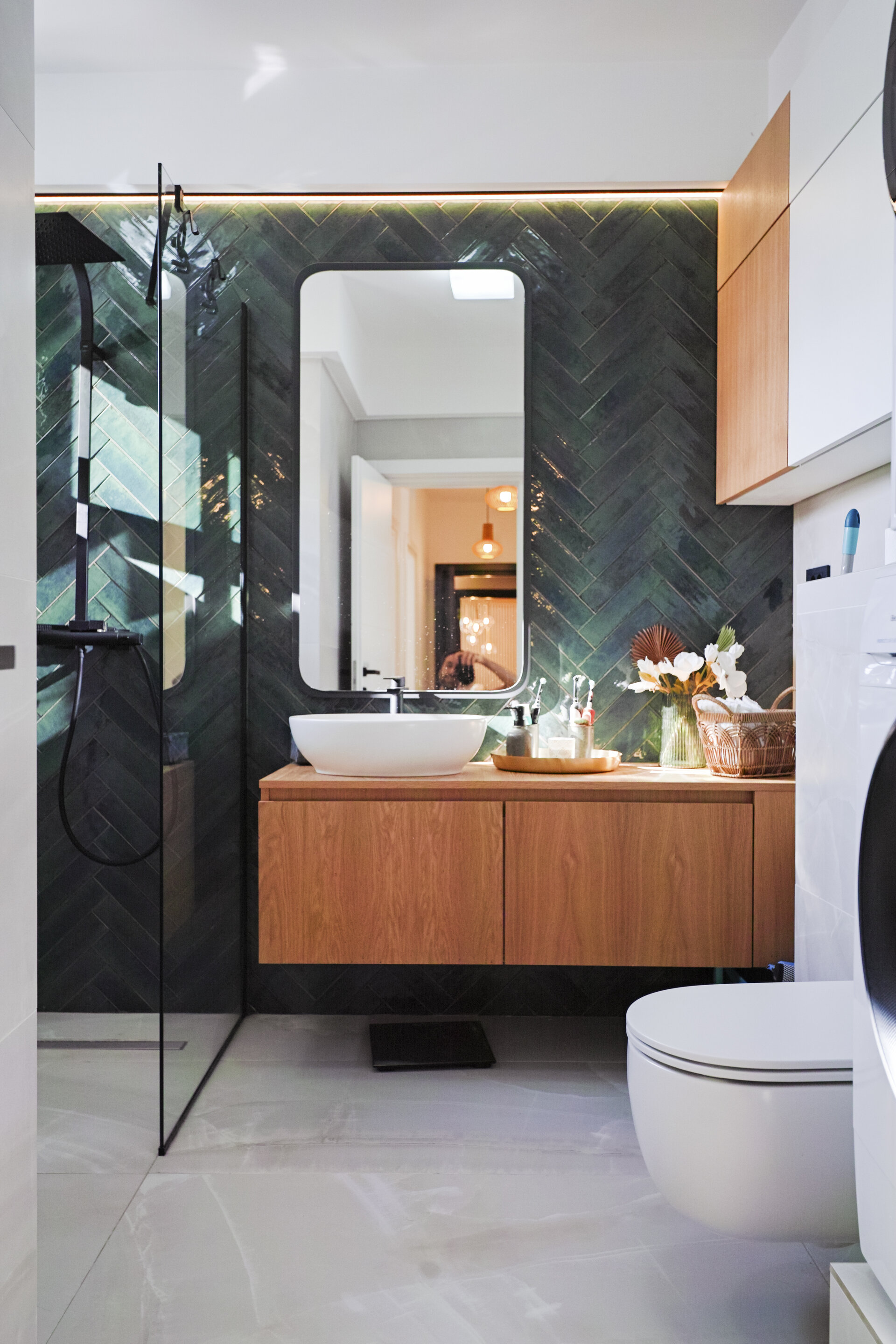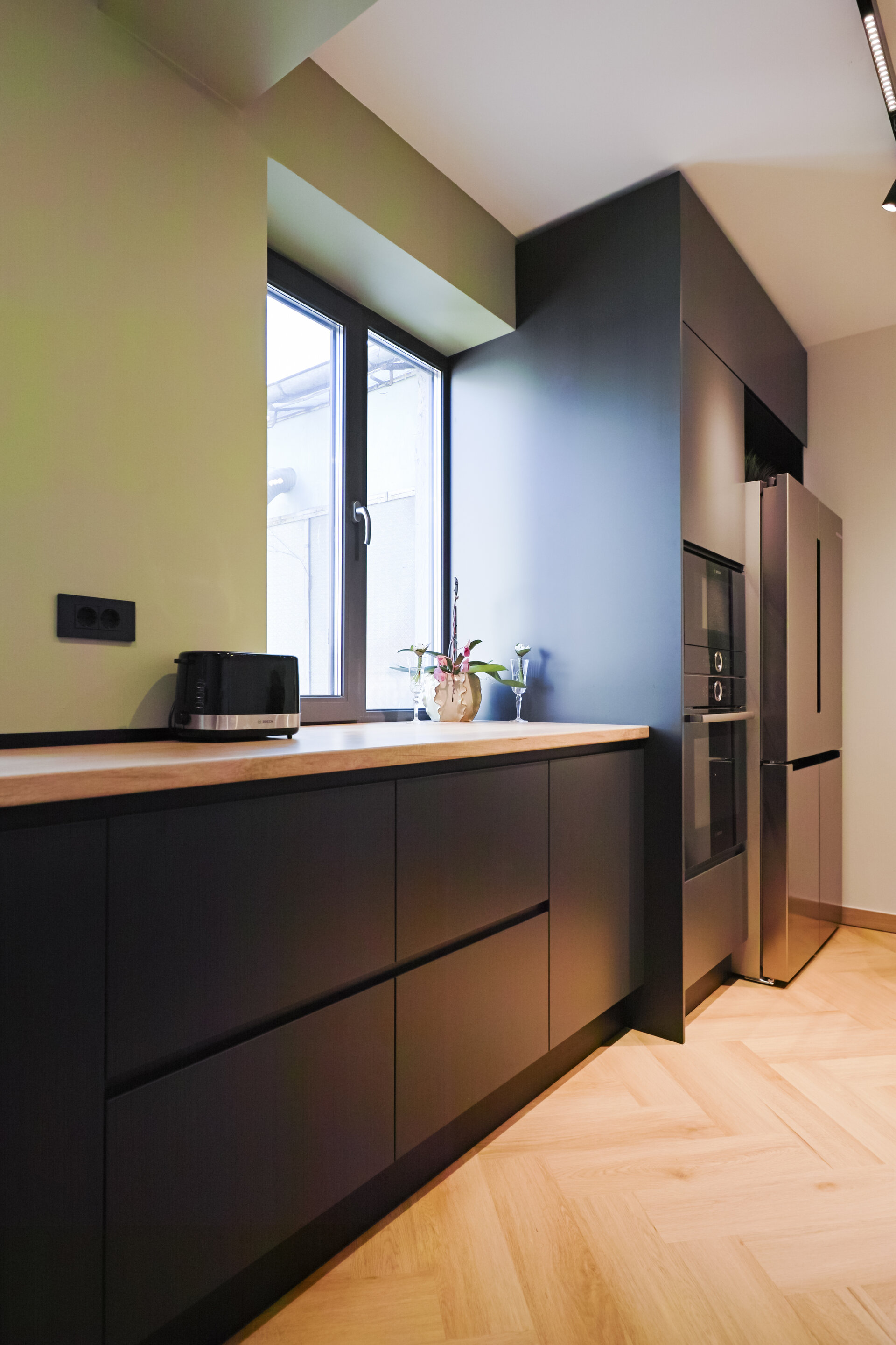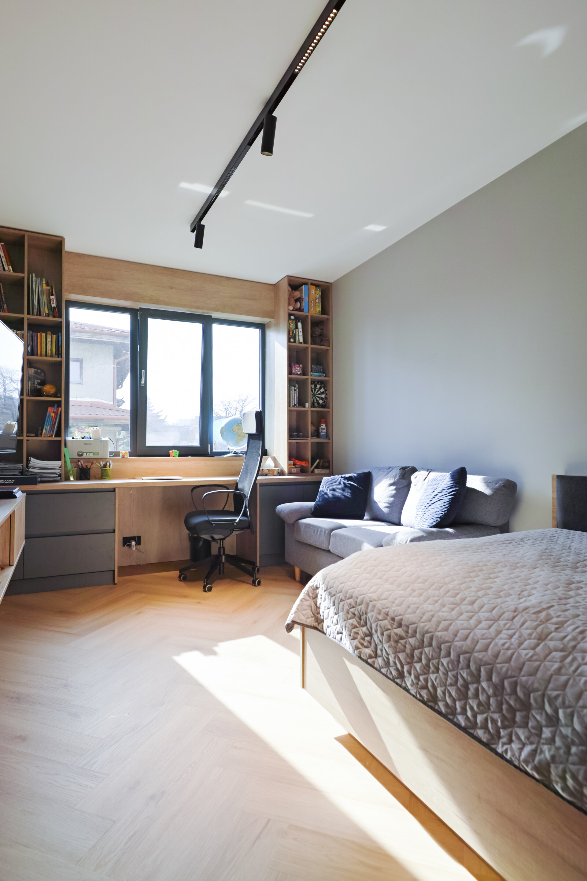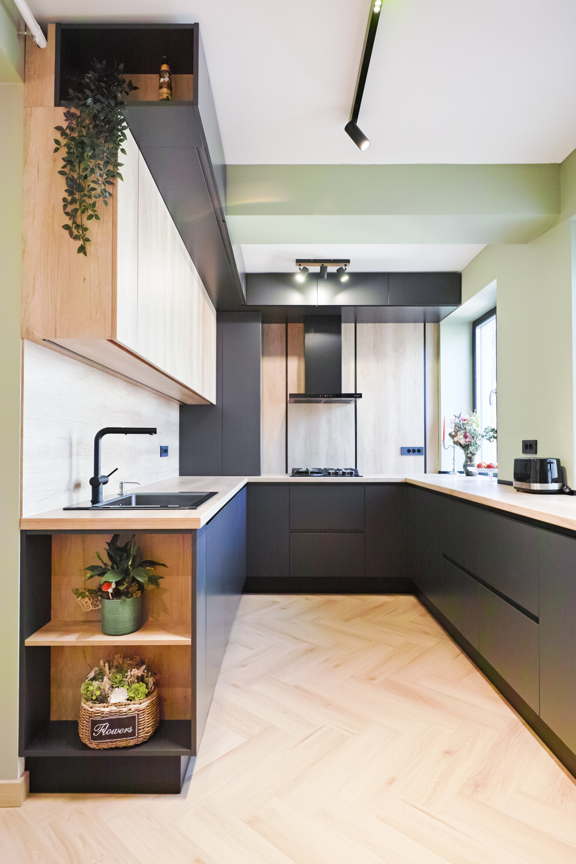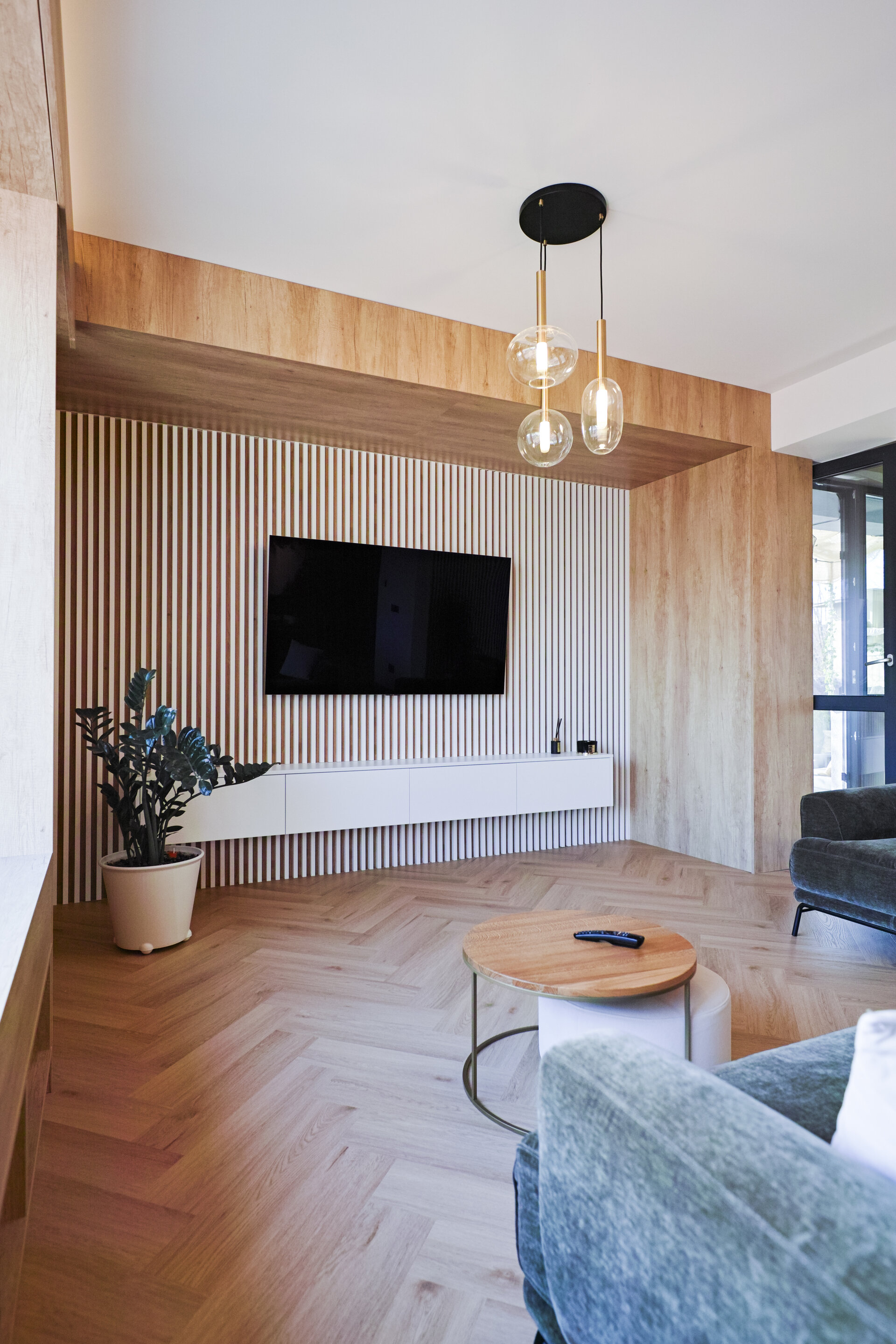 The aim of this project was to redesign the interior of an old 4 room apartment in a beautiful area of Bucharest, Cotroceni, using a contemporary and minimalist style. The project involved designing all the fixed furniture and choosing the materials, textures, finishes, furniture, lighting, art and accessories to create a harmonious and aesthetically pleasing environment. The design process started with a 3d construction of the apartment to better communicate our ideas to the client, we chose the main 2 materials to be wood and white plaster and we played with a few accent colors like pale green and contrasted with dark gray.