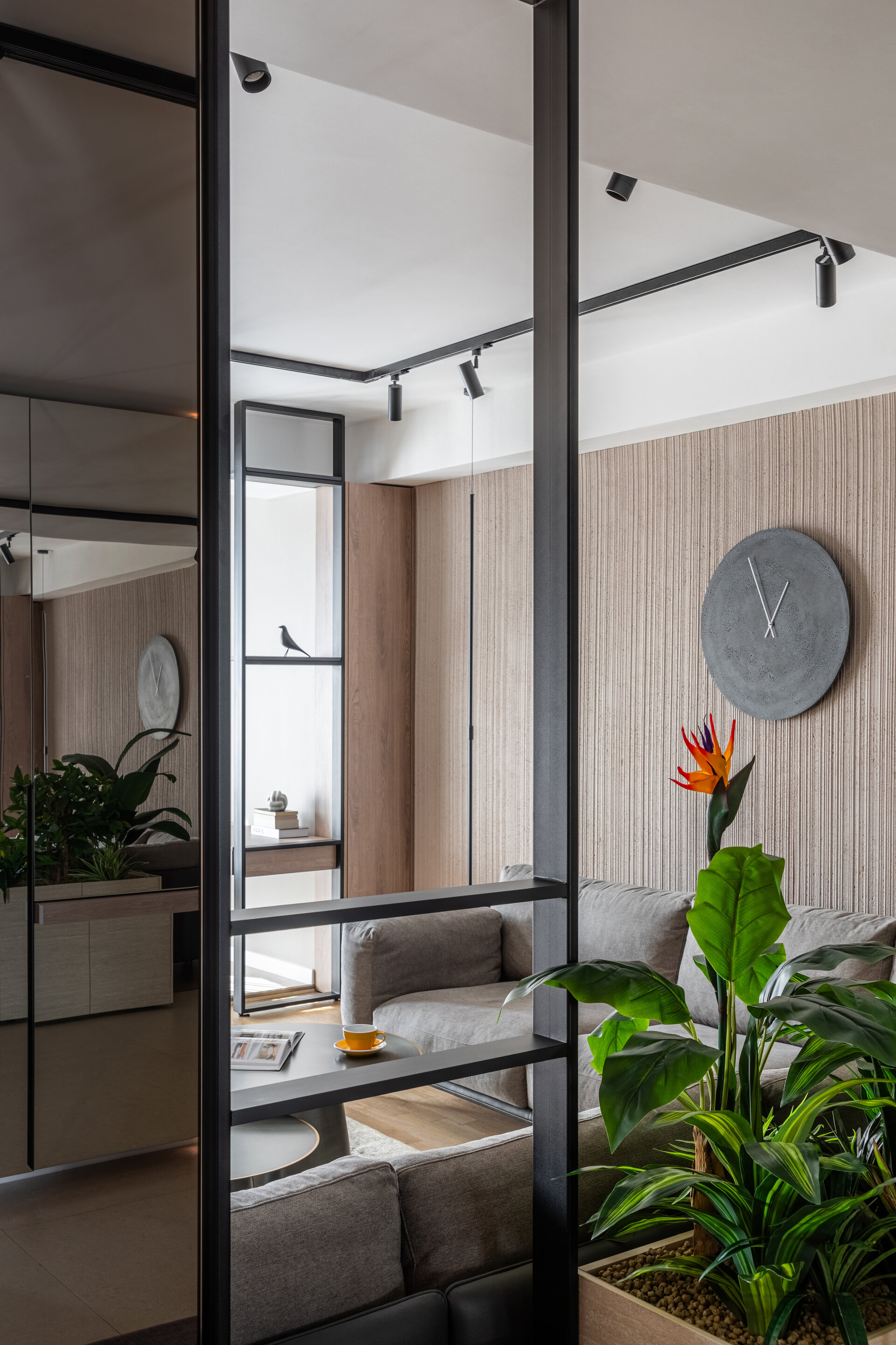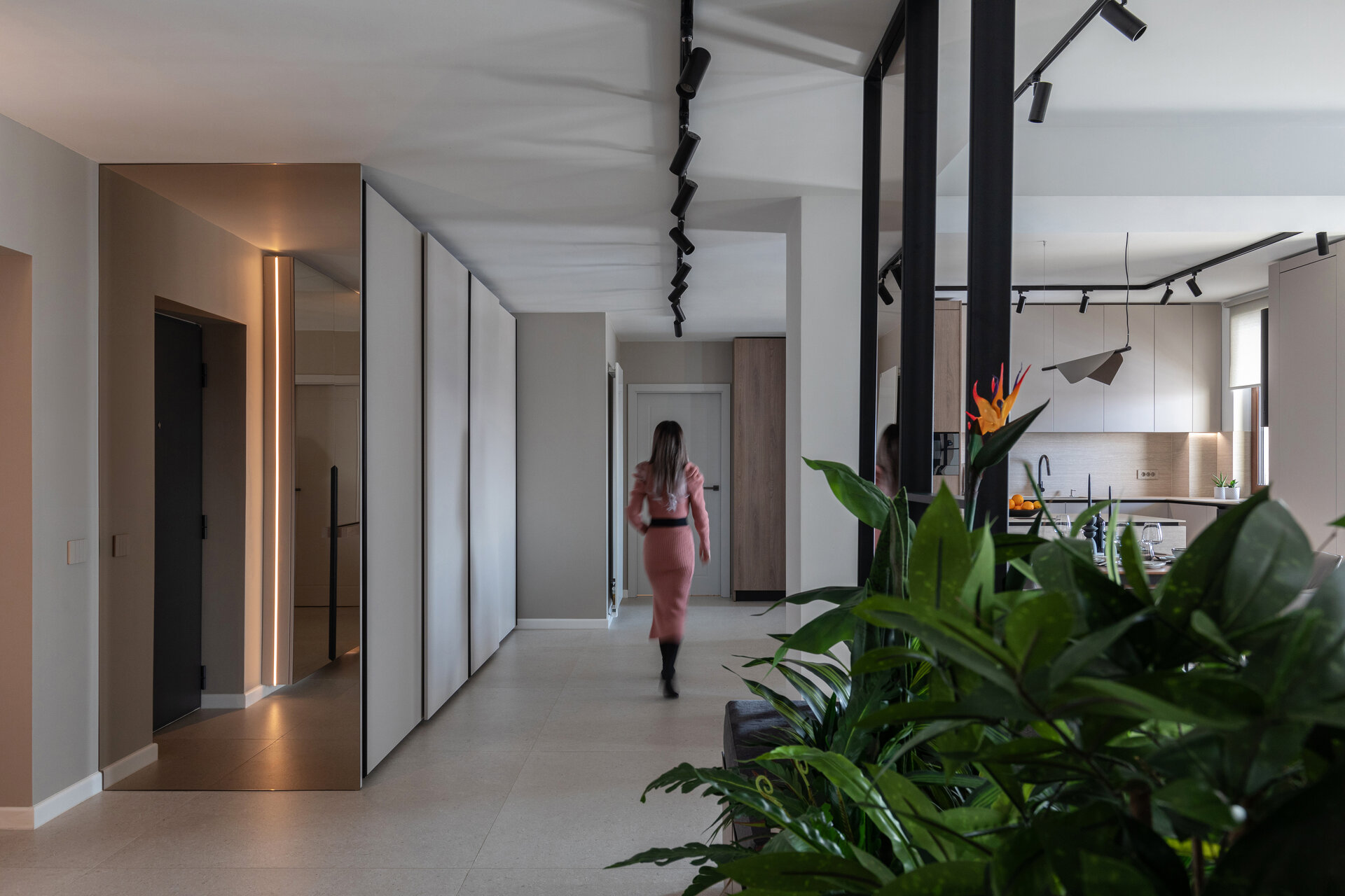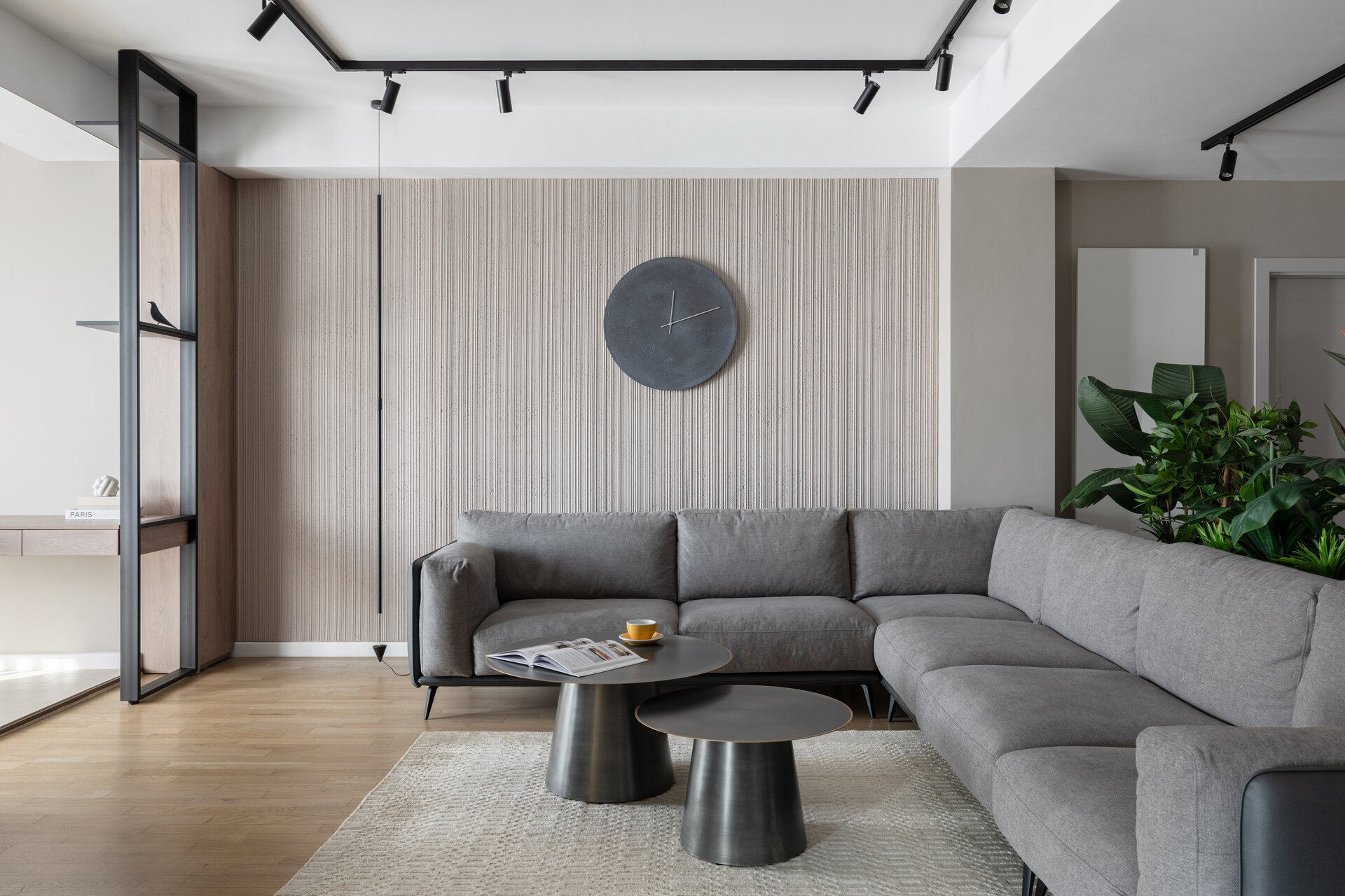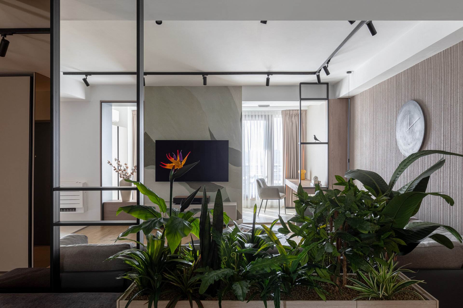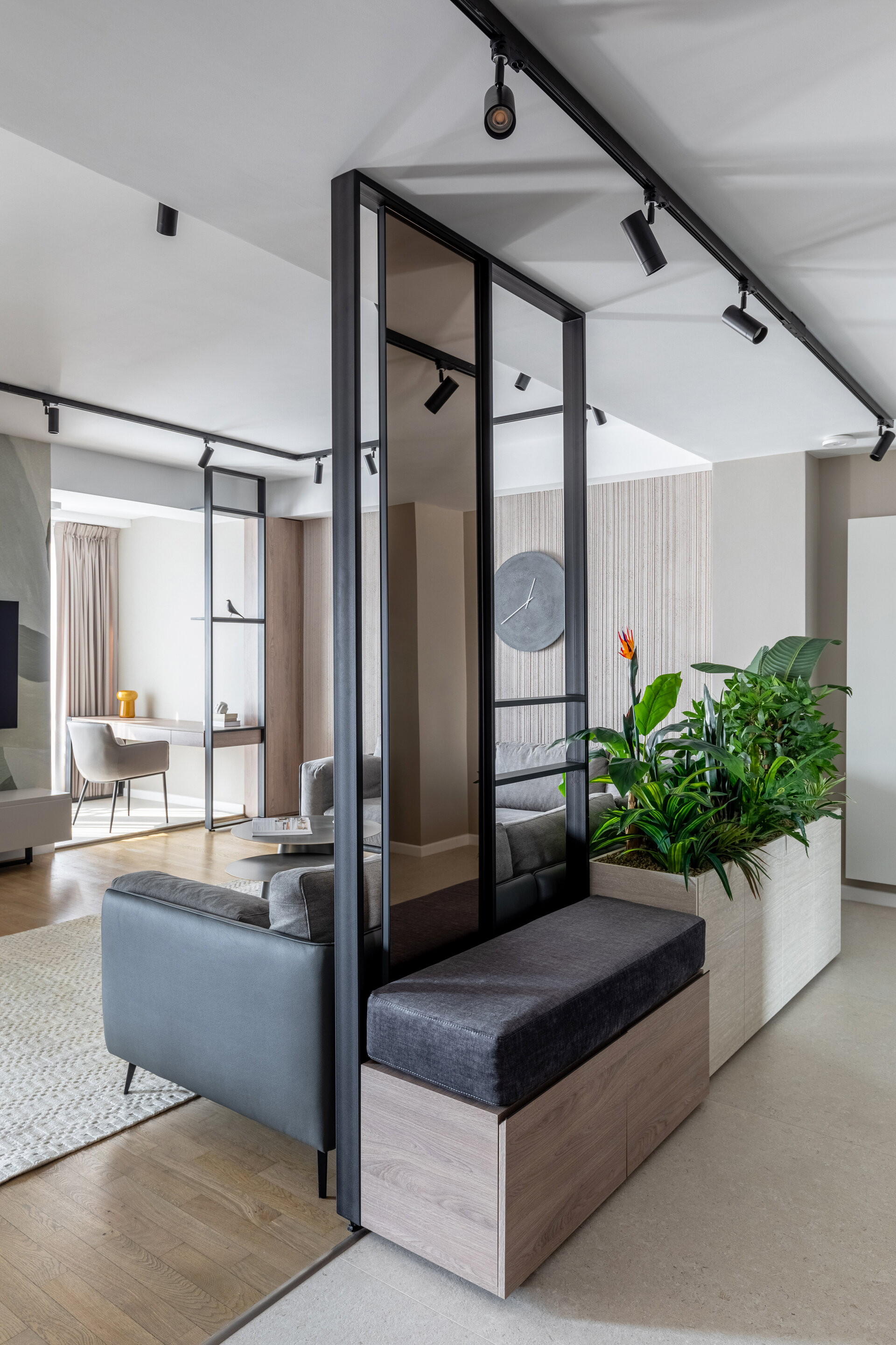The living room is defined by an accent wall with a mineral texture, highlighting the central piece of the space – a large, comfortable sofa. A vibrant indoor garden subtly separates the entrance area from the relaxation zone, adding a distinctive organic element. Minimalist lighting fixtures create a play of light and shadow, giving depth and warmth to the environment.