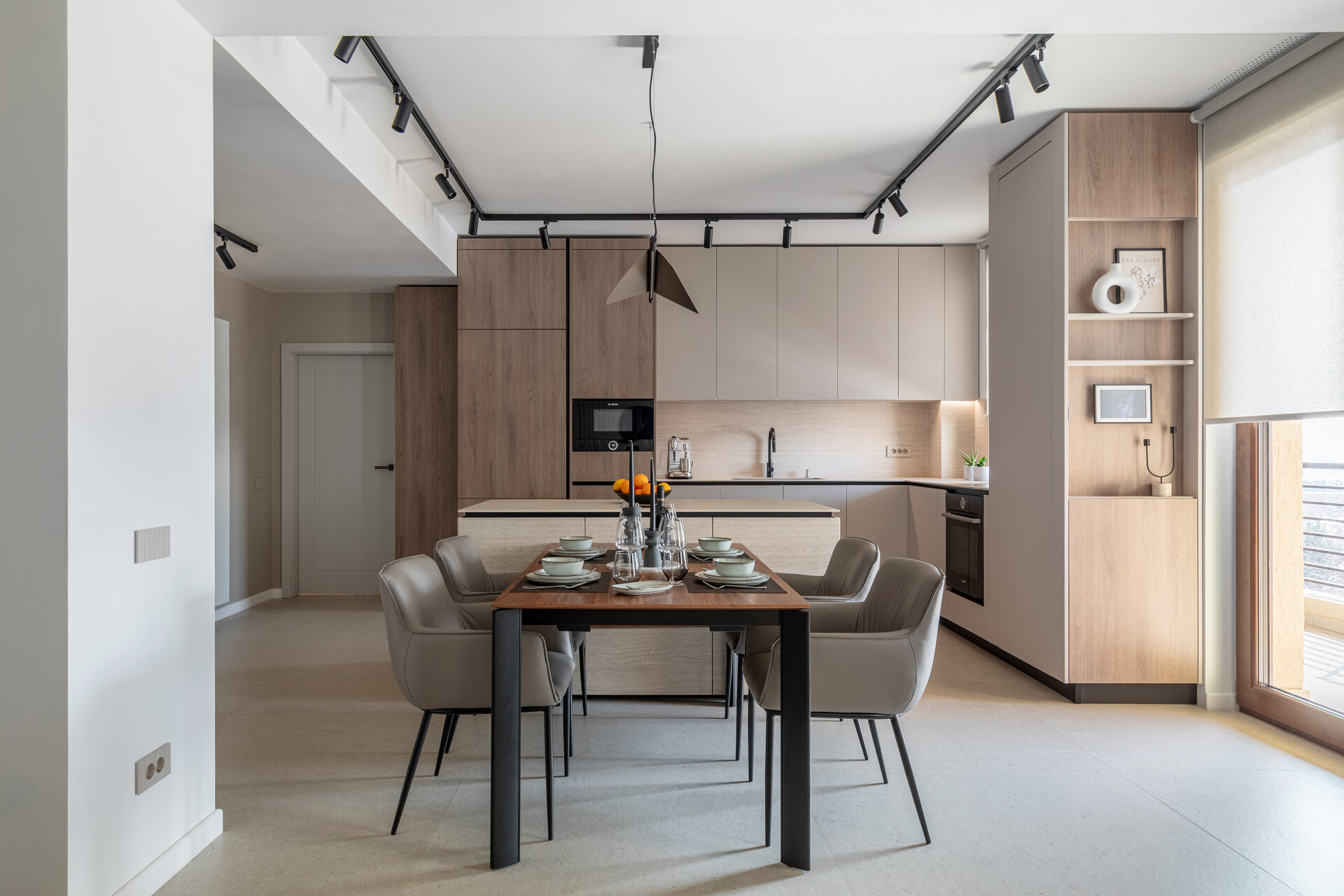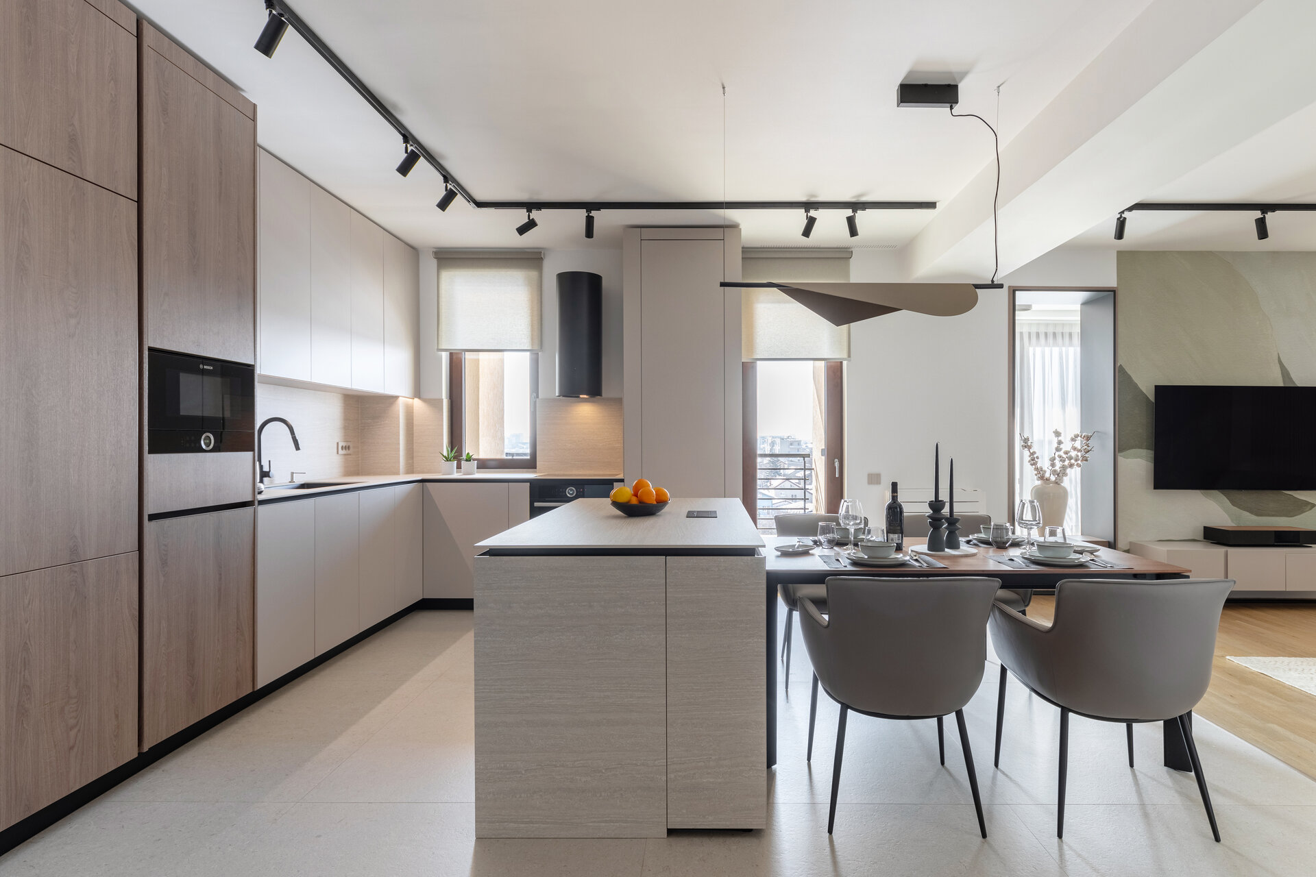 The dining and kitchen areas flow seamlessly, offering a sophisticated and functional setting. An elegant veneer table, accompanied by sculptural chairs, is complemented by an asymmetrical pendant light that brings an artistic flair. The central island serves not only as a generous workspace but also as the perfect spot for social interaction.
