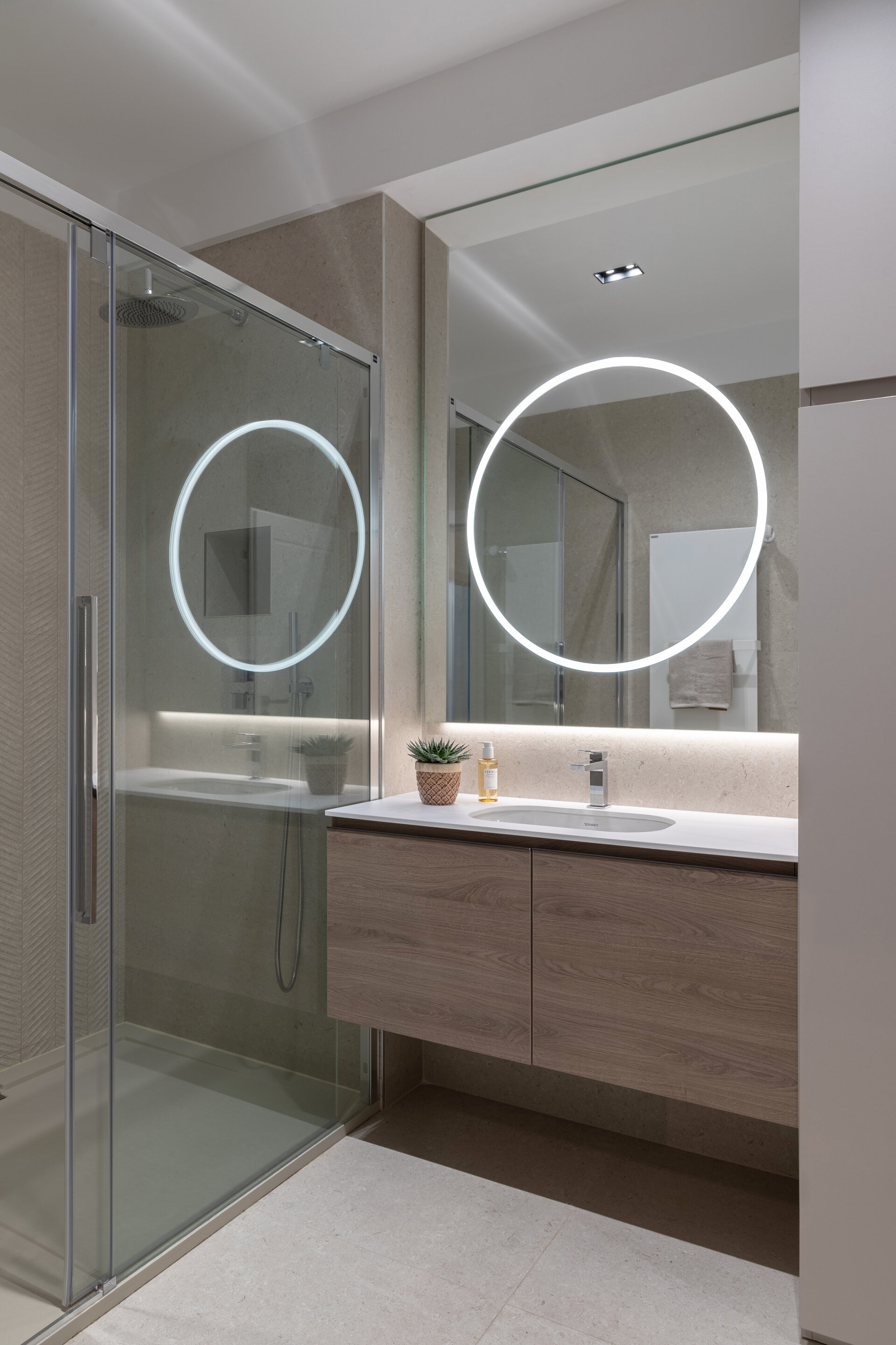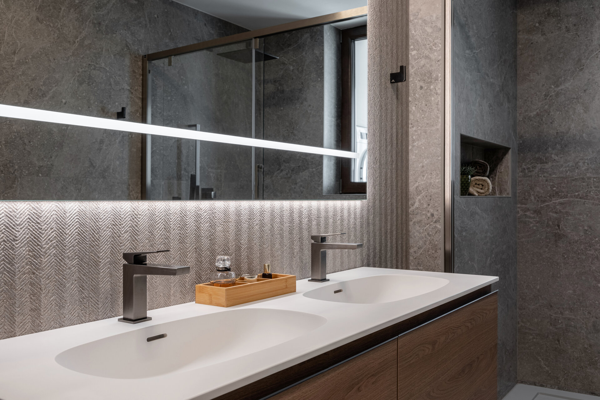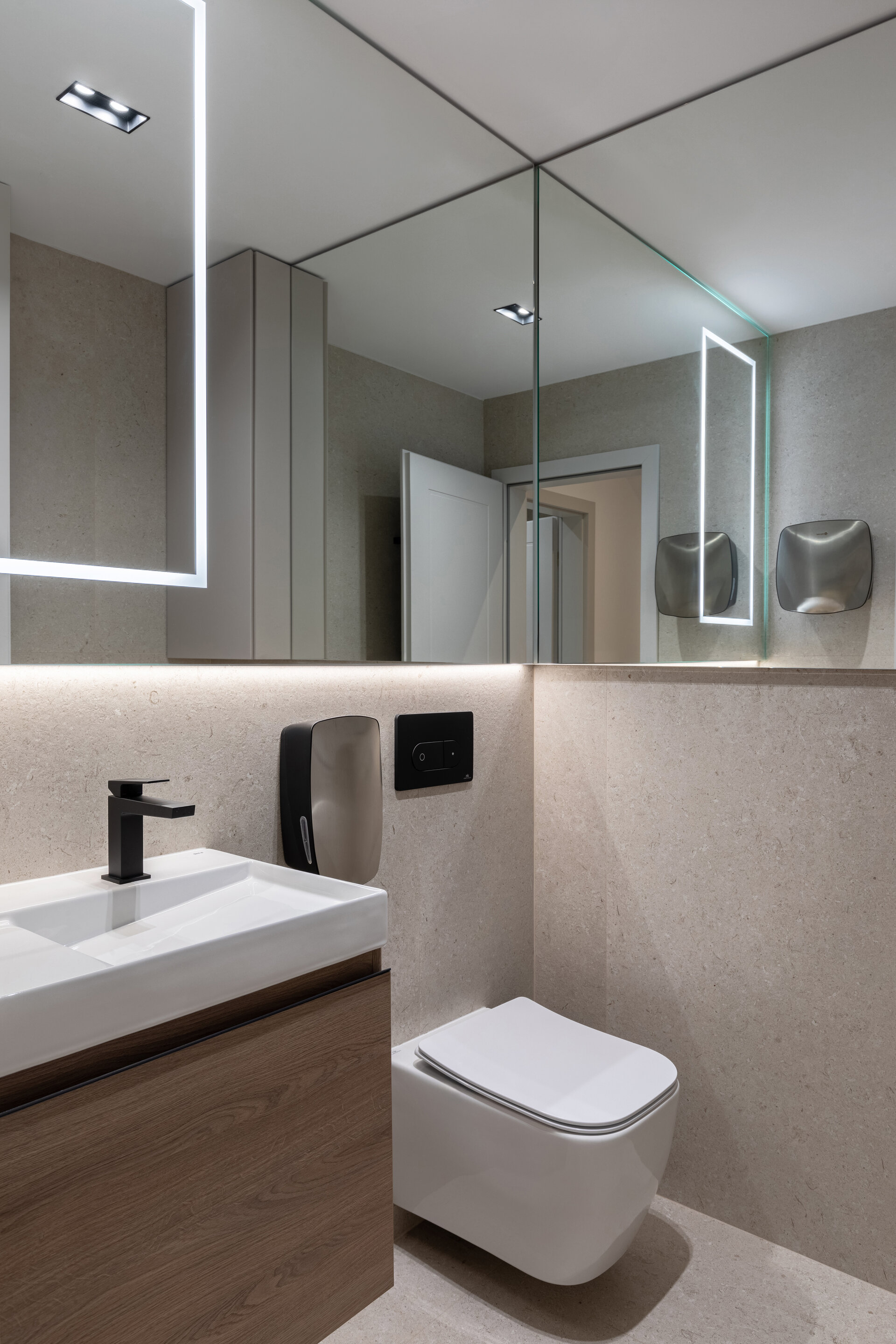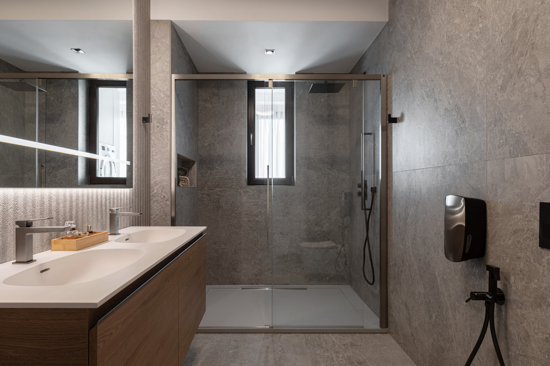 The bathrooms combine large, finely textured ceramic tiles with matte surfaces and subtle metallic accents, creating a boutique spa aesthetic. Ambient lighting and refined finishes elevate every detail into a moment of true relaxation.