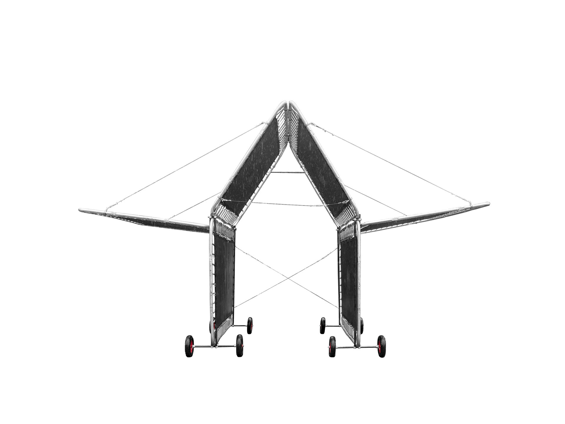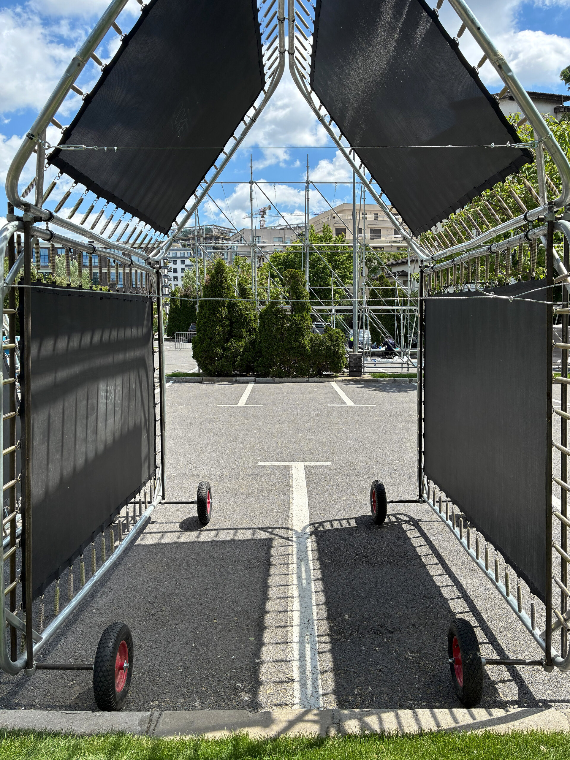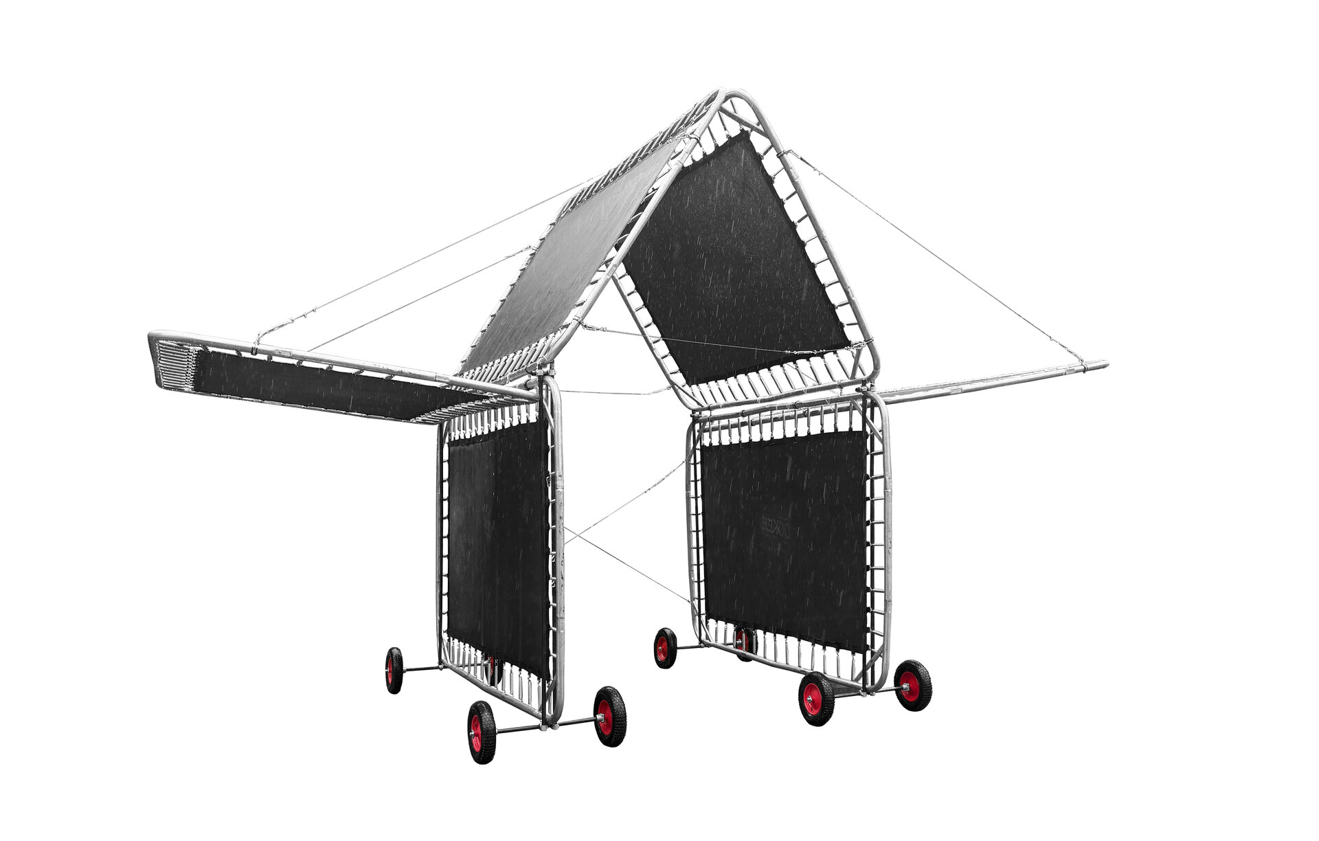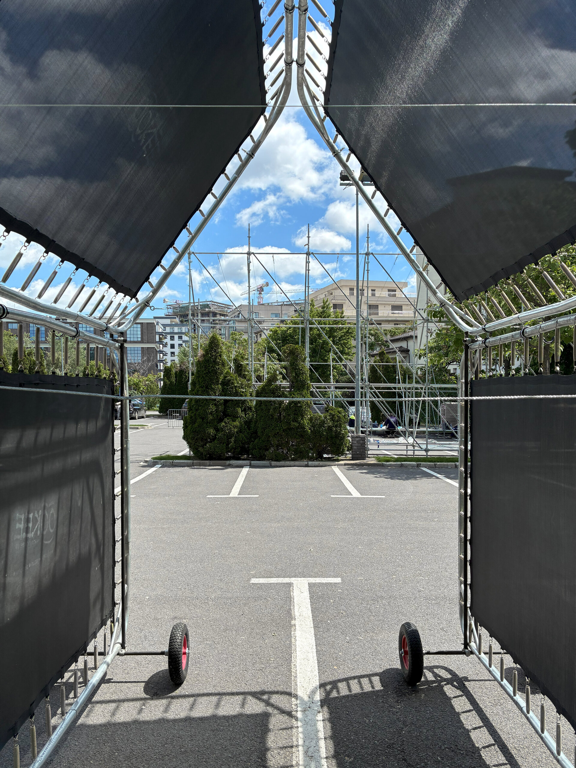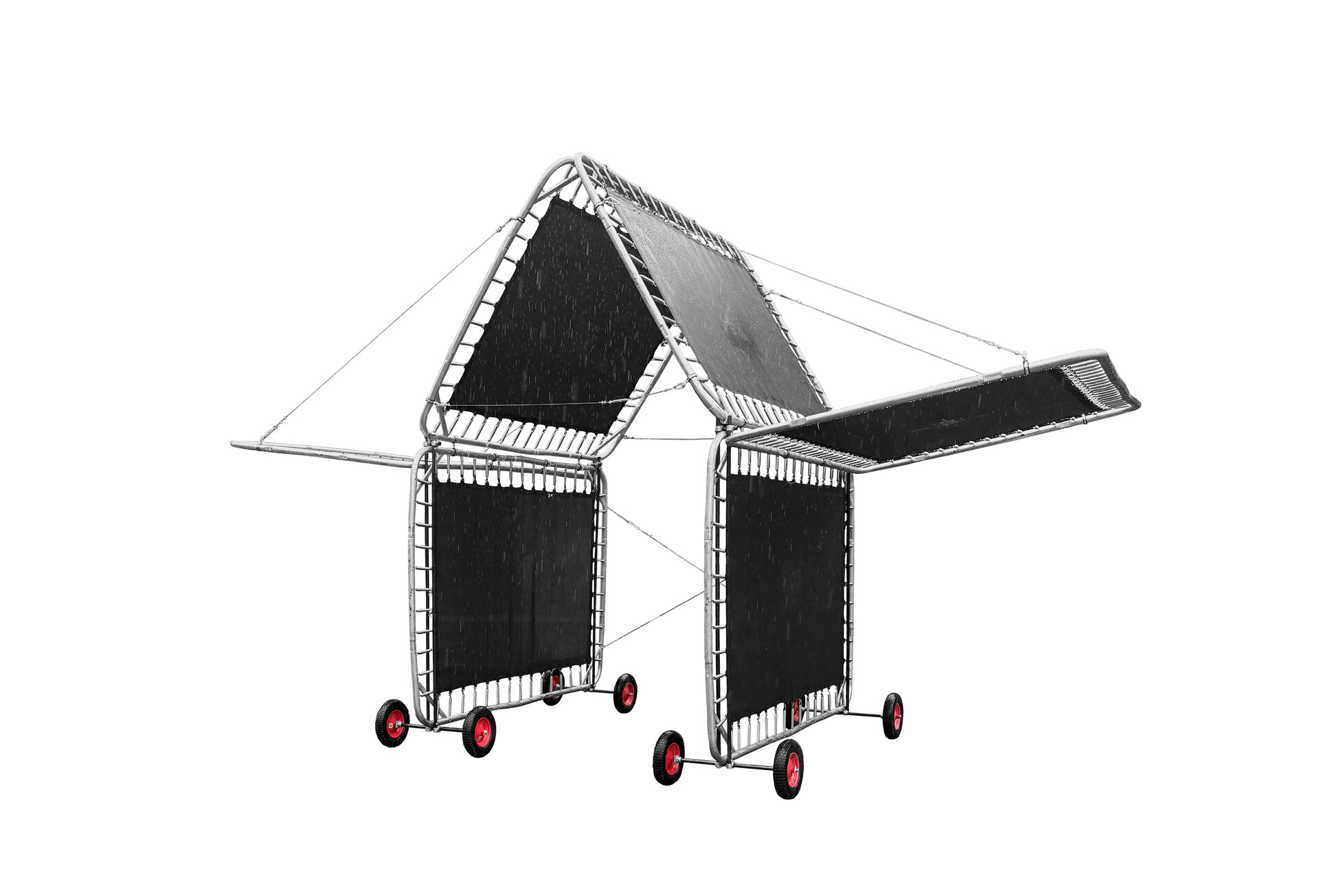 Modular assembly. Vertical trampolines. Translucent walls and elastic sunshades.