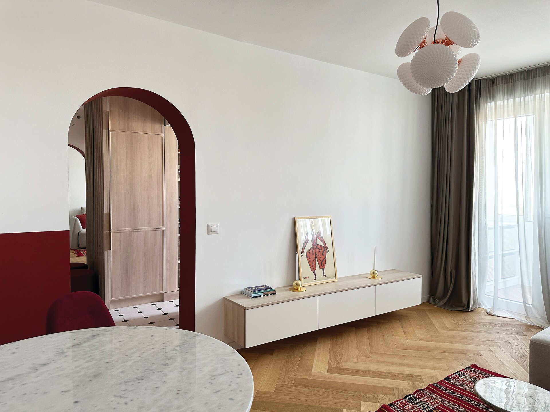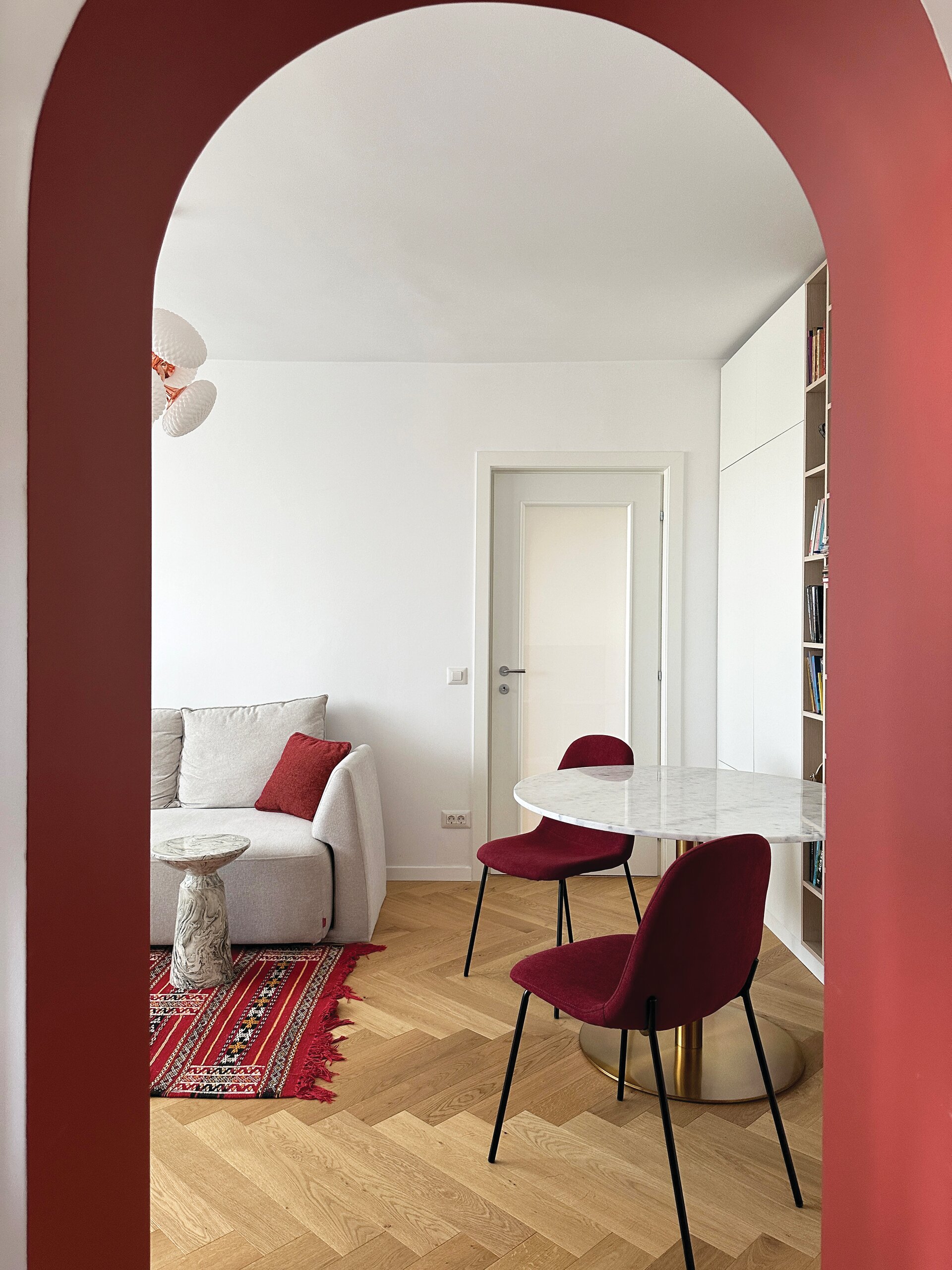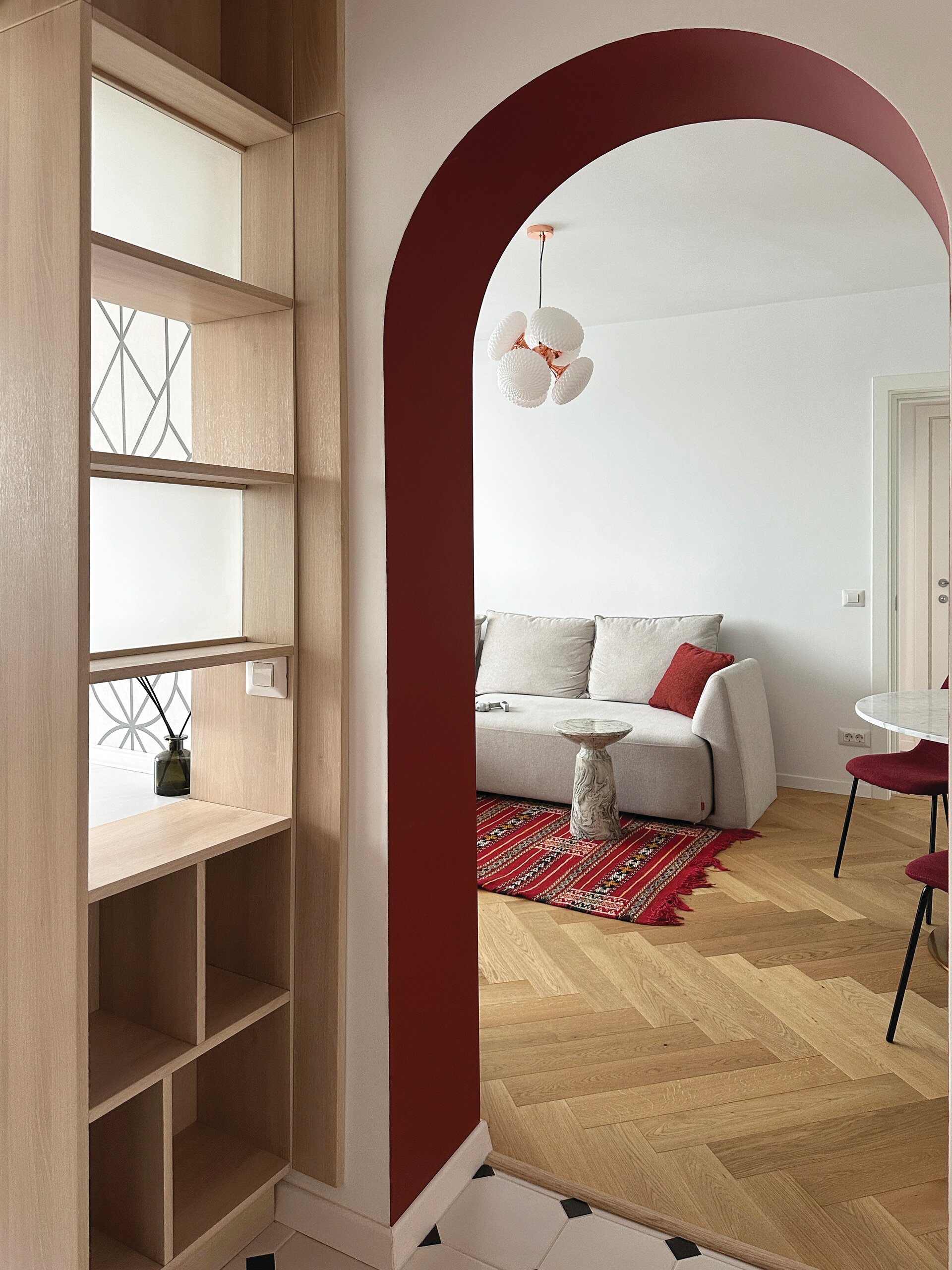 This communist-era apartment was completely renovated from scratch, allowing us to expand the kitchen area into the entrance hallway, primarily by creating a direct connection between the hallway and the kitchen, which made it possible to relocate the built-in fridge into the hallway. All original finishes were replaced, along with the electrical system. The design blends minimalist elements with strong accents of color and texture. Brick-red accents add depth and warmth to the space, while the herringbone parquet flooring contributes to an elegant and natural atmosphere.