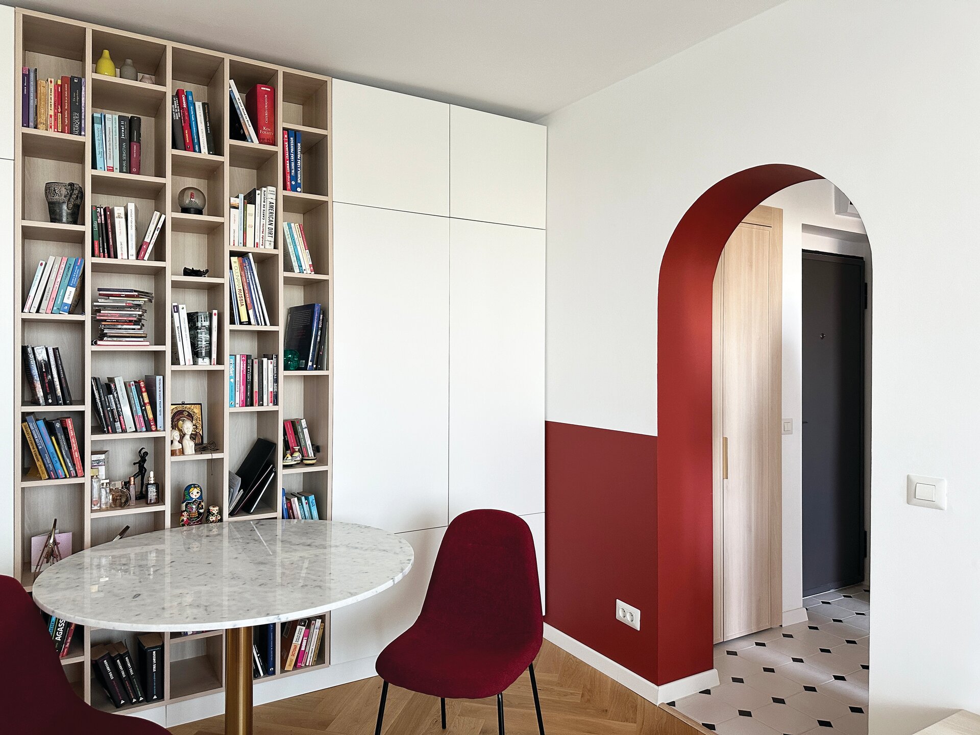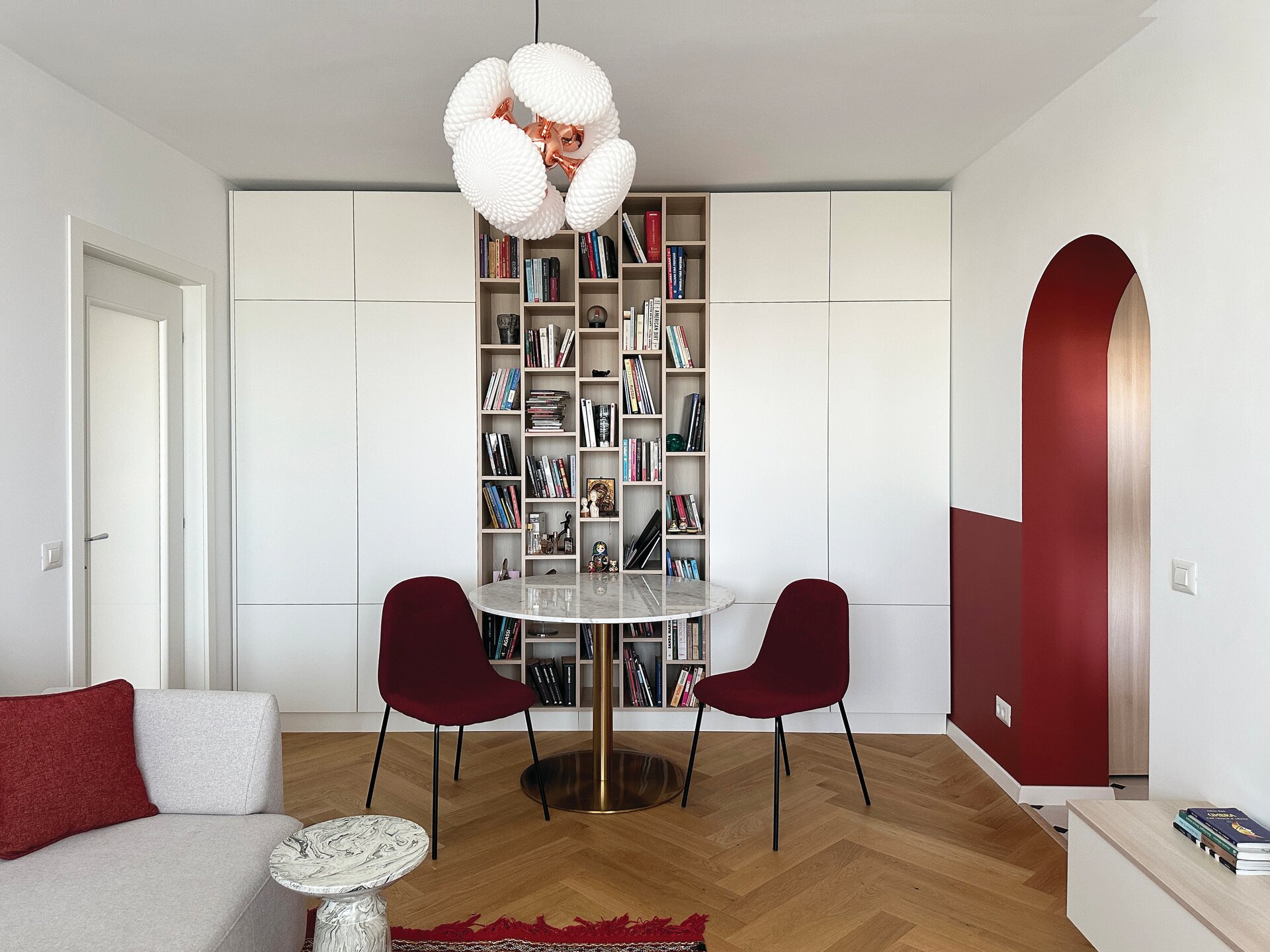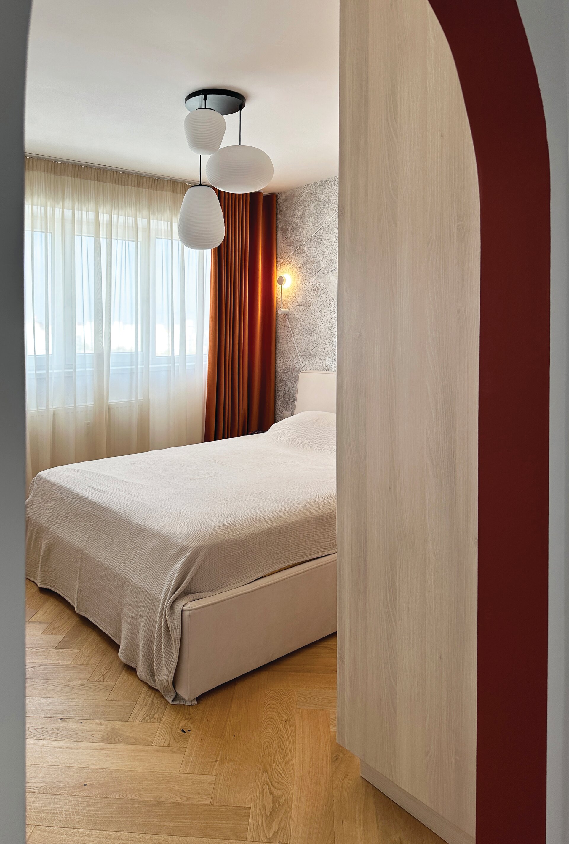This communist-era apartment was completely renovated from scratch, allowing us to expand the kitchen area into the entrance hallway, primarily by creating a direct connection between the hallway and the kitchen, which made it possible to relocate the built-in fridge into the hallway. All original finishes were replaced, along with the electrical system. The design blends minimalist elements with strong accents of color and texture. Brick-red accents add depth and warmth to the space, while the herringbone parquet flooring contributes to an elegant and natural atmosphere.
