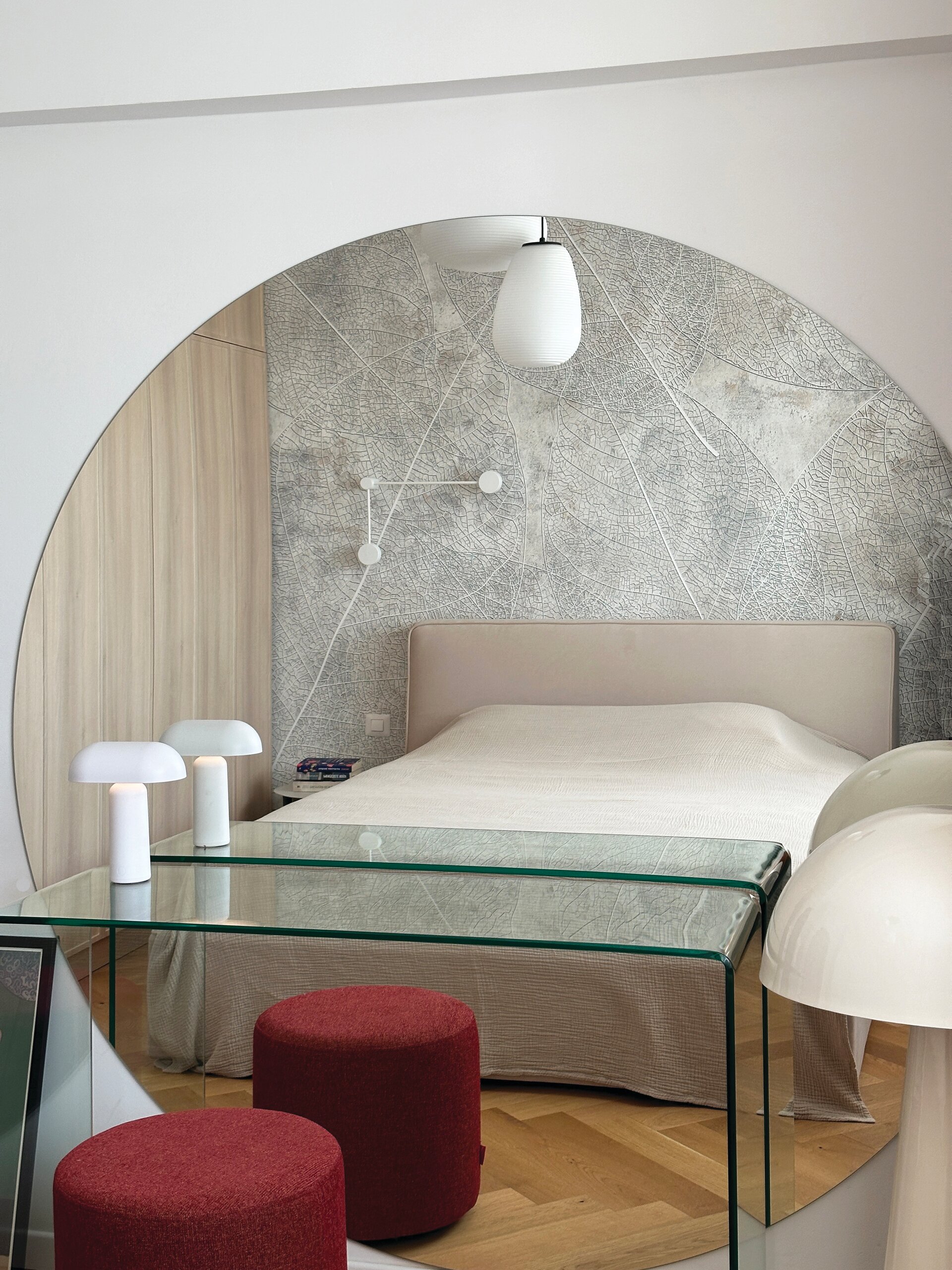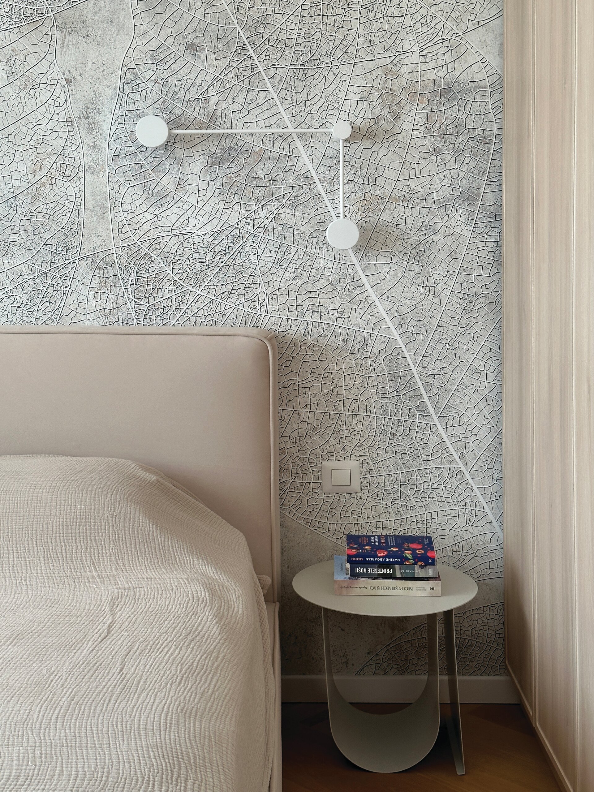 In the bedroom, the accent wall features a wallpaper with an organic pattern that imitates the texture of leaves in detail, adding depth. Minimalist nightstands with organic shapes are placed on either side of the bed, providing functionality without cluttering the space. The mirror is strategically positioned to reflect light and create a sense of a larger space. The curved design offers a pleasant contrast to the straight lines of the furniture.