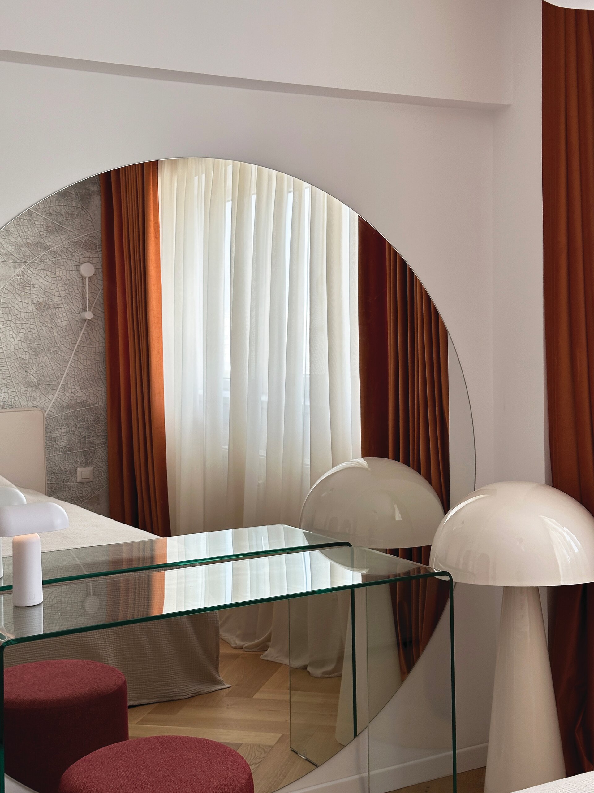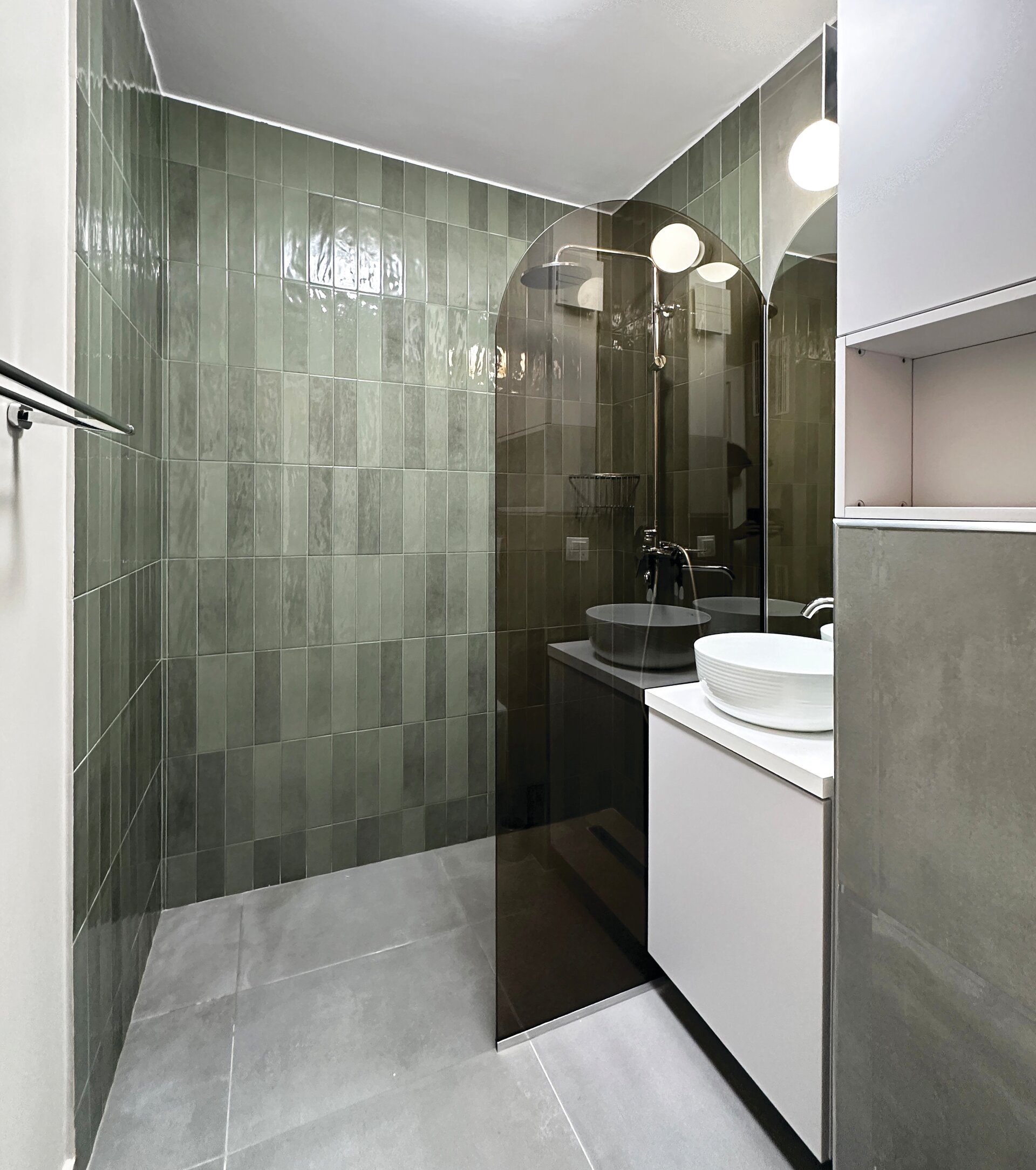 In the bathroom, a walk-in shower was created, featuring an arched glass screen inspired by the same shape found in the other rooms. The choice of materials and finishes — matte floor tiles and glossy wall tiles — creates a tactile and visual diversity, avoiding monotony.