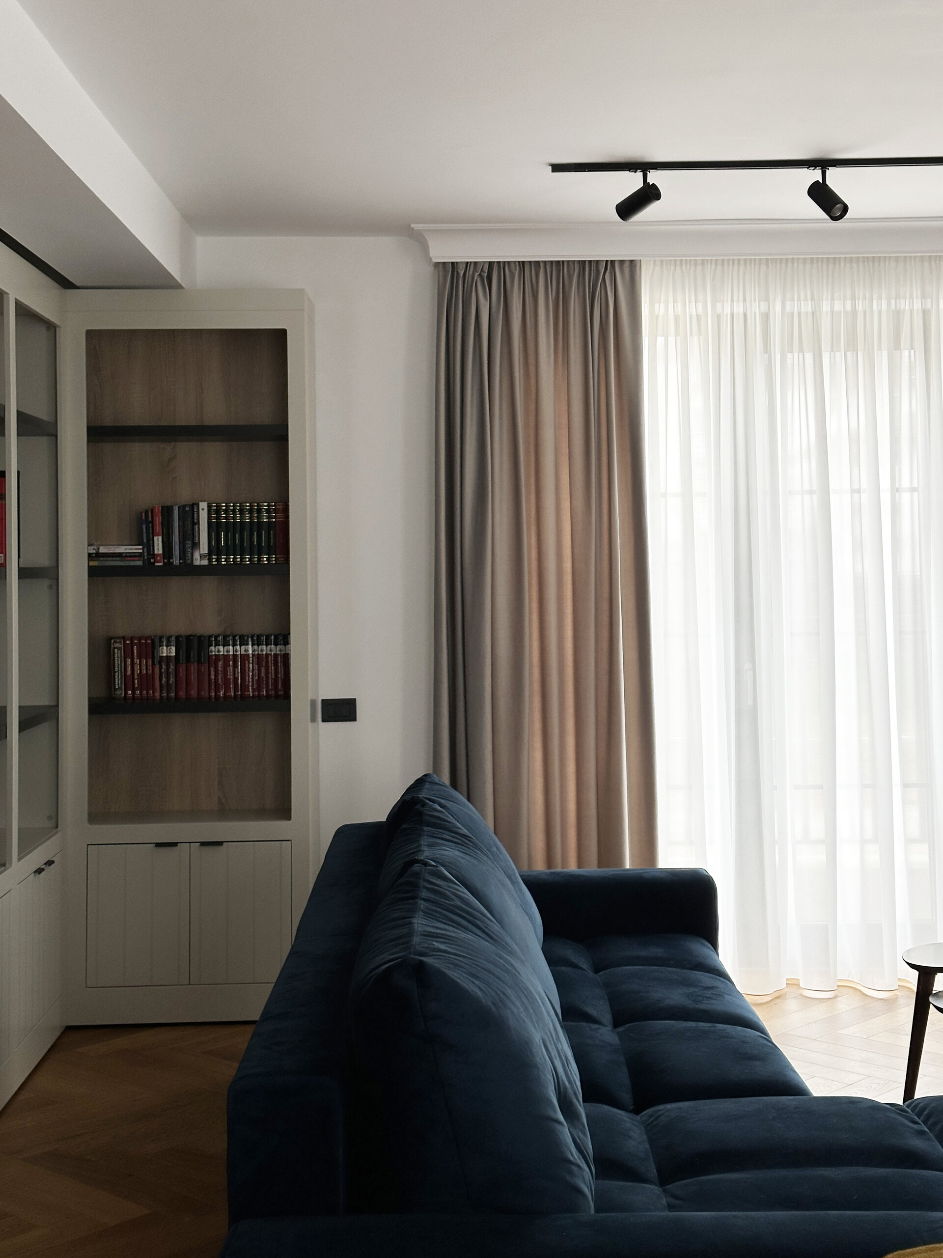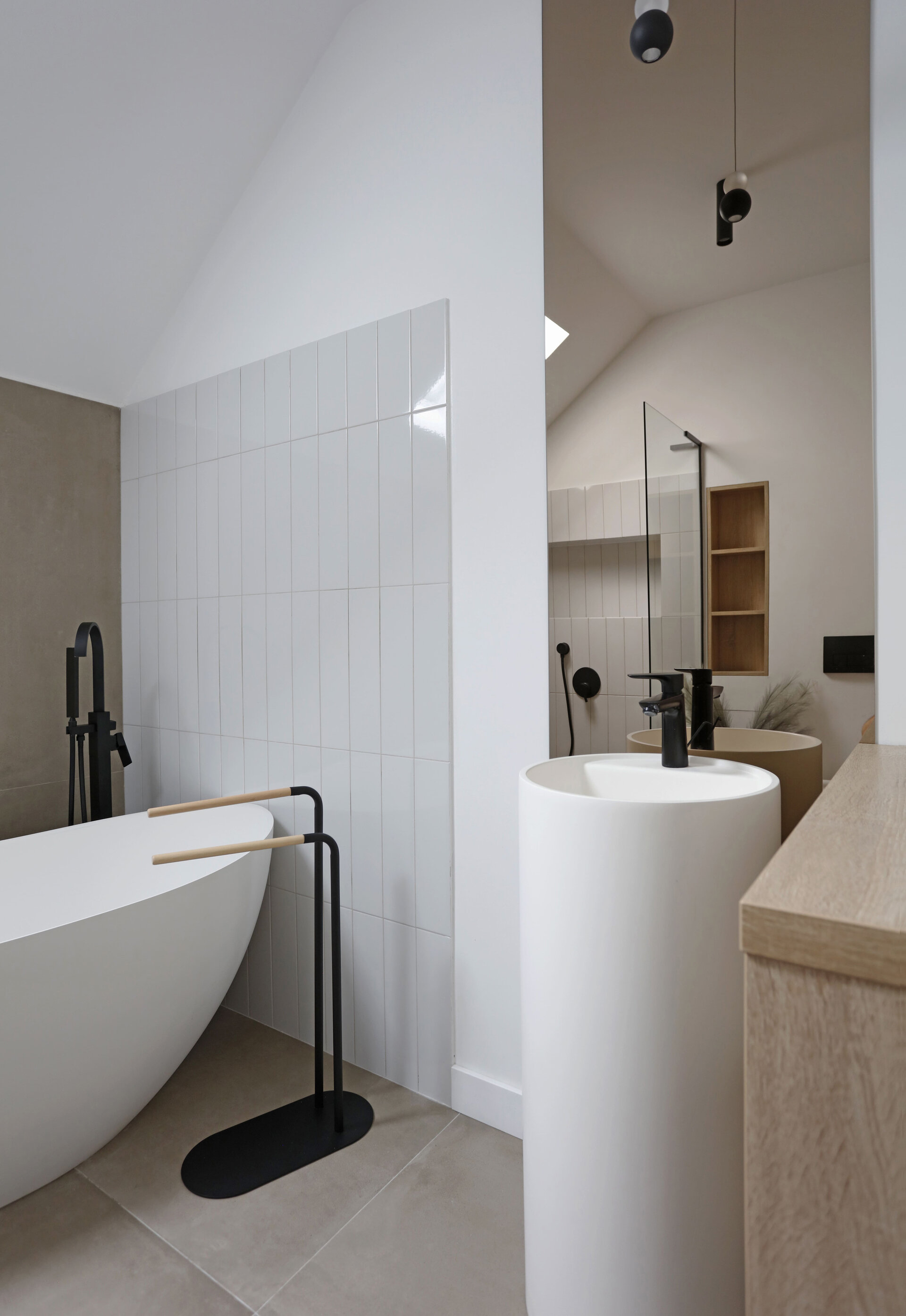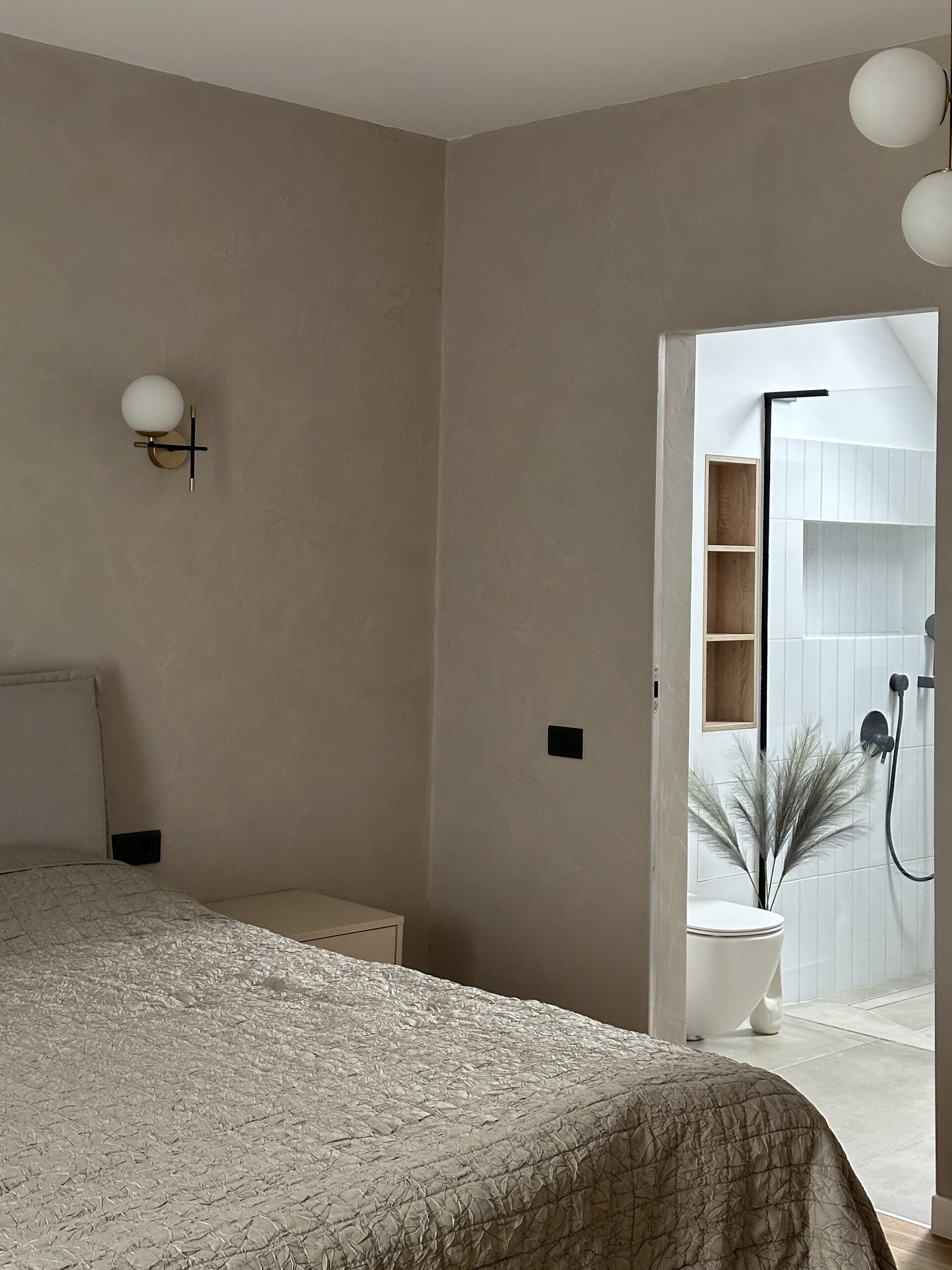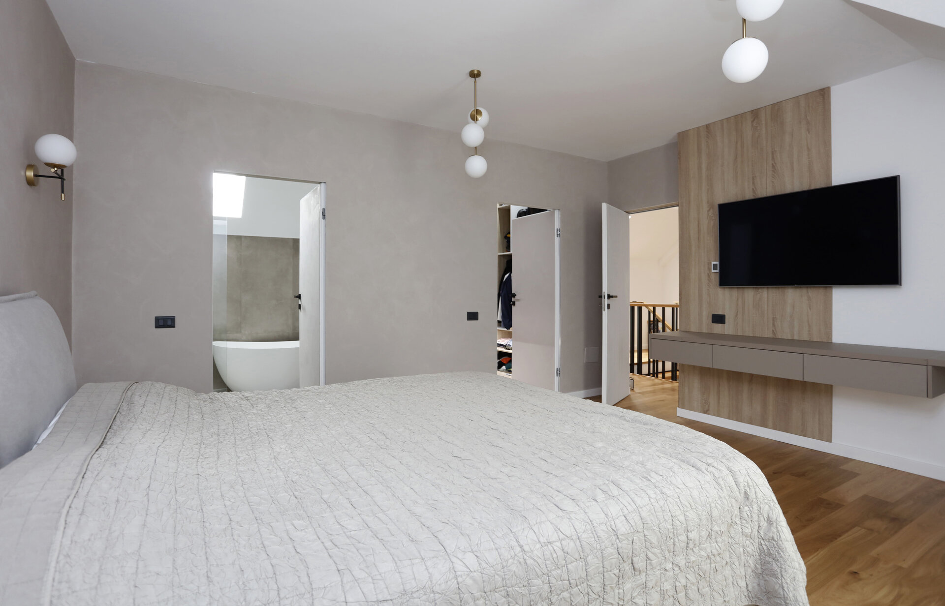 The project started from the structural phase (“shell stage”), which allowed us to reconfigure certain areas. For example, the master bathroom was expanded to include both a spacious walk-in shower and a freestanding bathtub, which serves as a central design element with its rounded shapes and minimalist aesthetic.