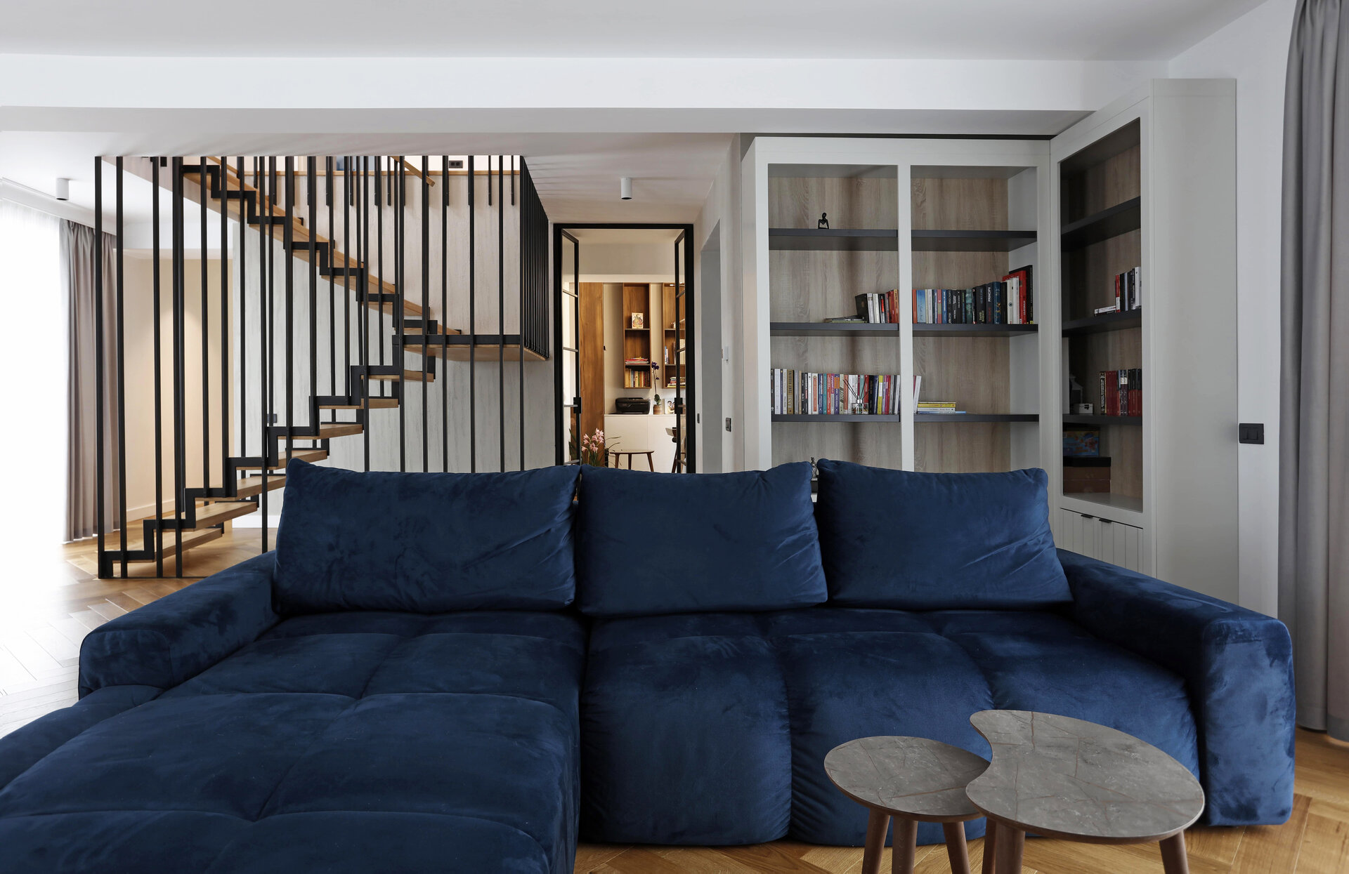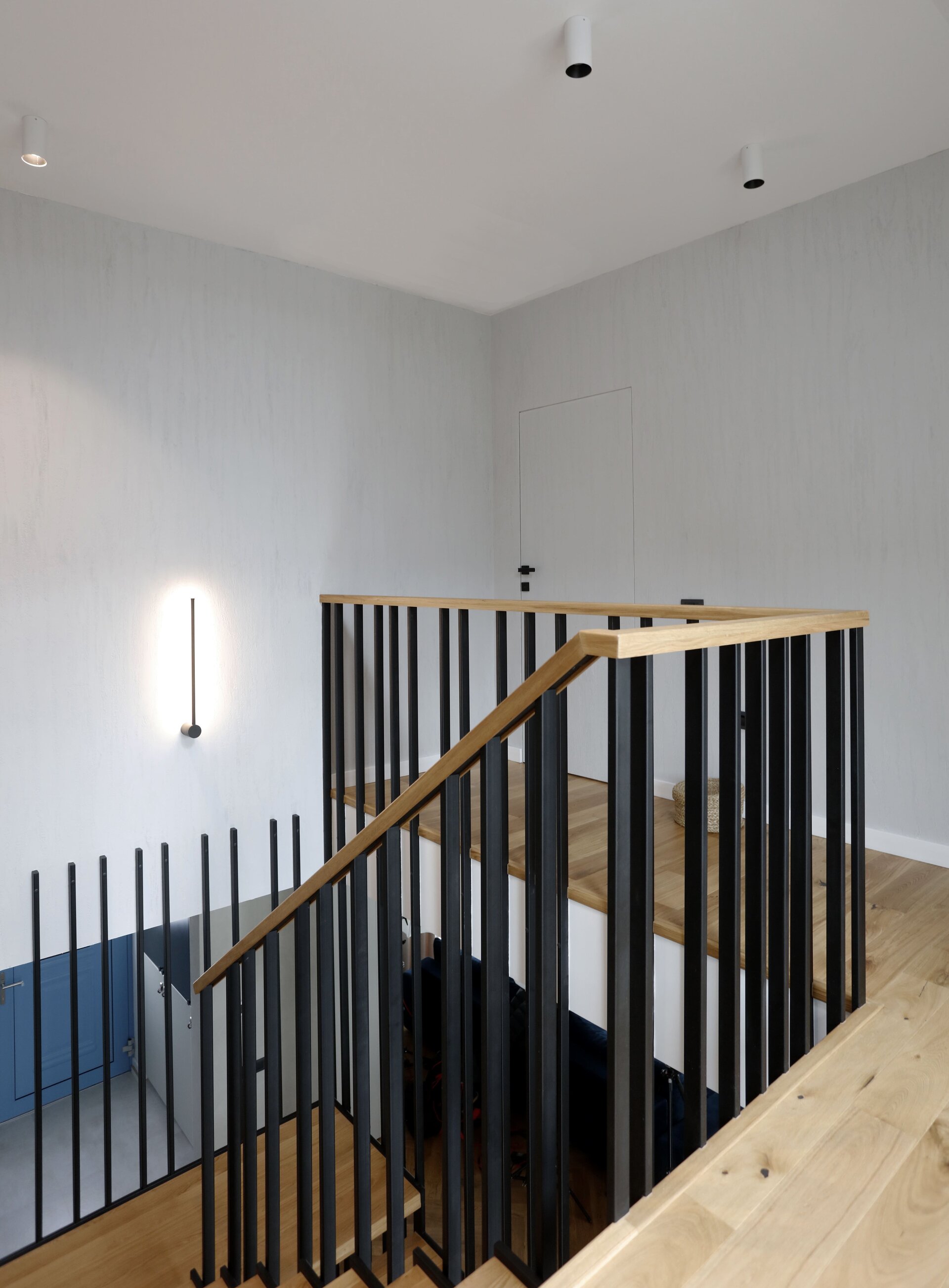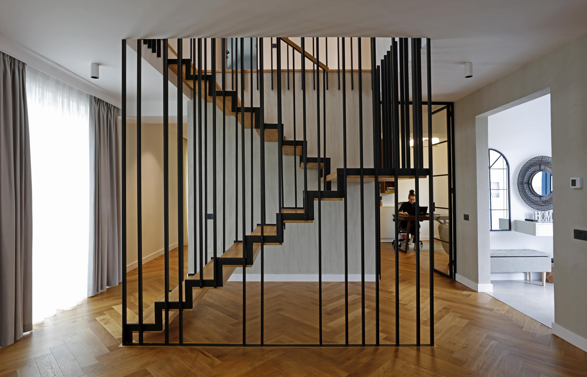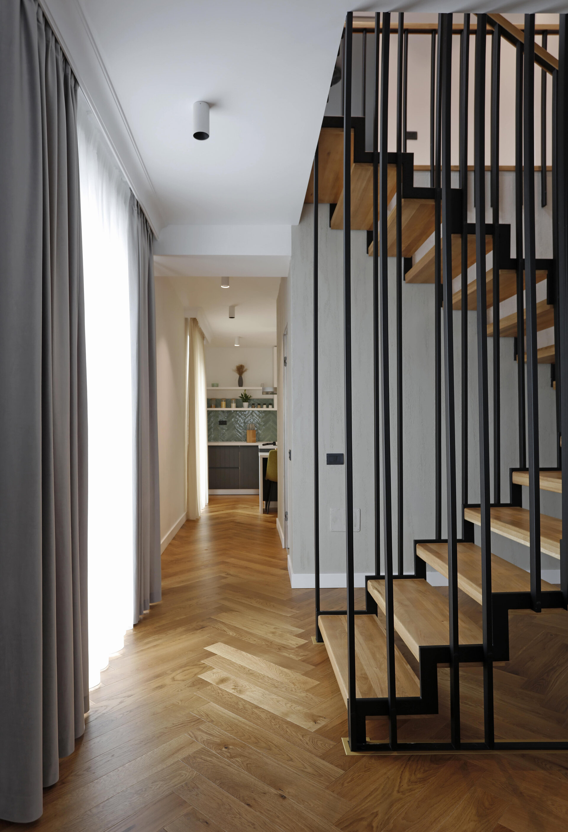 A key design feature is the staircase, with its minimalist structure made of wood and metal, adding a slight industrial feel that contrasts harmoniously with the overall elegance of the space.