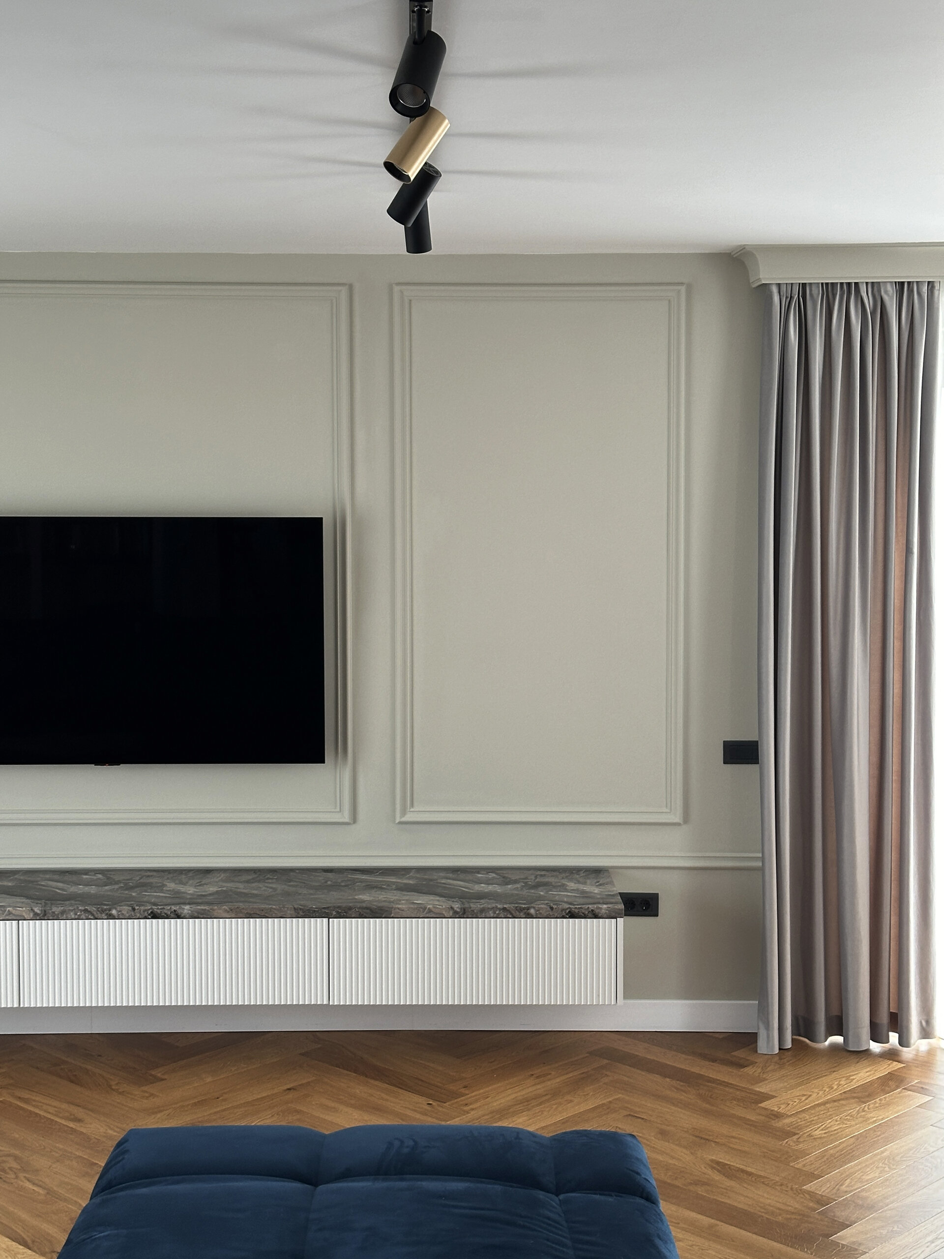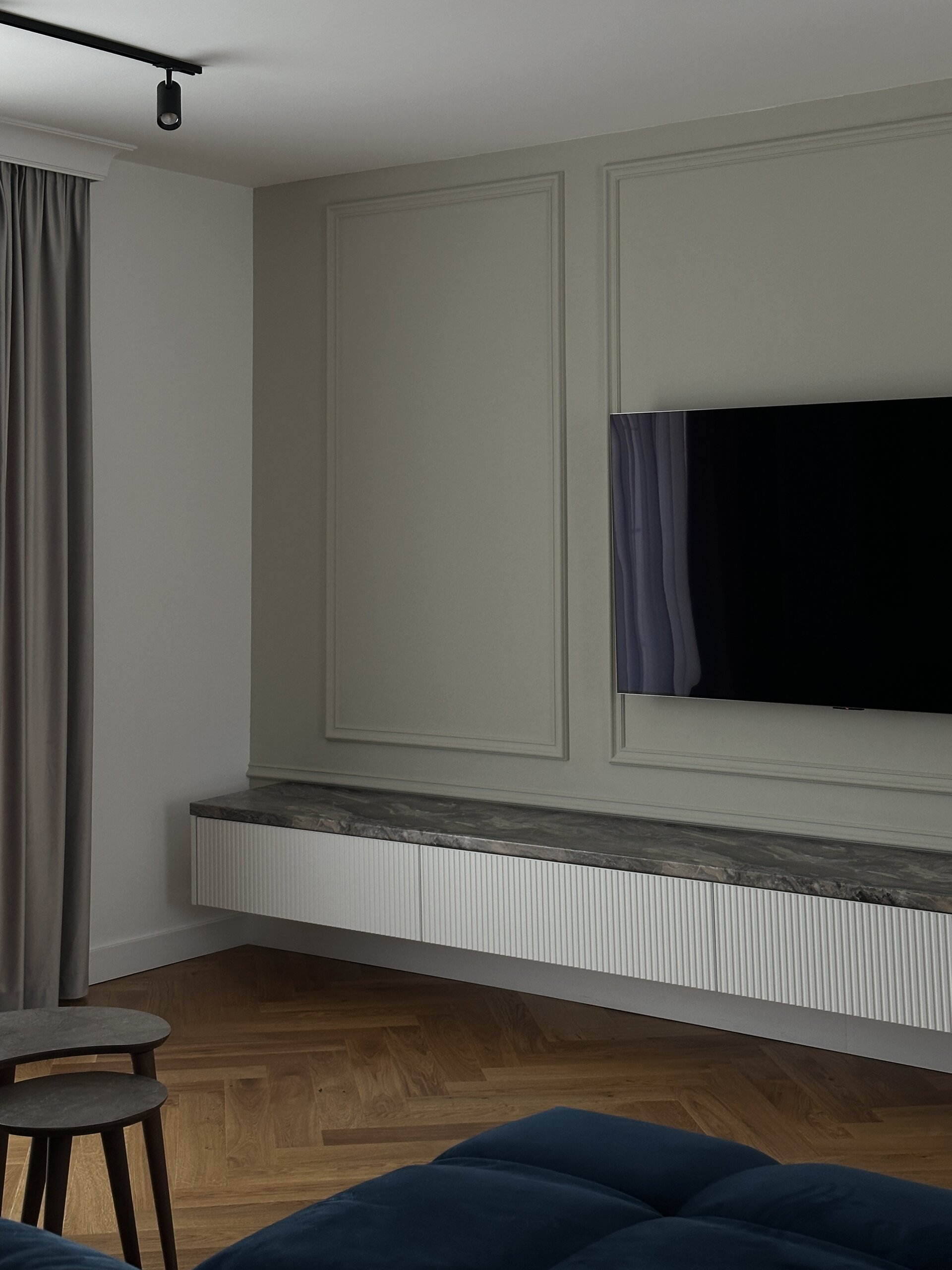 In the living room, the TV wall is enhanced by discrete frame-style decorative panels, emphasizing the verticality of the space and adding depth and sophistication.