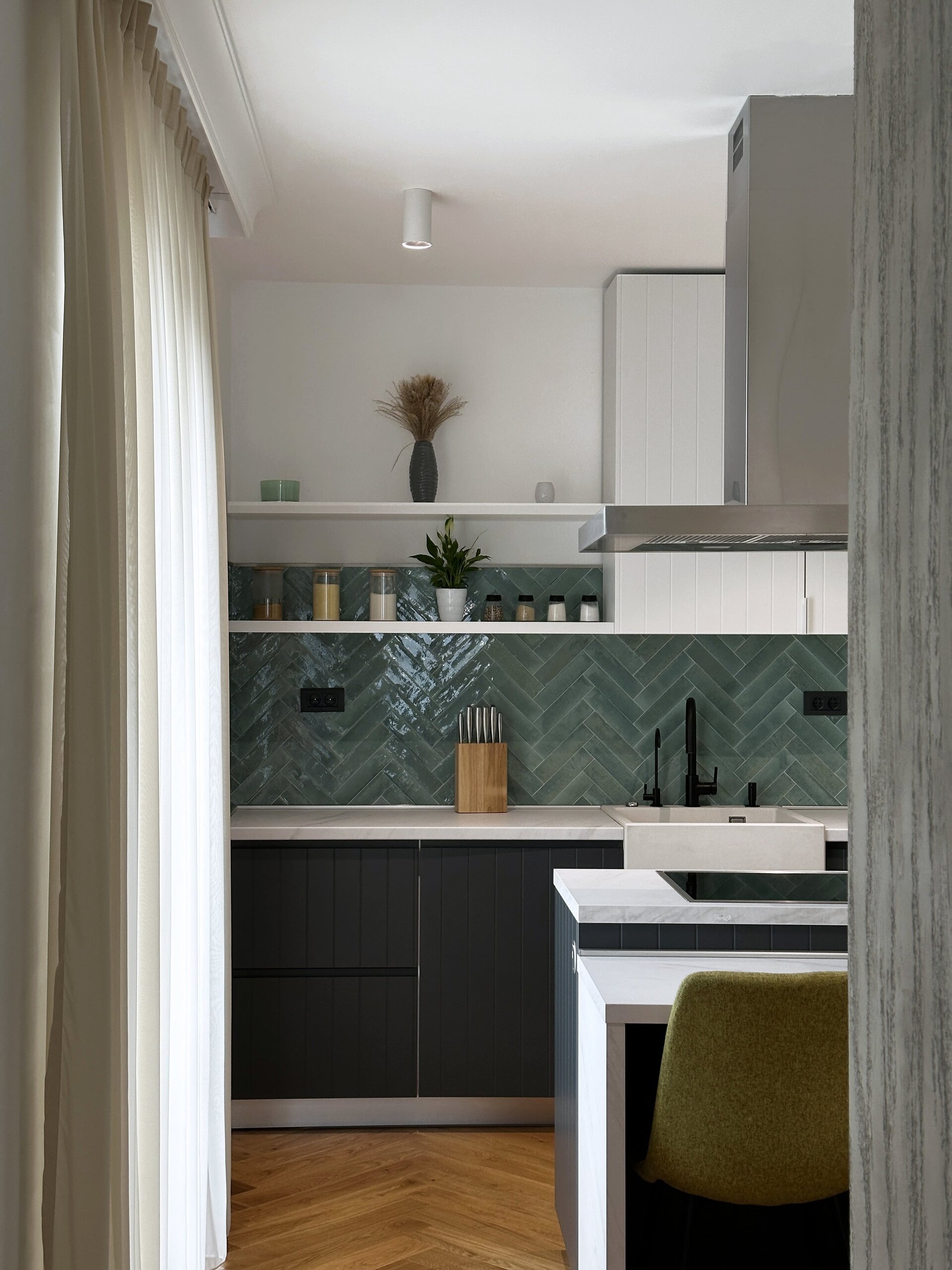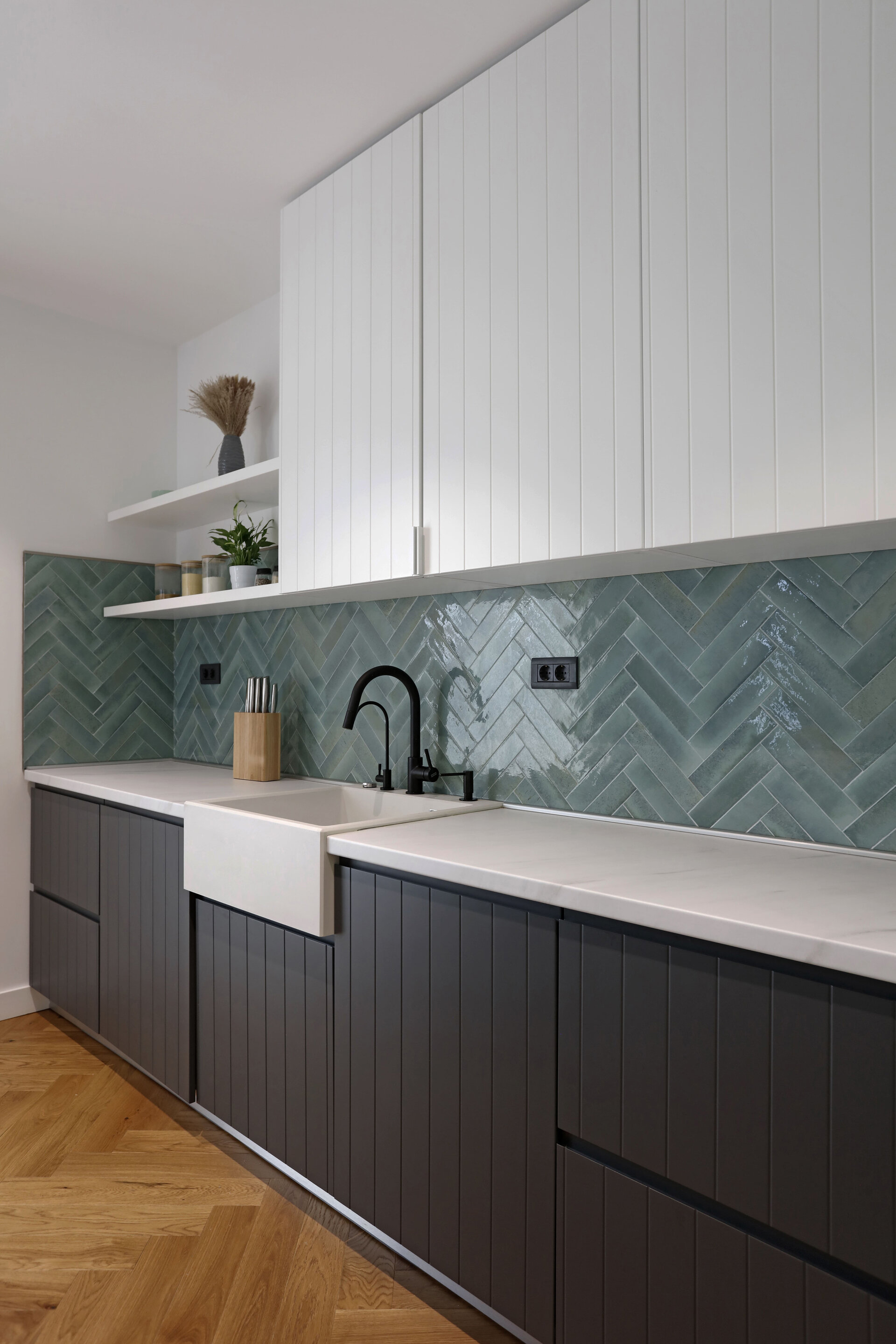The kitchen showcases a modern, functional design that combines contemporary elements with subtle traditional accents. The backsplash area is covered with dark green tiles arranged in a herringbone pattern (matching the parquet flooring), bringing an elegant touch and subtle contrast to the cabinet fronts.