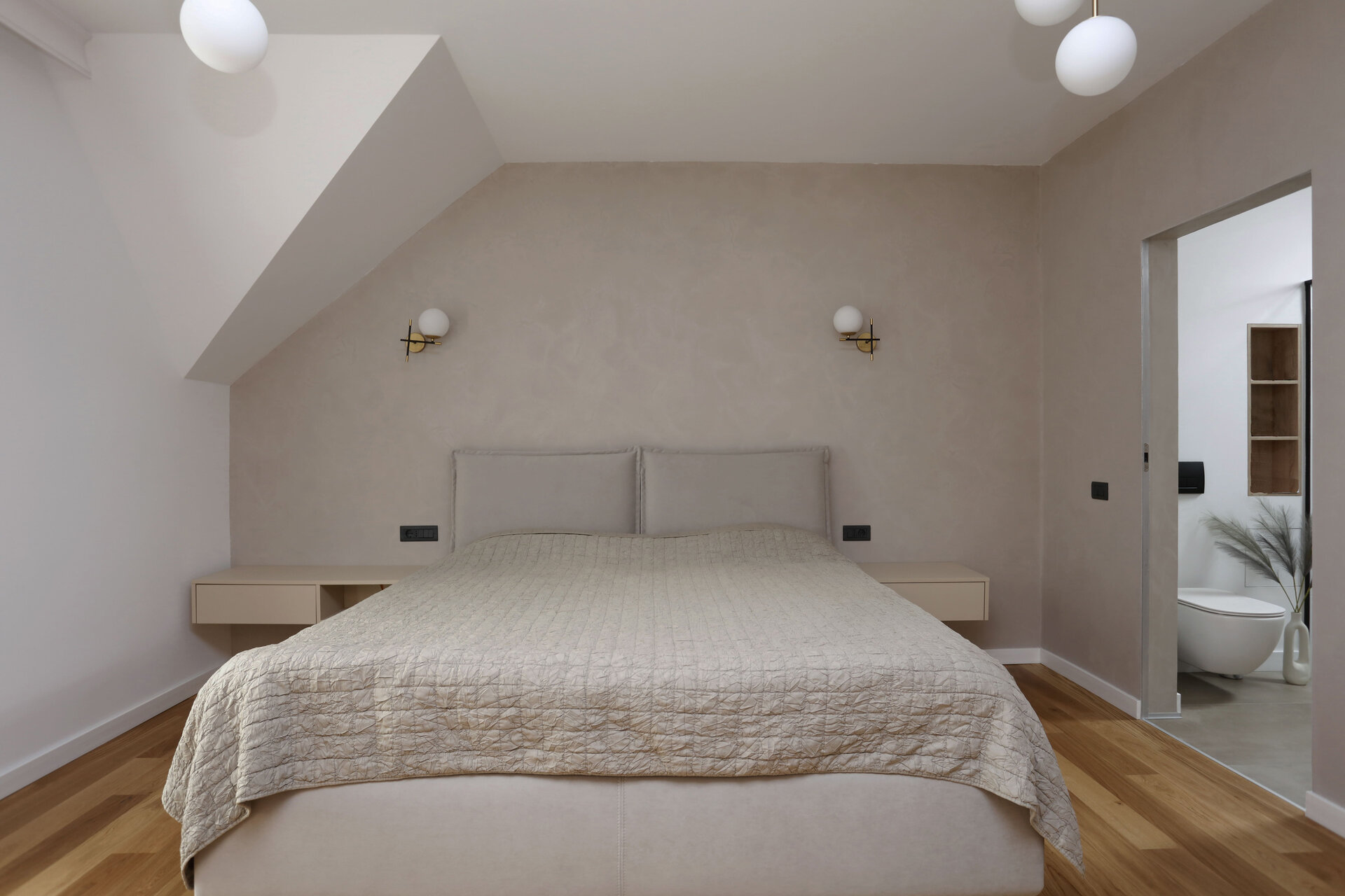 The master bedroom was designed in a modern, minimalist style, complemented by elegant touches. The color palette features neutral and natural tones: beige, gray, white, wood, and subtle gold accents, creating a cohesive and refined look.