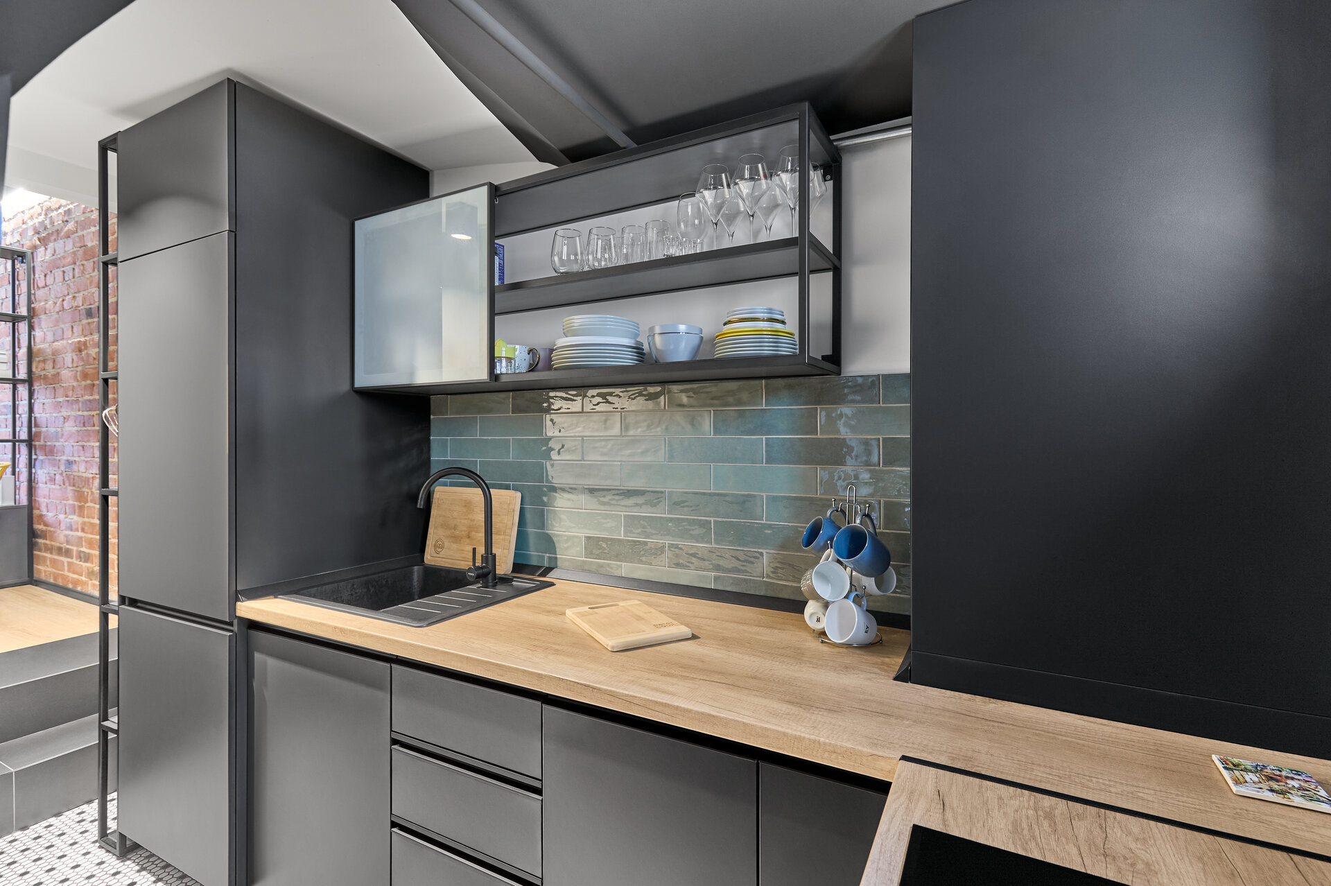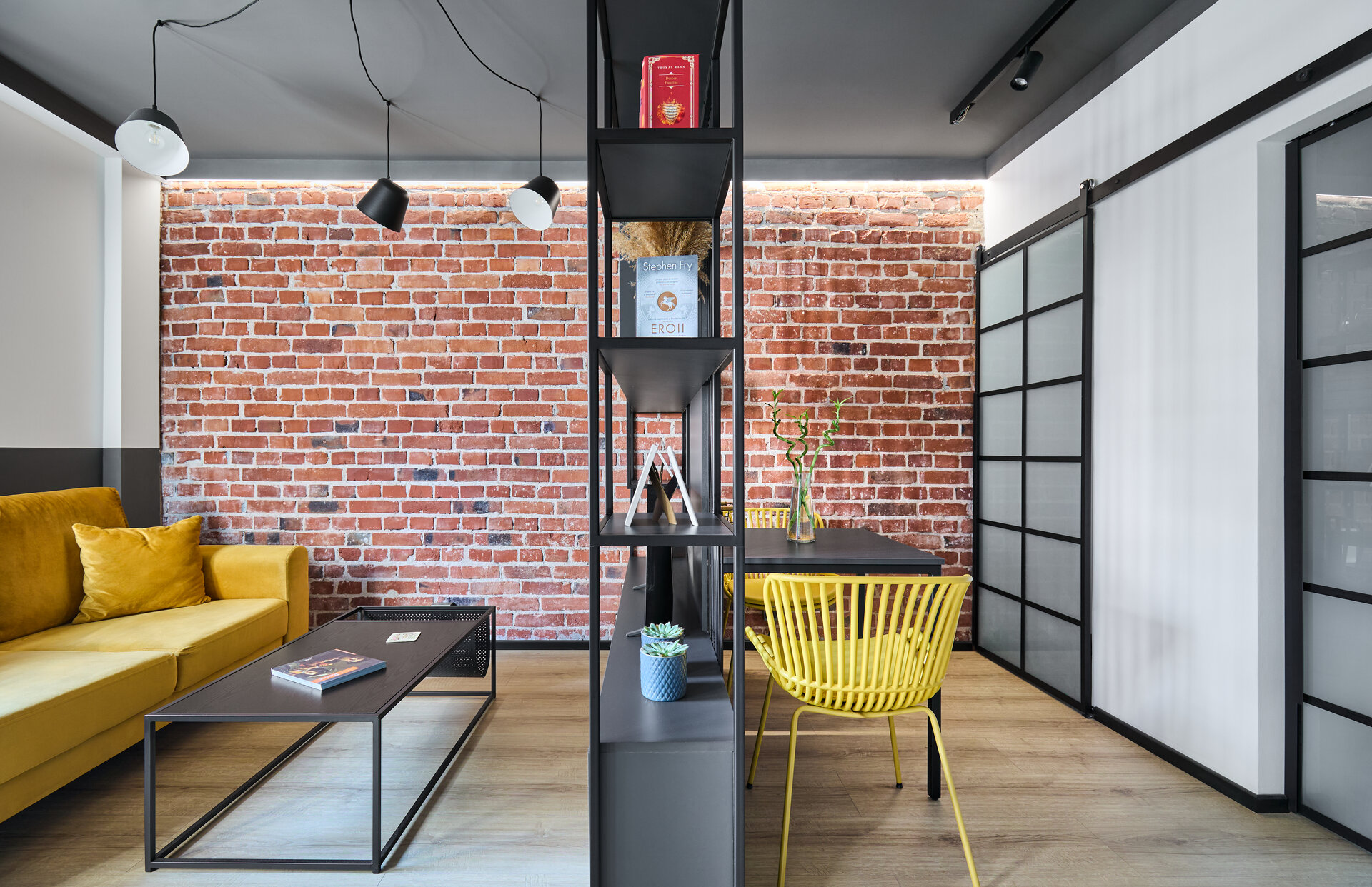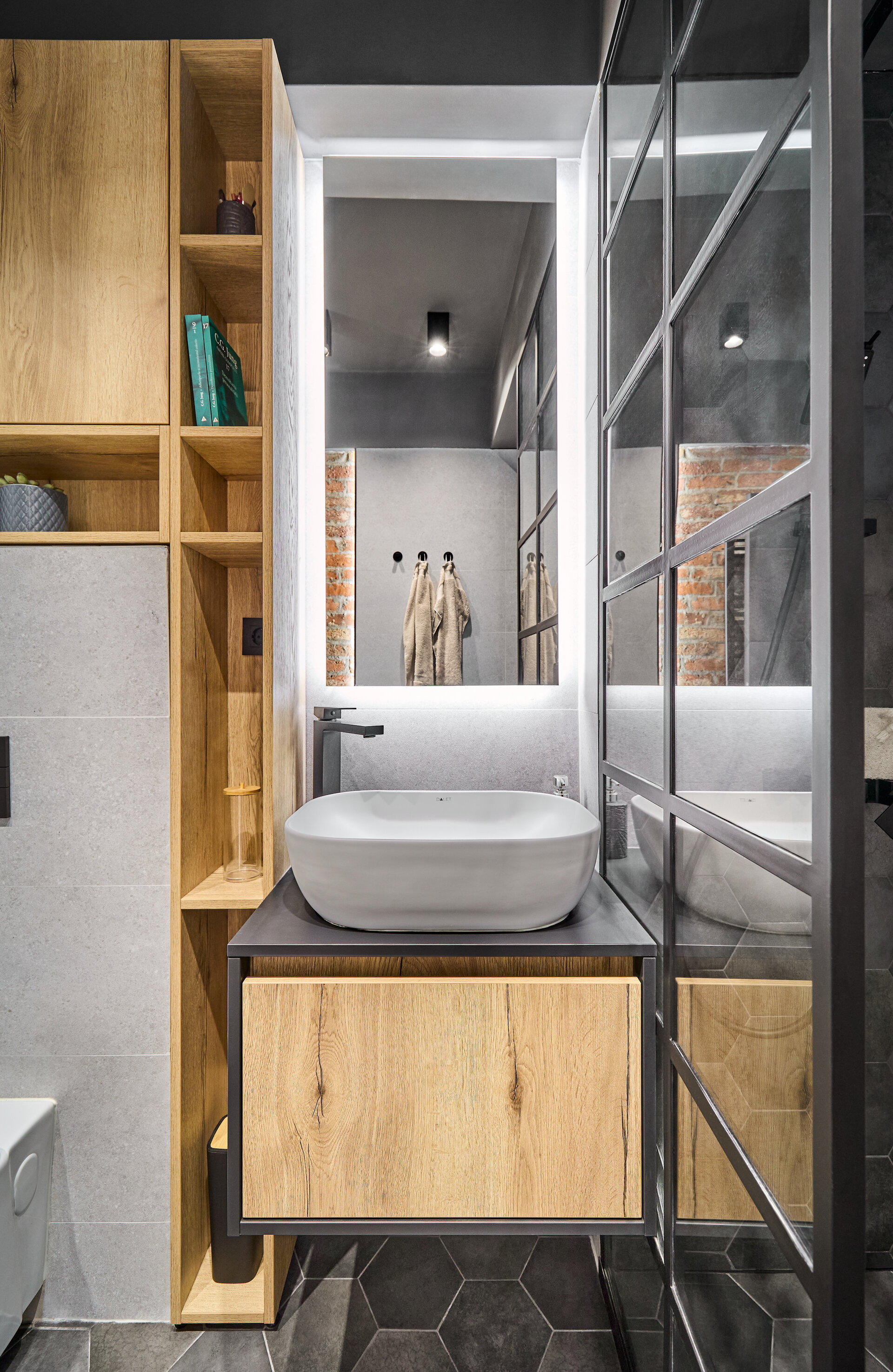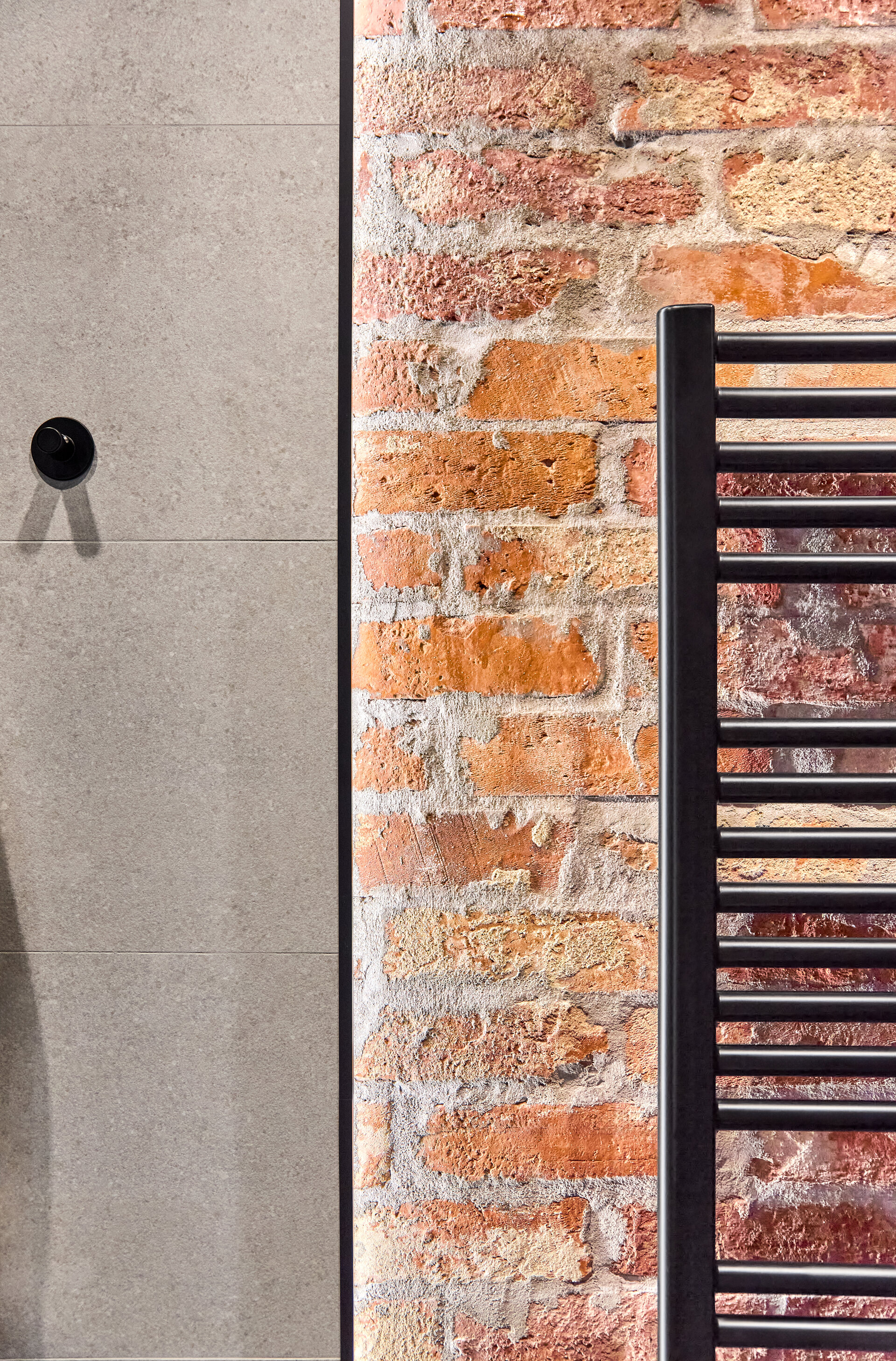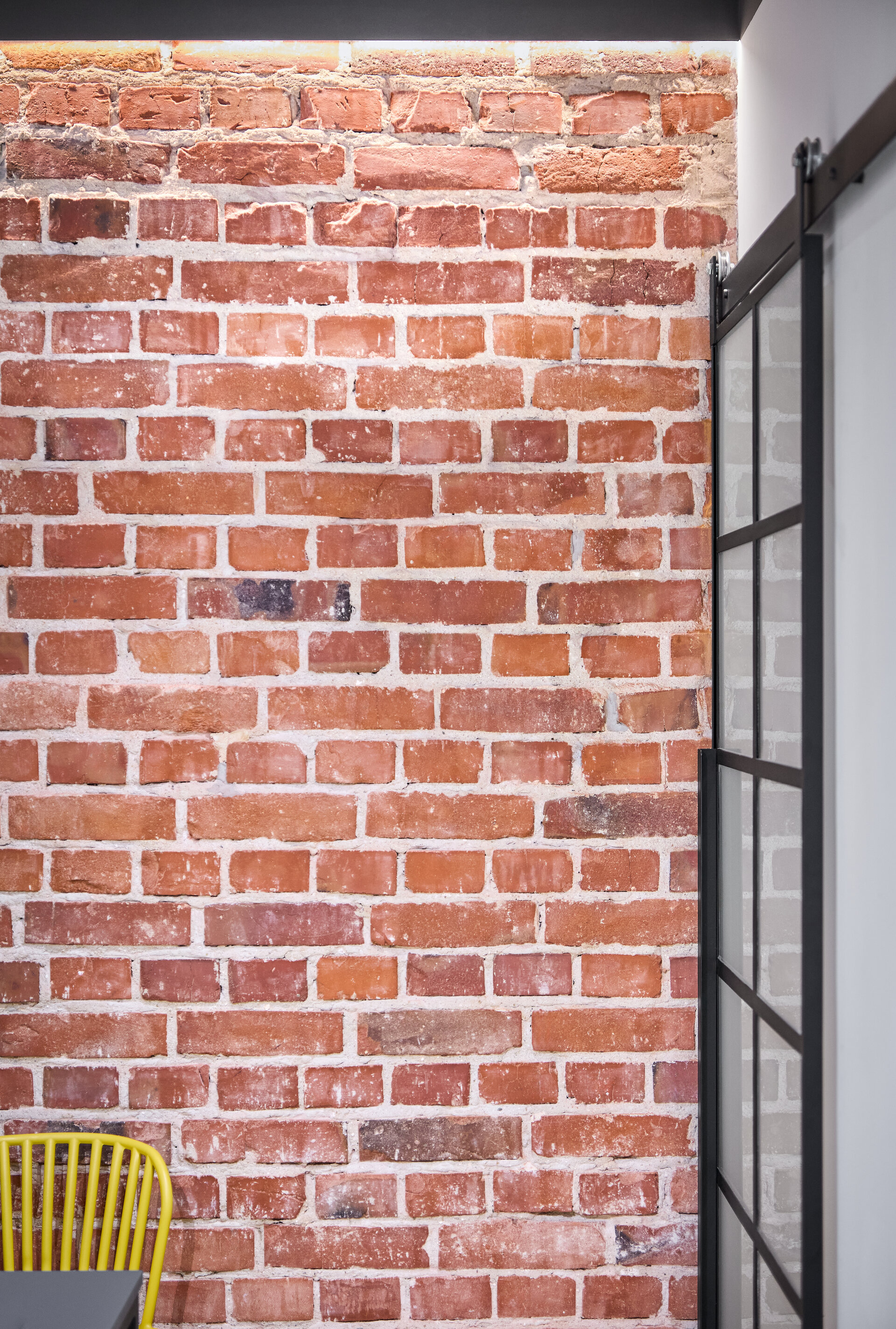 In terms of materials, the dominant element of the design is the exposed brick walls, which act as a strong visual counterpoint, evoking the raw texture of time in deliberate contrast with the surrounding finished surfaces. This leitmotif appears throughout the apartment, accompanied by cool shades of grey and white, in contrast with the warmth of wood.