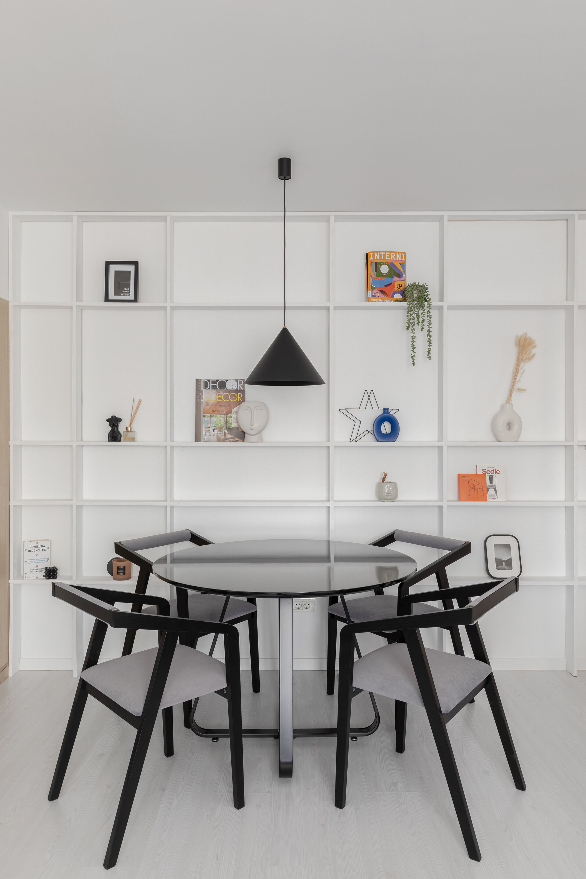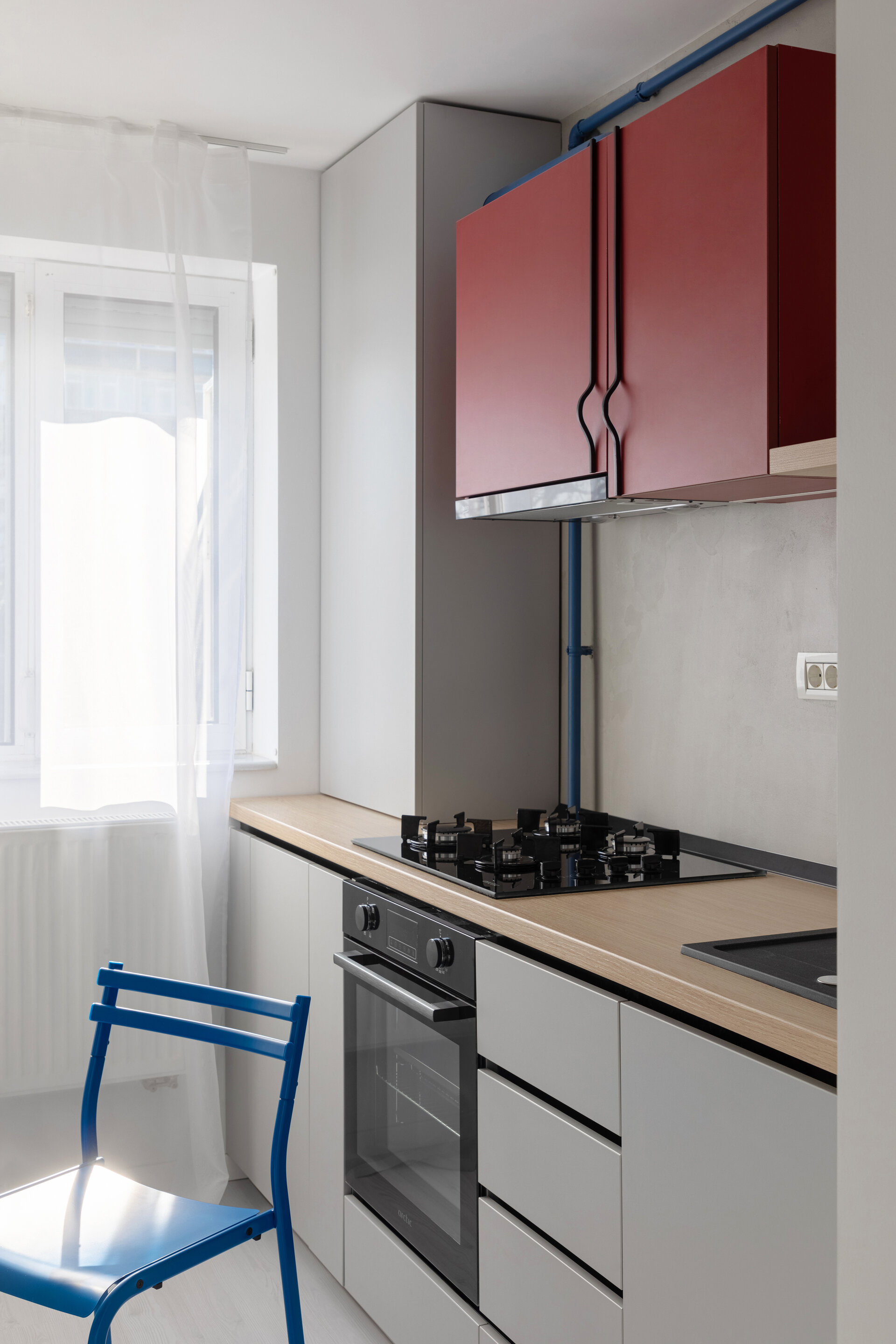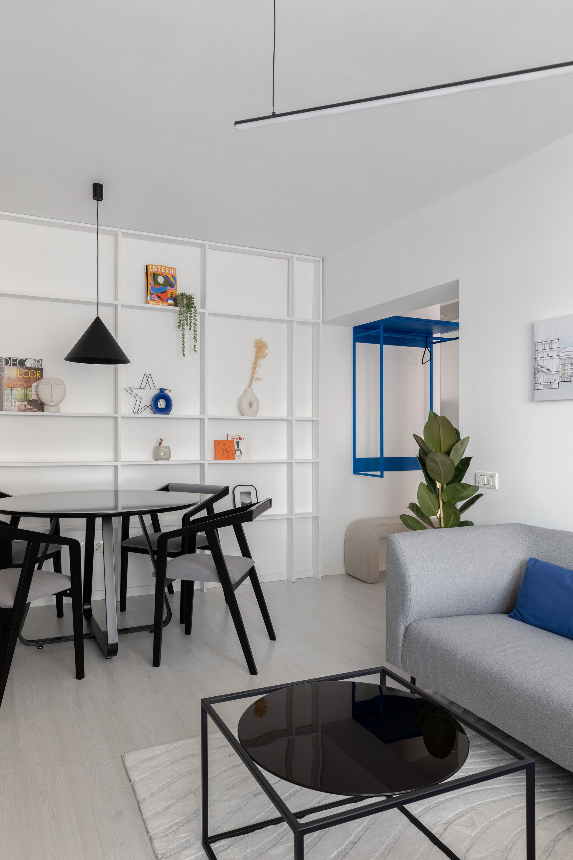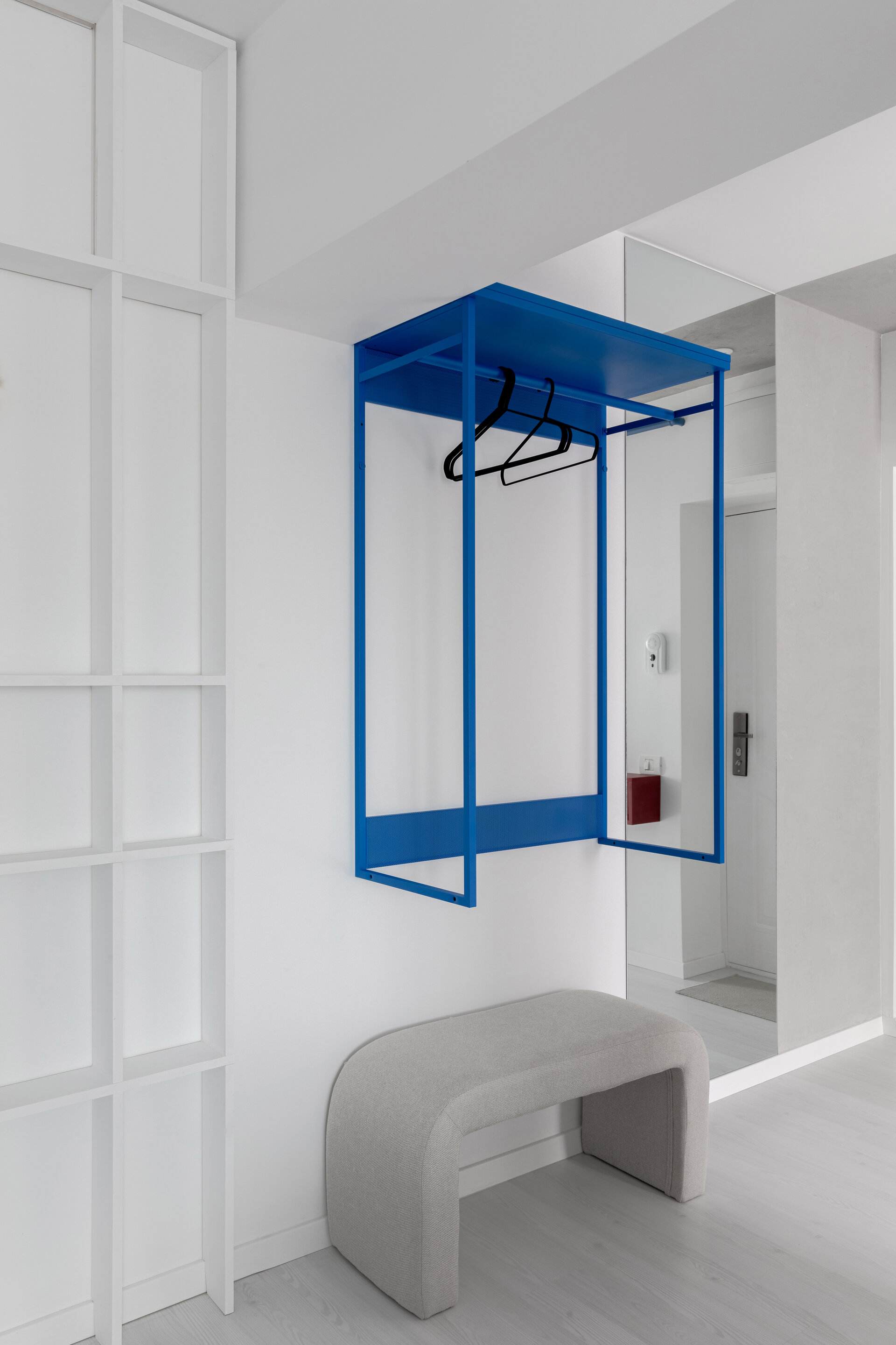 The small usable area, the passage from one room to another, the existence of 2 closets and many doors, led to the desire to visually free up the space, to emphasize functionality, ergonomics and simplicity.