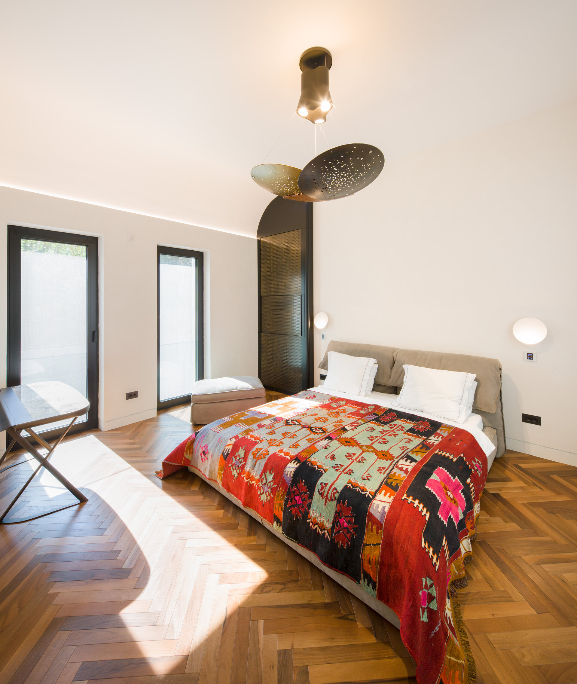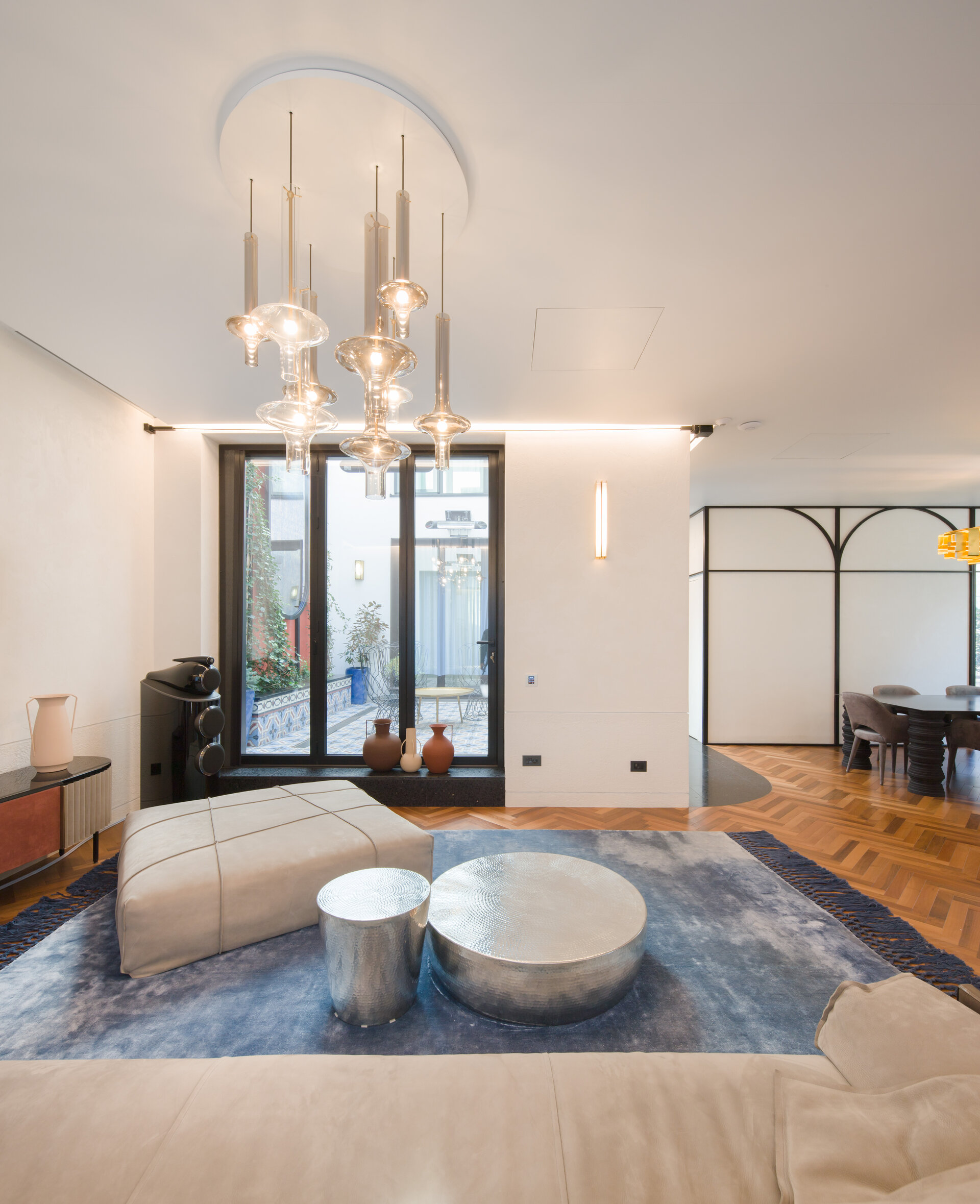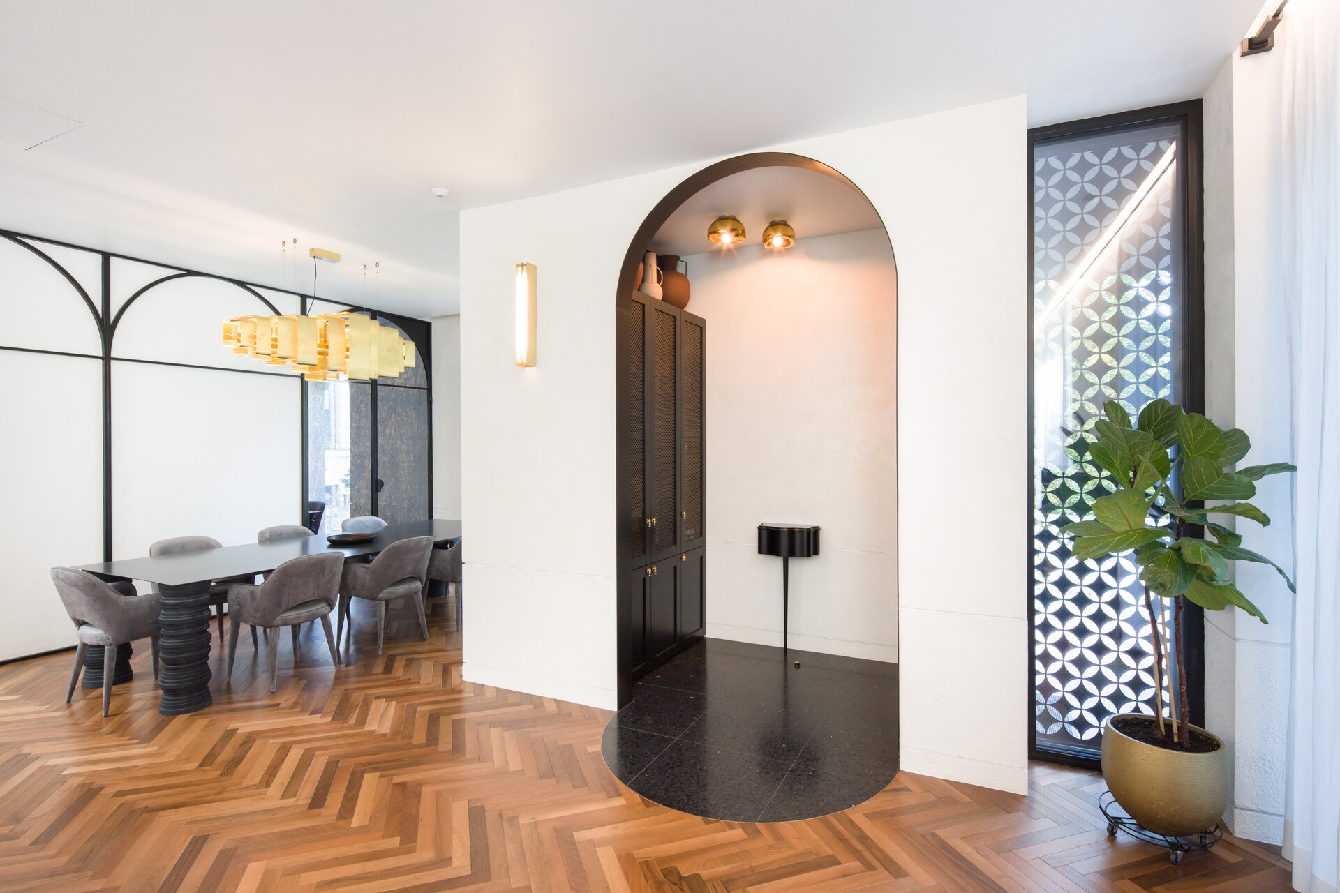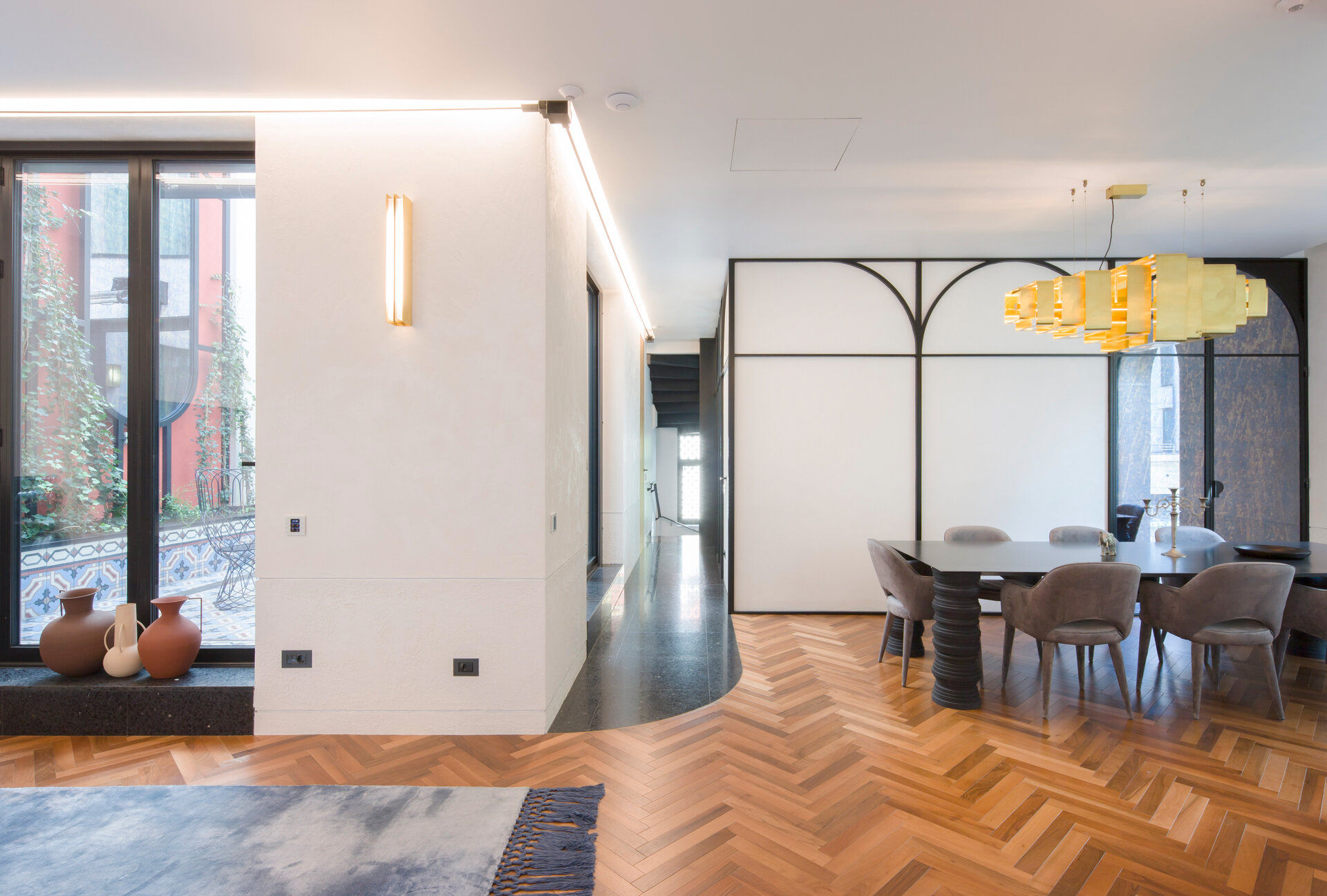 The arch appears both in architectural details on the façade and in the interior design: arcades, soffits, floor patterns, and subtle cut-outs in furniture. Varying in scale from metre to millimetre, the arches trace the narrative of the house. The lattice screen is used as a tool for shaping light: in windows, furniture details, and lighting fixtures, light is filtered and transformed into delicate shadows that animate the surfaces and enhance the décor. The colour palette begins with soft neutrals—white and warm greys—punctuated by carefully placed accents of blue and red in vibrant tones, tailored to each space. These are complemented by brass details, adding depth and elegance.