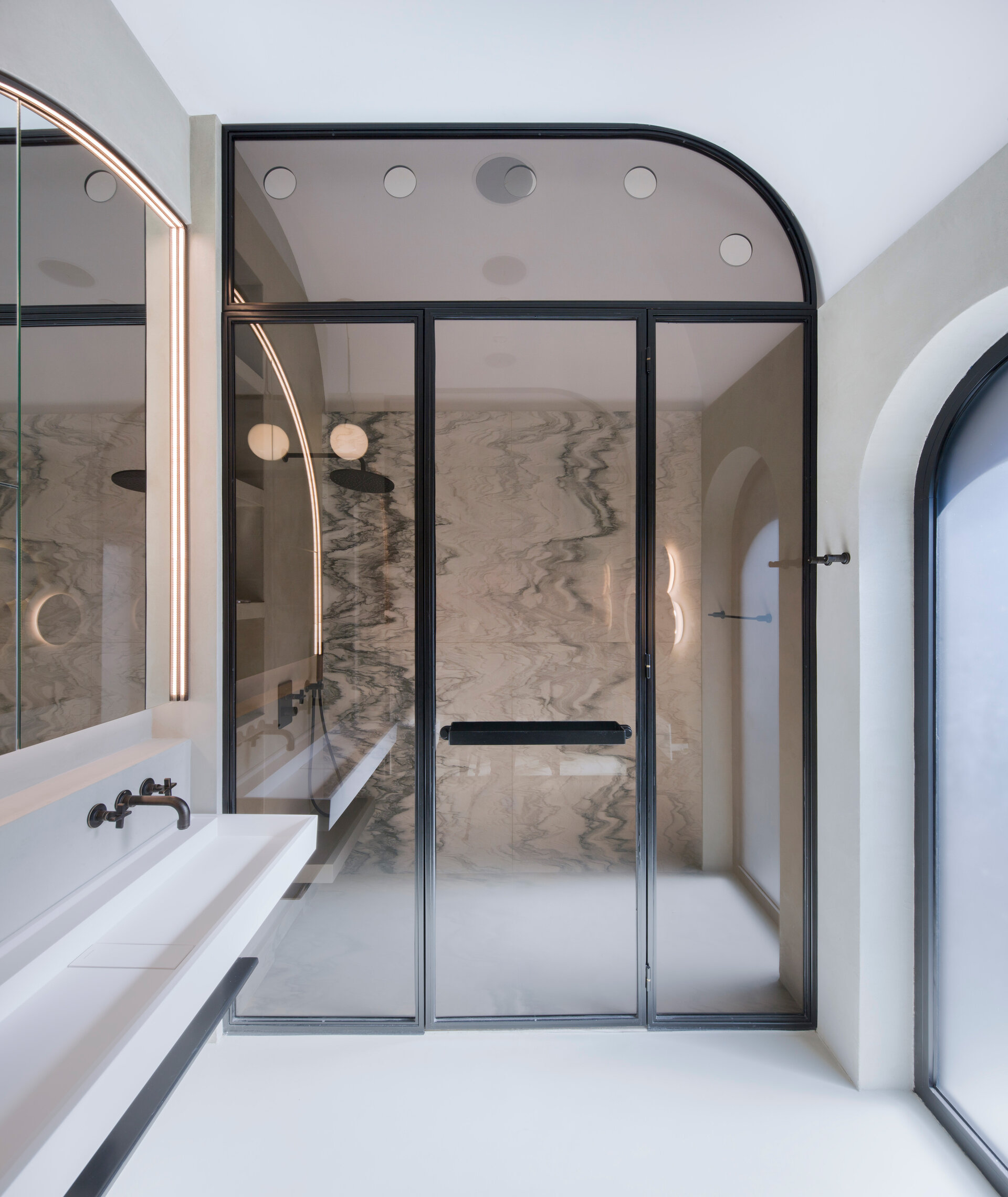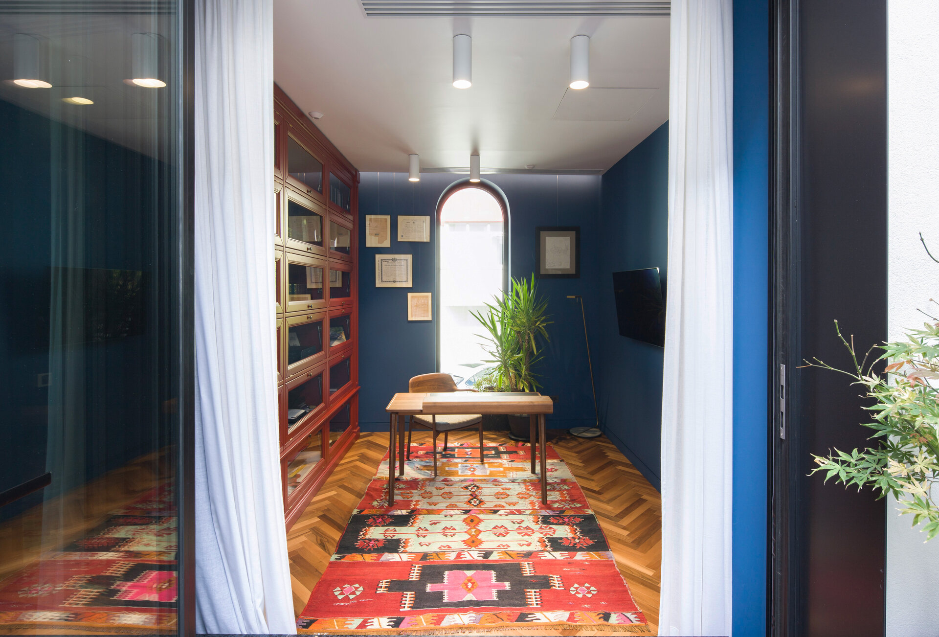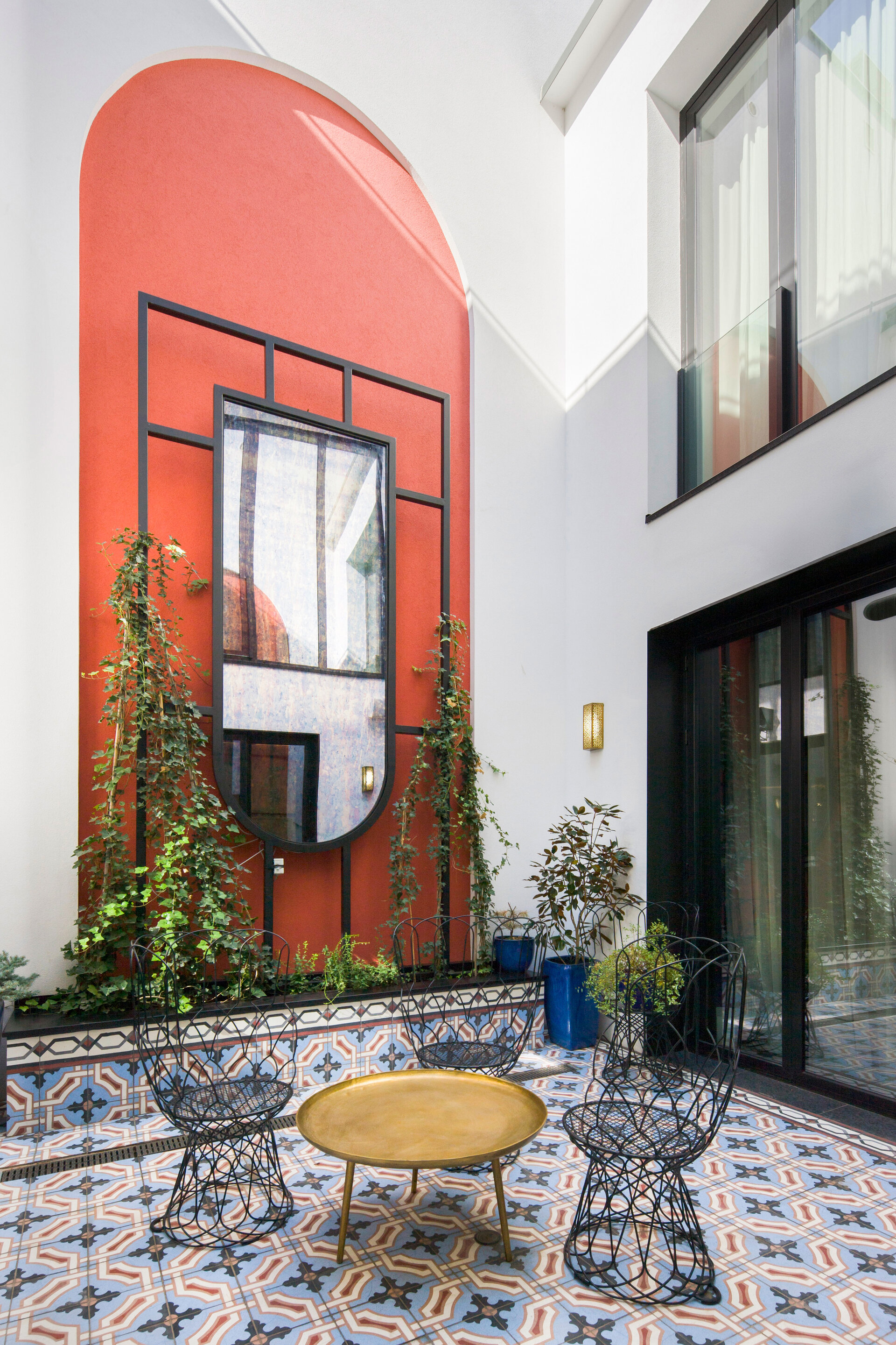 The arch appears both in architectural details on the façade and in the interior design: arcades, soffits, floor patterns, and subtle cut-outs in furniture. Varying in scale from metre to millimetre, the arches trace the narrative of the house. The lattice screen is used as a tool for shaping light: in windows, furniture details, and lighting fixtures, light is filtered and transformed into delicate shadows that animate the surfaces and enhance the décor. The colour palette begins with soft neutrals—white and warm greys—punctuated by carefully placed accents of blue and red in vibrant tones, tailored to each space. These are complemented by brass details, adding depth and elegance.