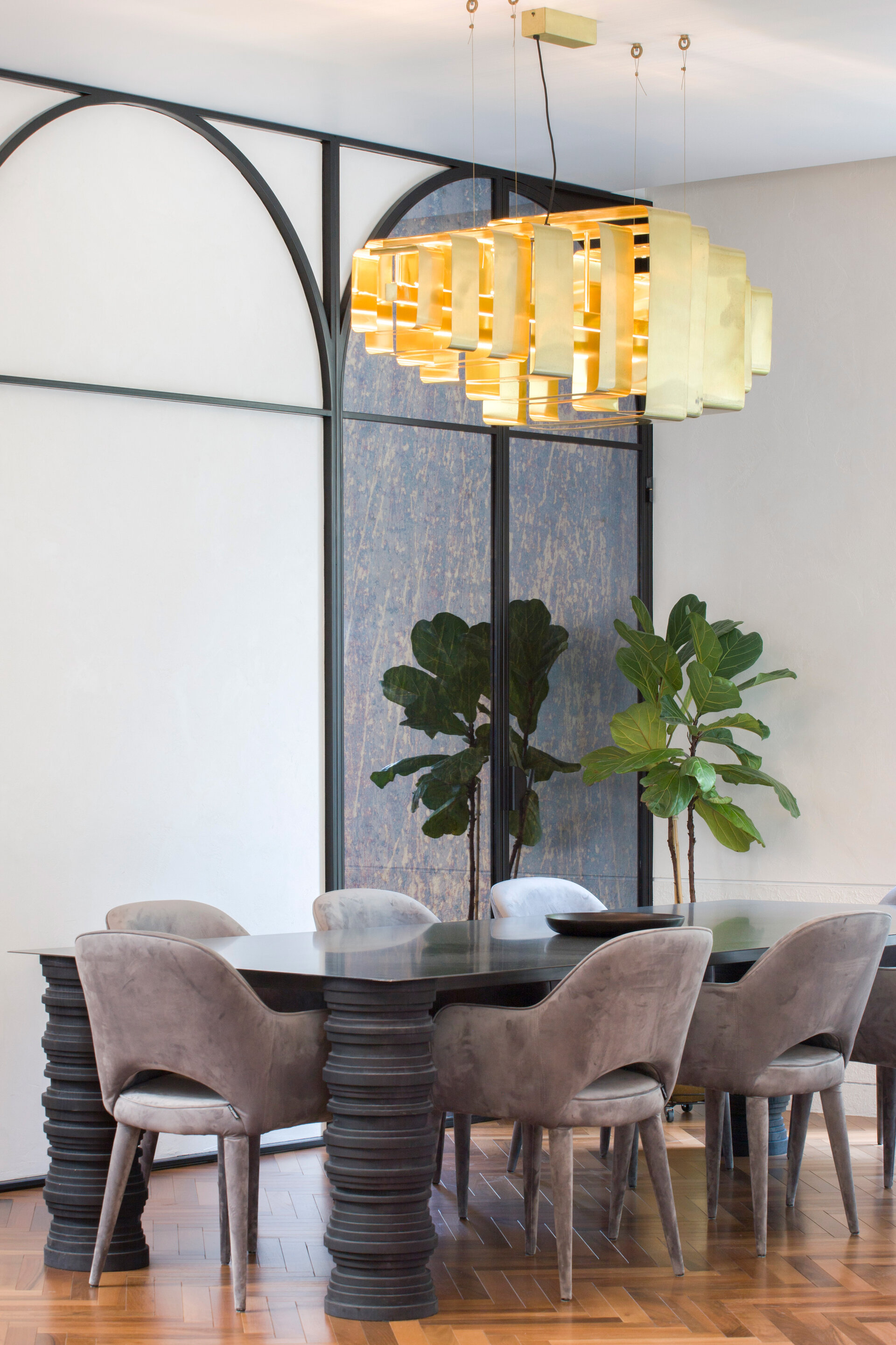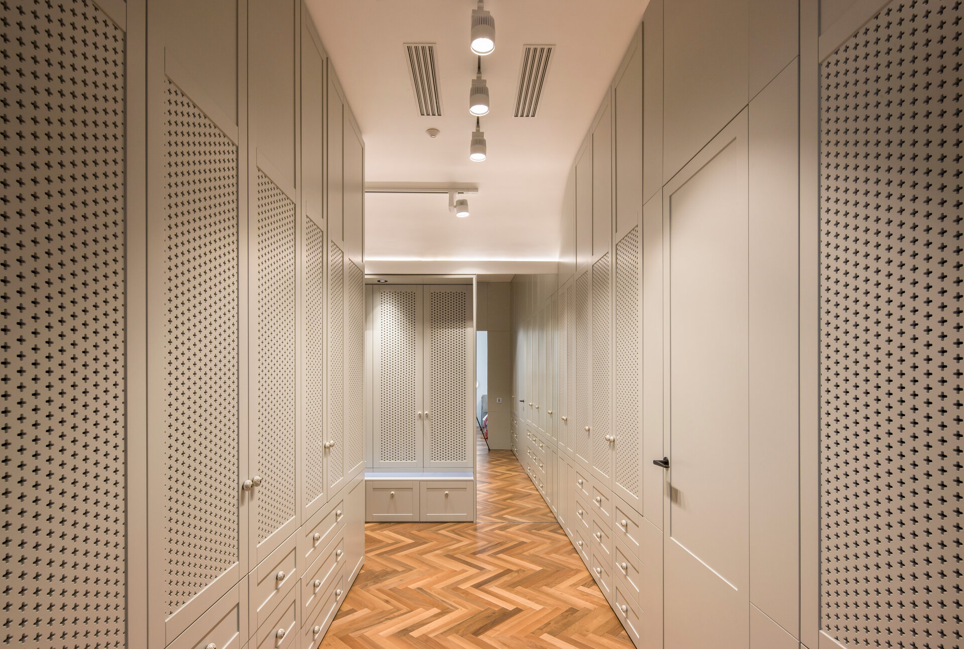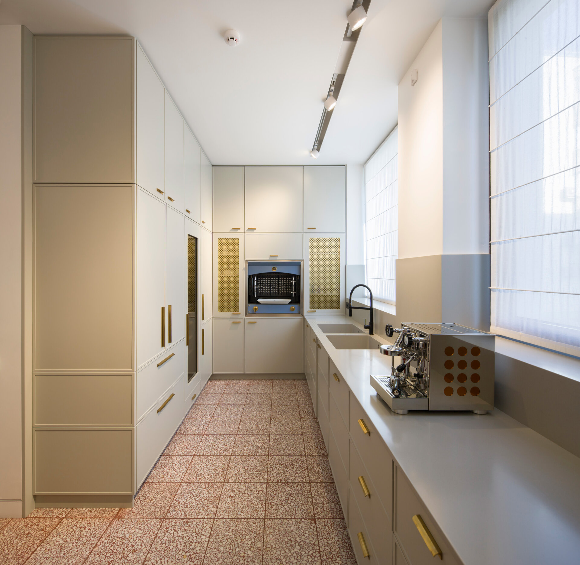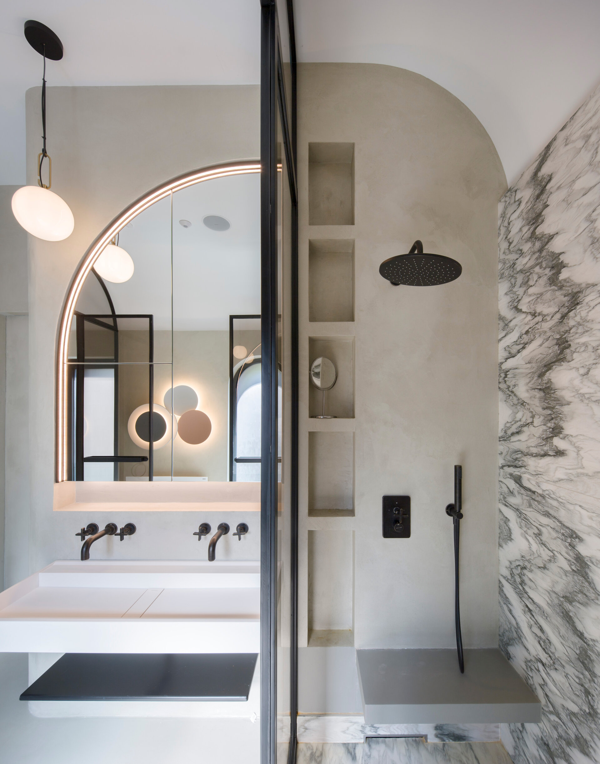 The arch appears both in architectural details on the façade and in the interior design: arcades, soffits, floor patterns, and subtle cut-outs in furniture. Varying in scale from metre to millimetre, the arches trace the narrative of the house. The lattice screen is used as a tool for shaping light: in windows, furniture details, and lighting fixtures, light is filtered and transformed into delicate shadows that animate the surfaces and enhance the décor. The colour palette begins with soft neutrals—white and warm greys—punctuated by carefully placed accents of blue and red in vibrant tones, tailored to each space. These are complemented by brass details, adding depth and elegance.