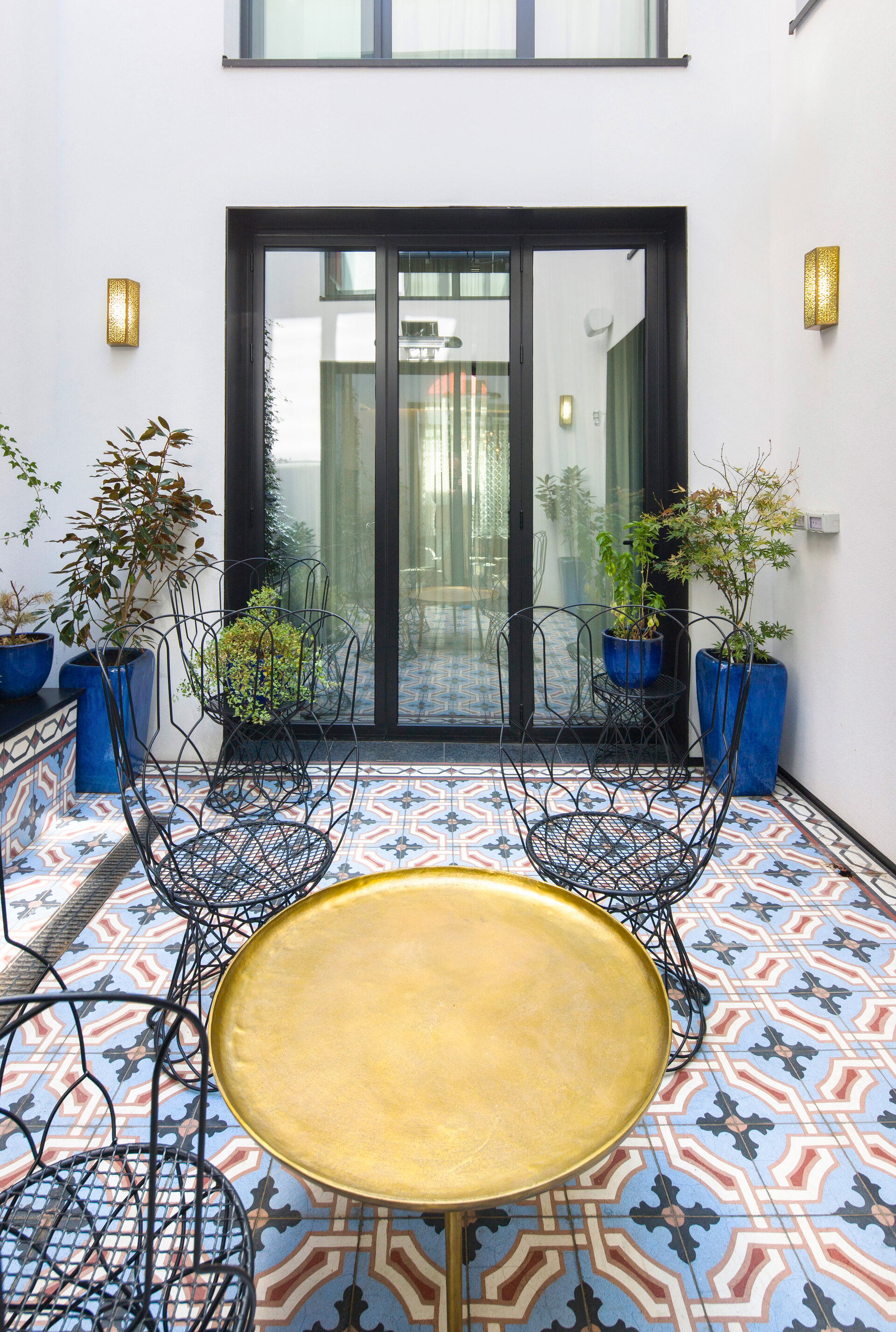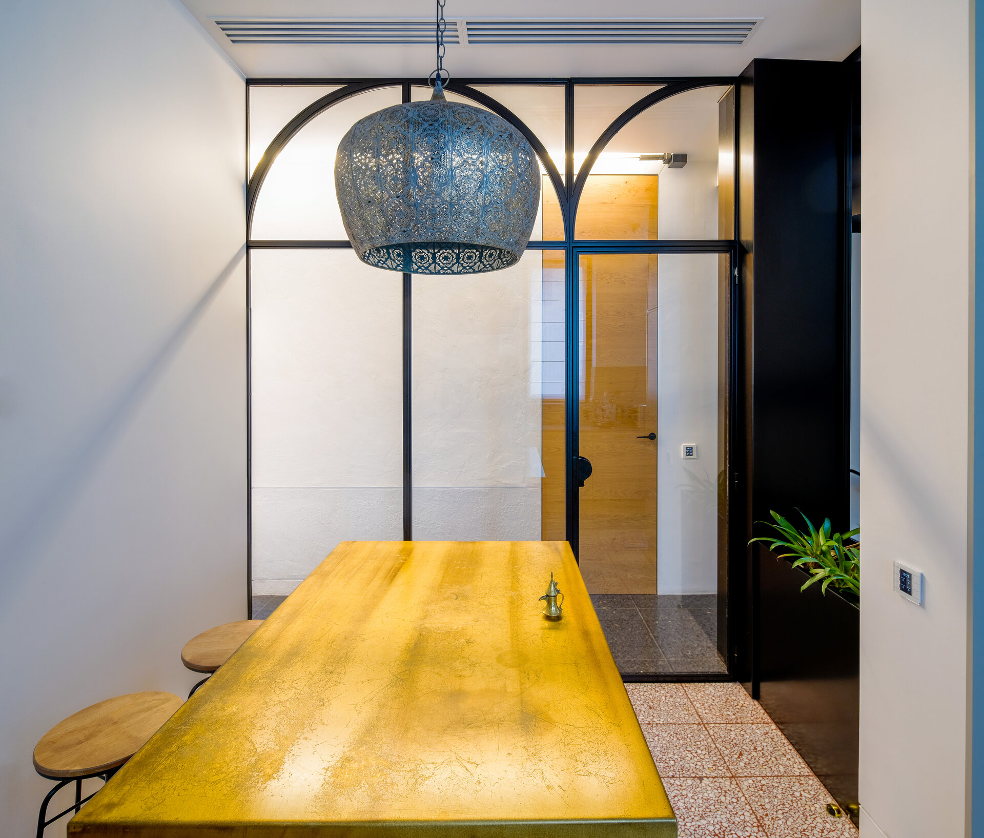 At the centre of the house is the inner courtyard—a “room” beneath the open sky, richly adorned with mosaic flooring, mirrors, and lush planting. Large windows open the interiors towards this courtyard, dissolving physical boundaries and creating the illusion of a spacious, continuous environment. Modern materials and detailing—recessed skirting boards, fine grooves, and slim timber inlays—are harmonised with traditional Moroccan techniques such as tadelakt plaster, giving the house a unique identity that lies somewhere between contemporary refinement and oriental reverie.