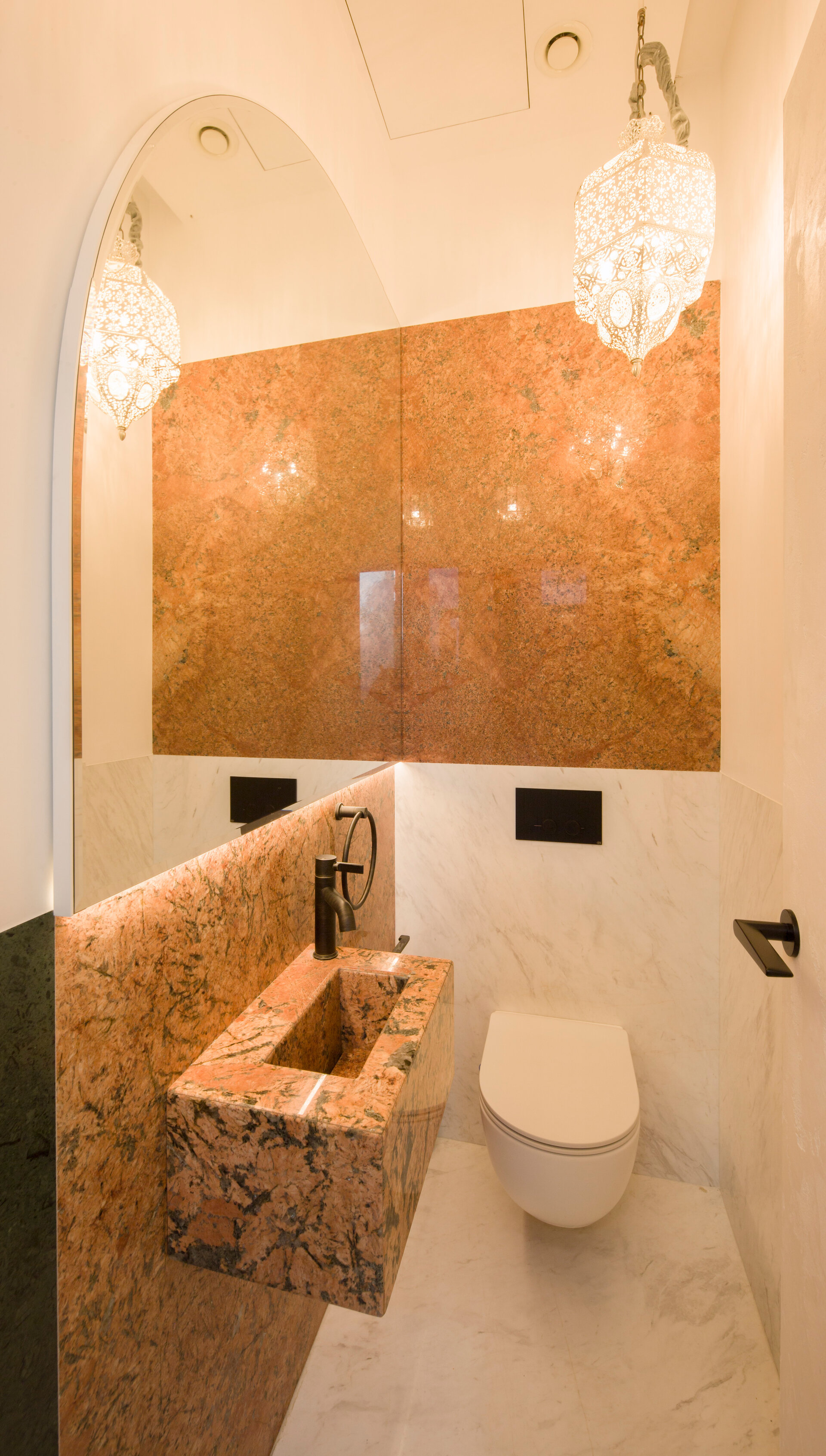 The concept was born from the client’s passion for Moroccan culture: vibrant colours, curved forms, softly filtered light, rich ornamentation, inner courtyards, and intricate latticework. These elements were reinterpreted, stylised, and woven into a coherent architectural language, telling a story that unfolds from the street façade all the way to the heart of the interior. The transition from the discreet, almost austere street-facing elevations to the colourful mosaic and filigree-like furniture at the core of the house is gentle, achieved through a carefully calibrated introduction of architectural details and colour. Two key elements unify the entire composition: the arch and the lattice screen.