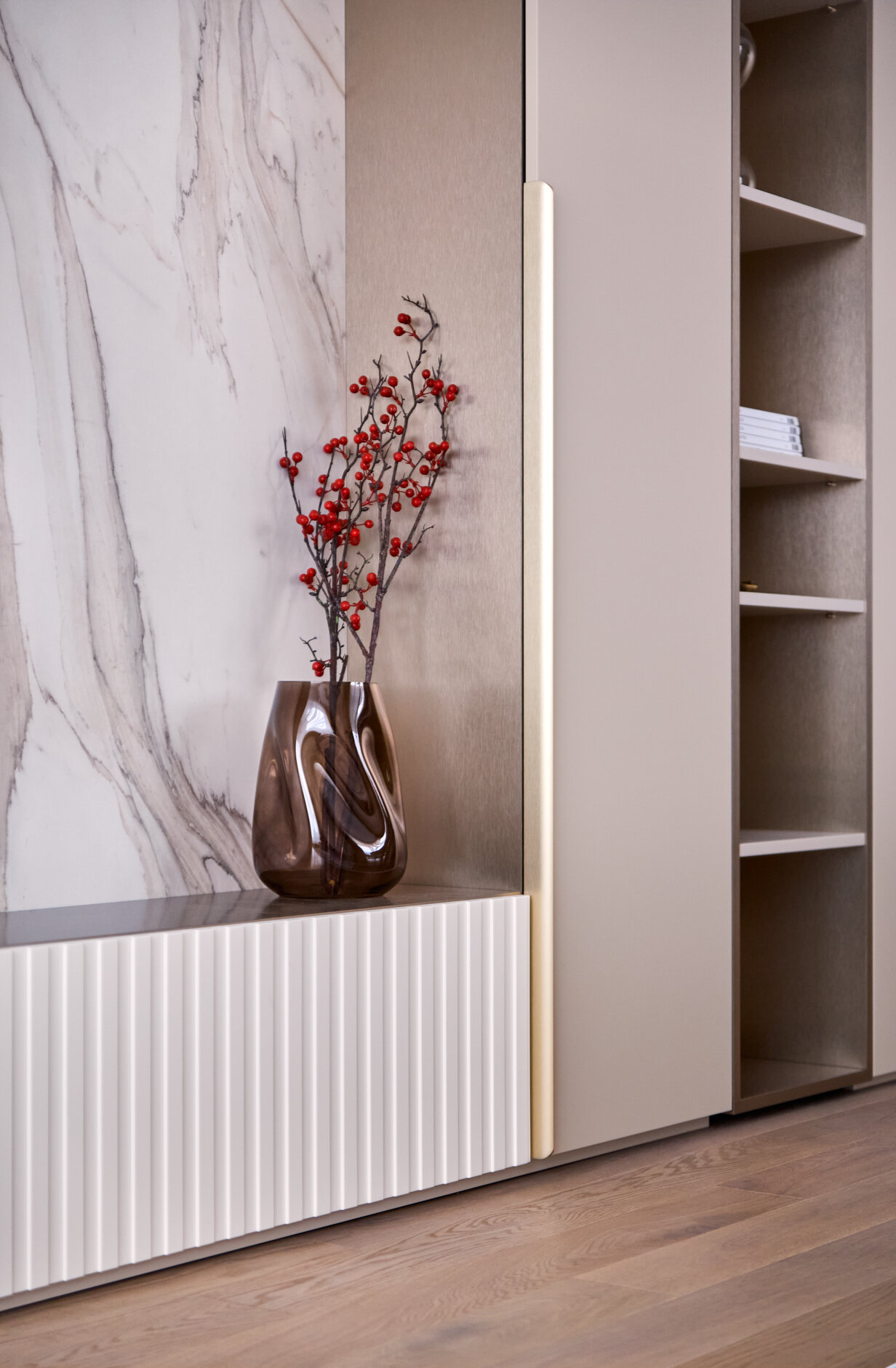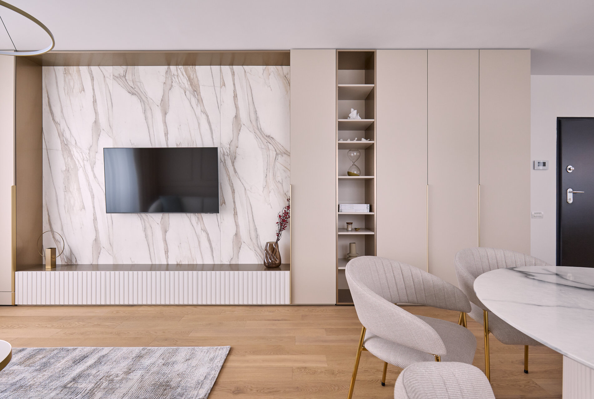 The main design challenge was organizing the open-space area, which combines the entrance hallway, kitchen, dining, and living area. Despite its generous footprint, the space’s narrow, elongated proportions made it particularly difficult to articulate clearly defined and functional zones. Our response was to design custom furniture that blends and anchors multiple functions. For instance, right next to the entrance we placed a bespoke unit that functions both as a TV cabinet and as essential storage for shoes, coats, and accessories.