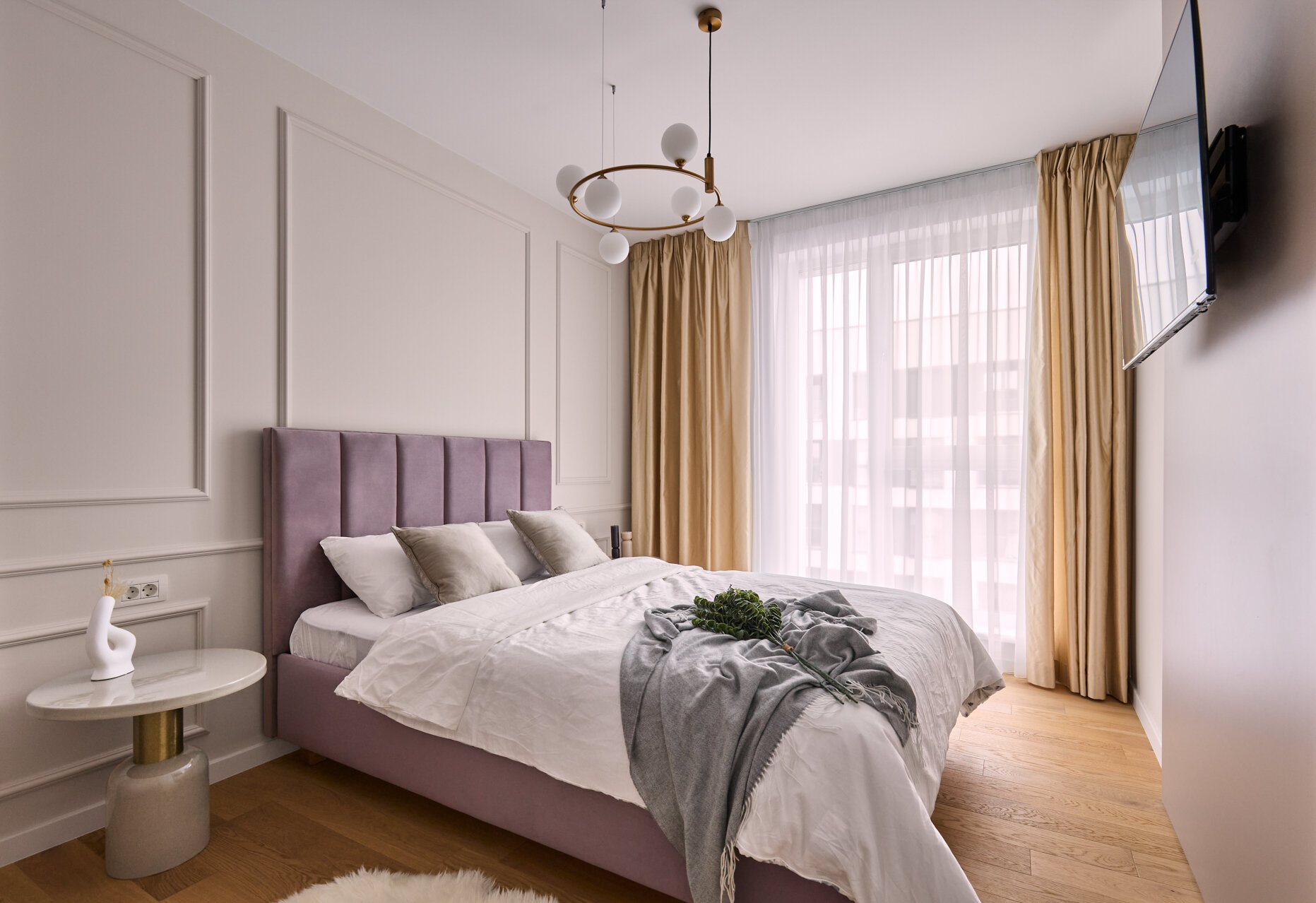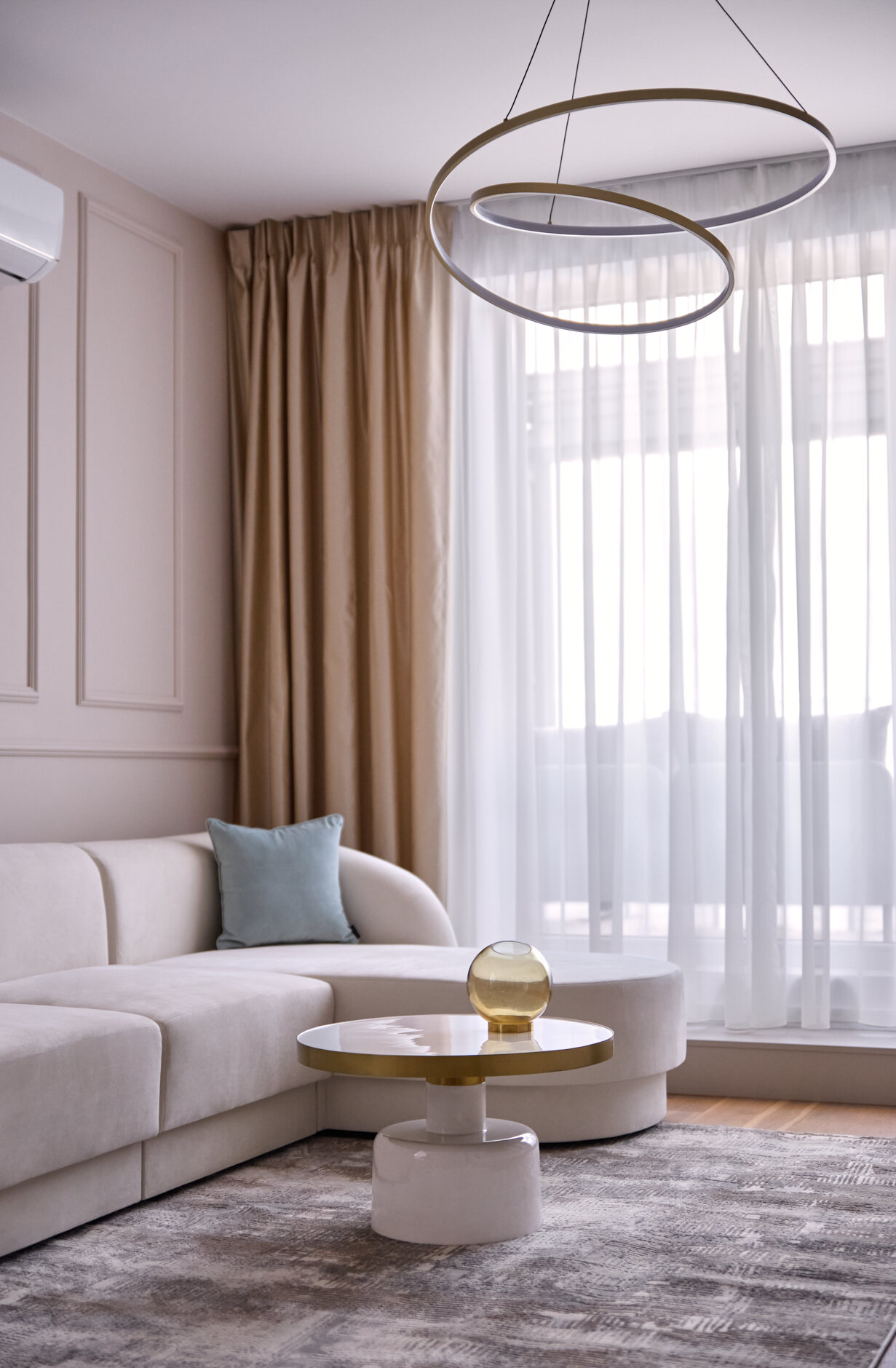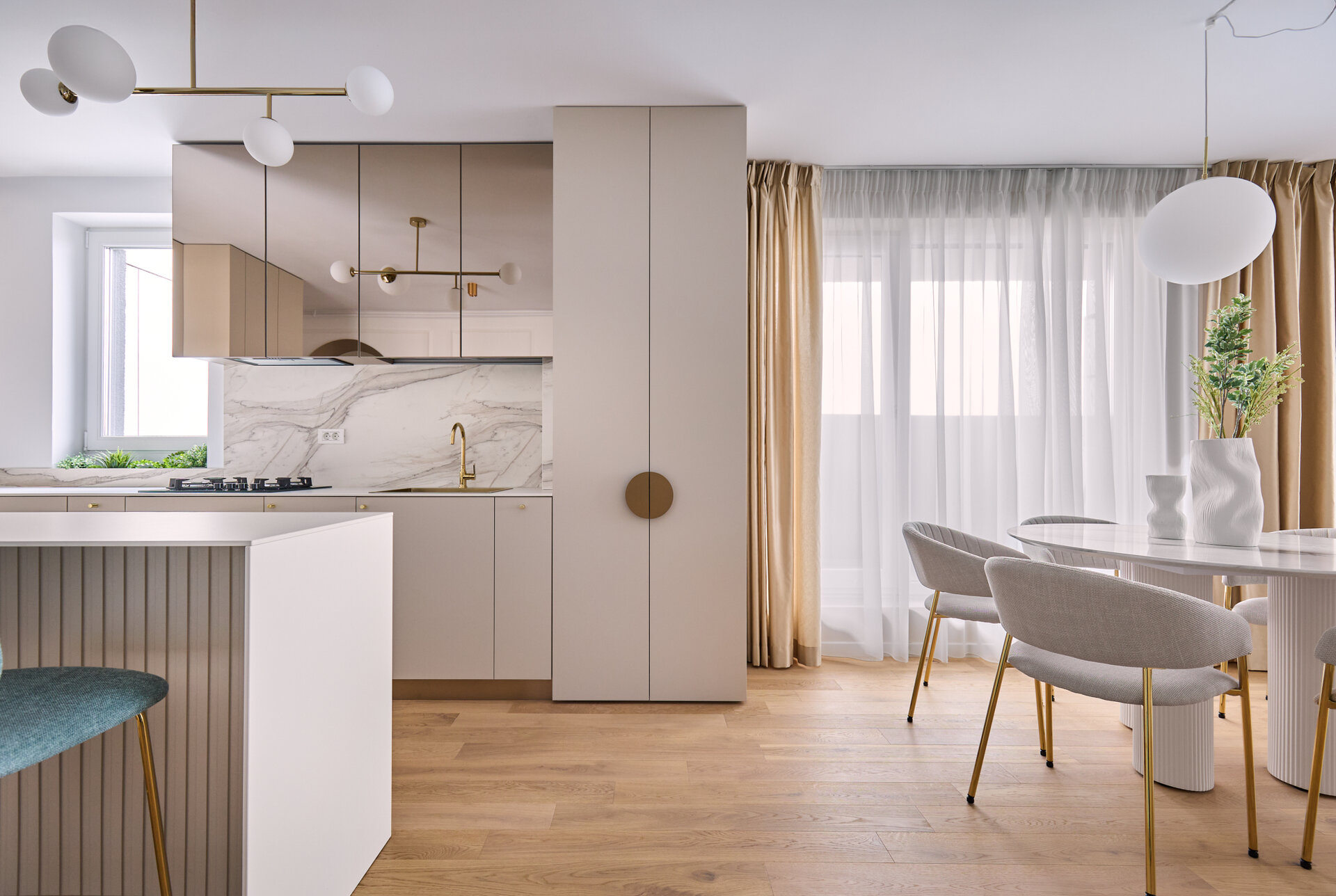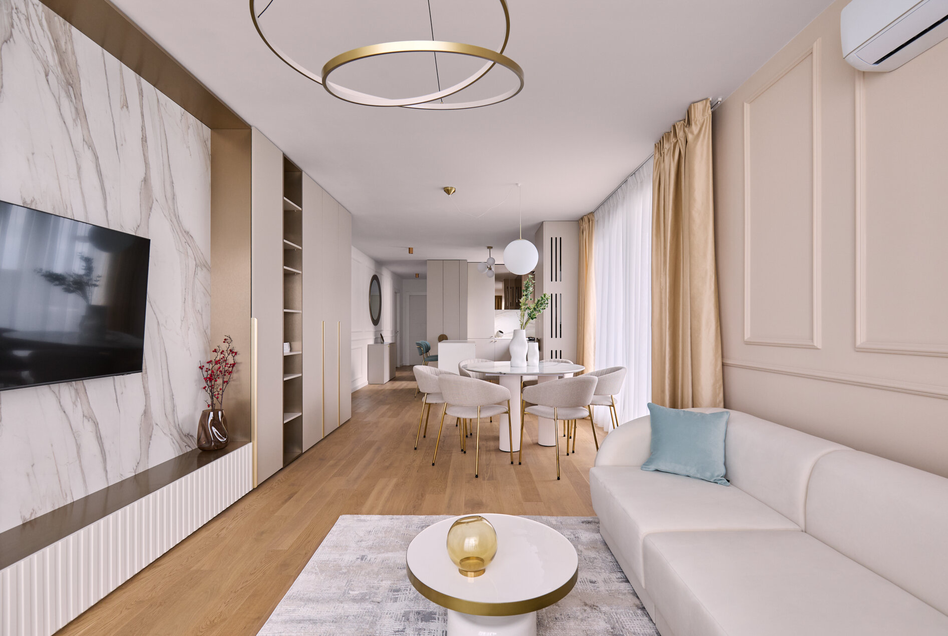 This project involved the interior design of a three-room apartment with a generous terrace, located in a newly built residential complex in Bucharest. The client – a young dental practitioner – envisioned an elegant, feminine, and bright interior, incorporating classical references subtly reinterpreted through a contemporary lens.