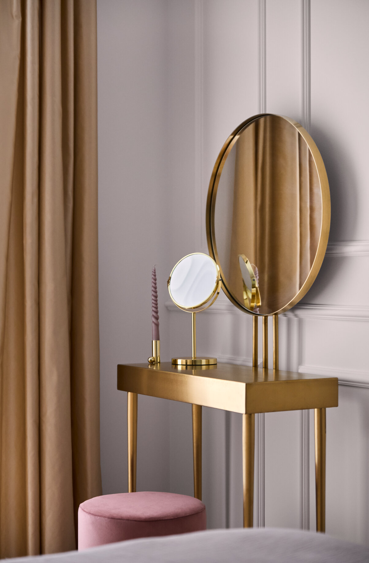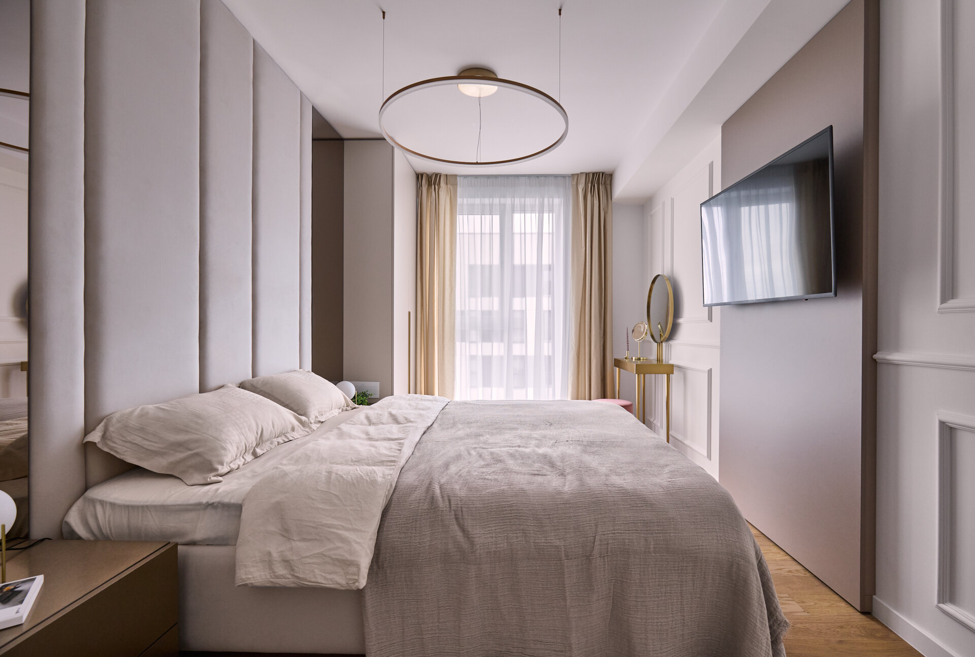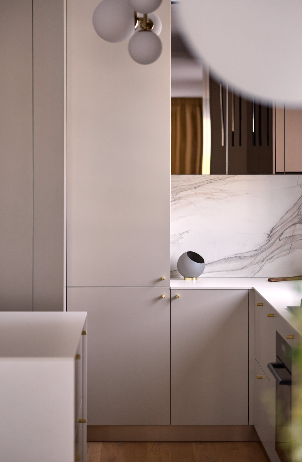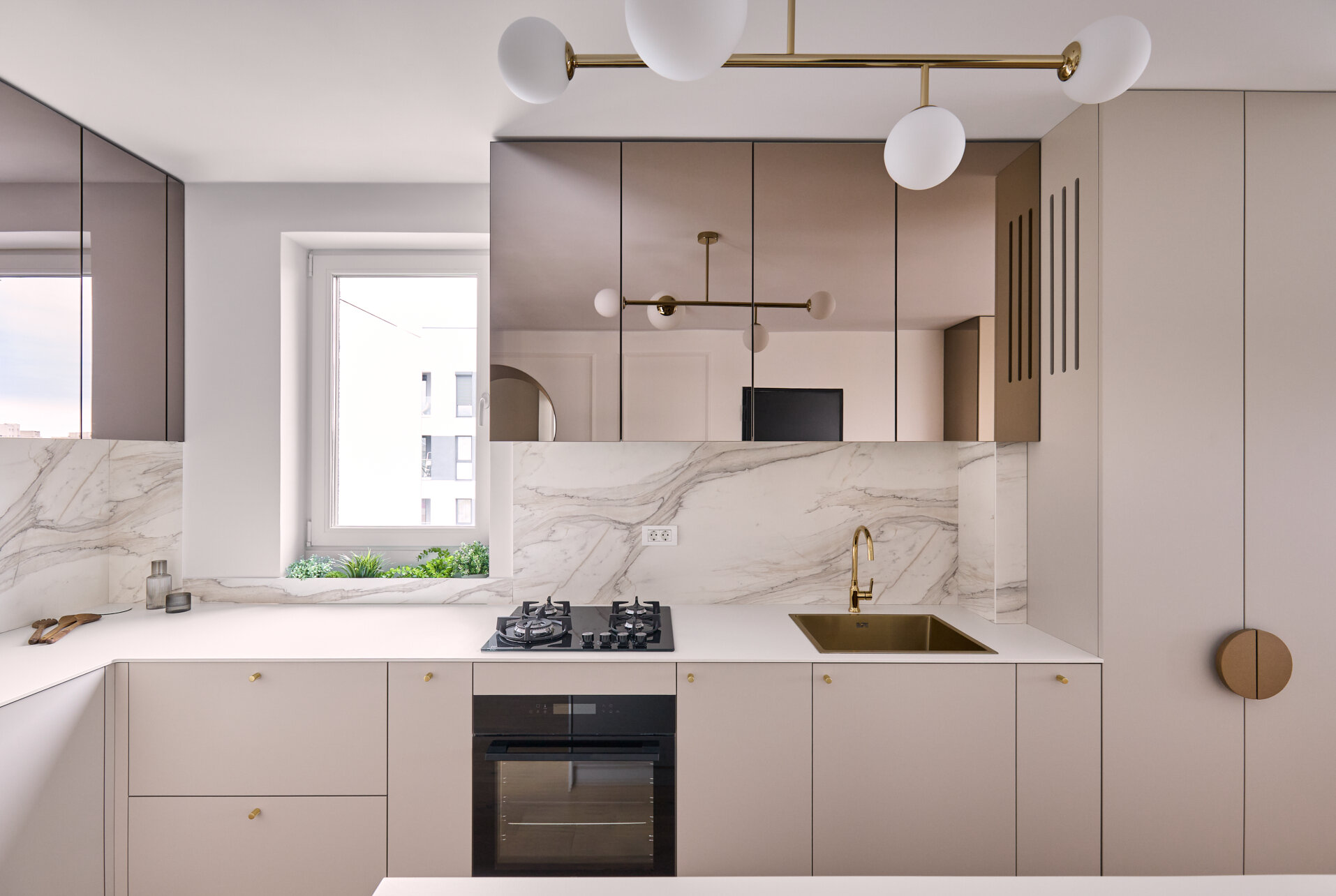 To reflect these intentions, we integrated decorative wall moldings on key surfaces, used white marble with subtle veining (behind the TV and as kitchen backsplash), added golden accents, and introduced a recurring compositional motif: the circle – echoed in the mirrors, cabinet handles, and select light fixtures.