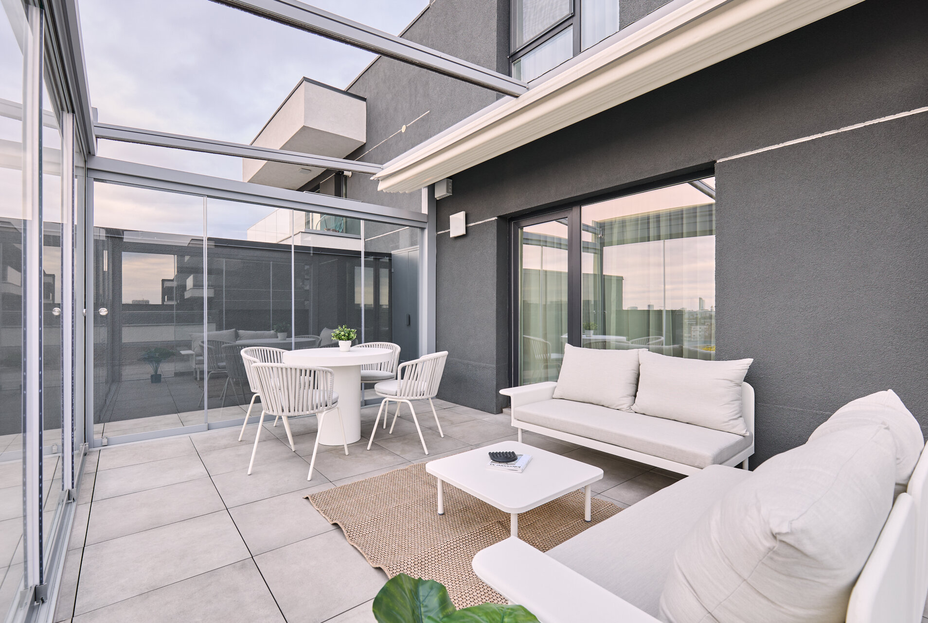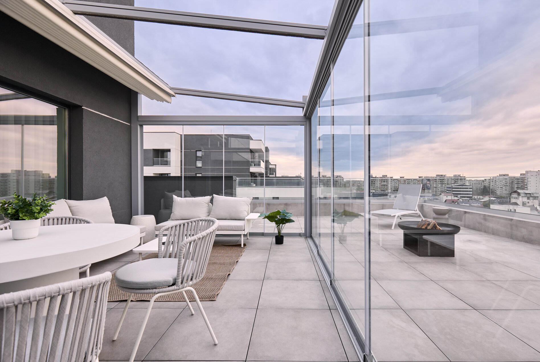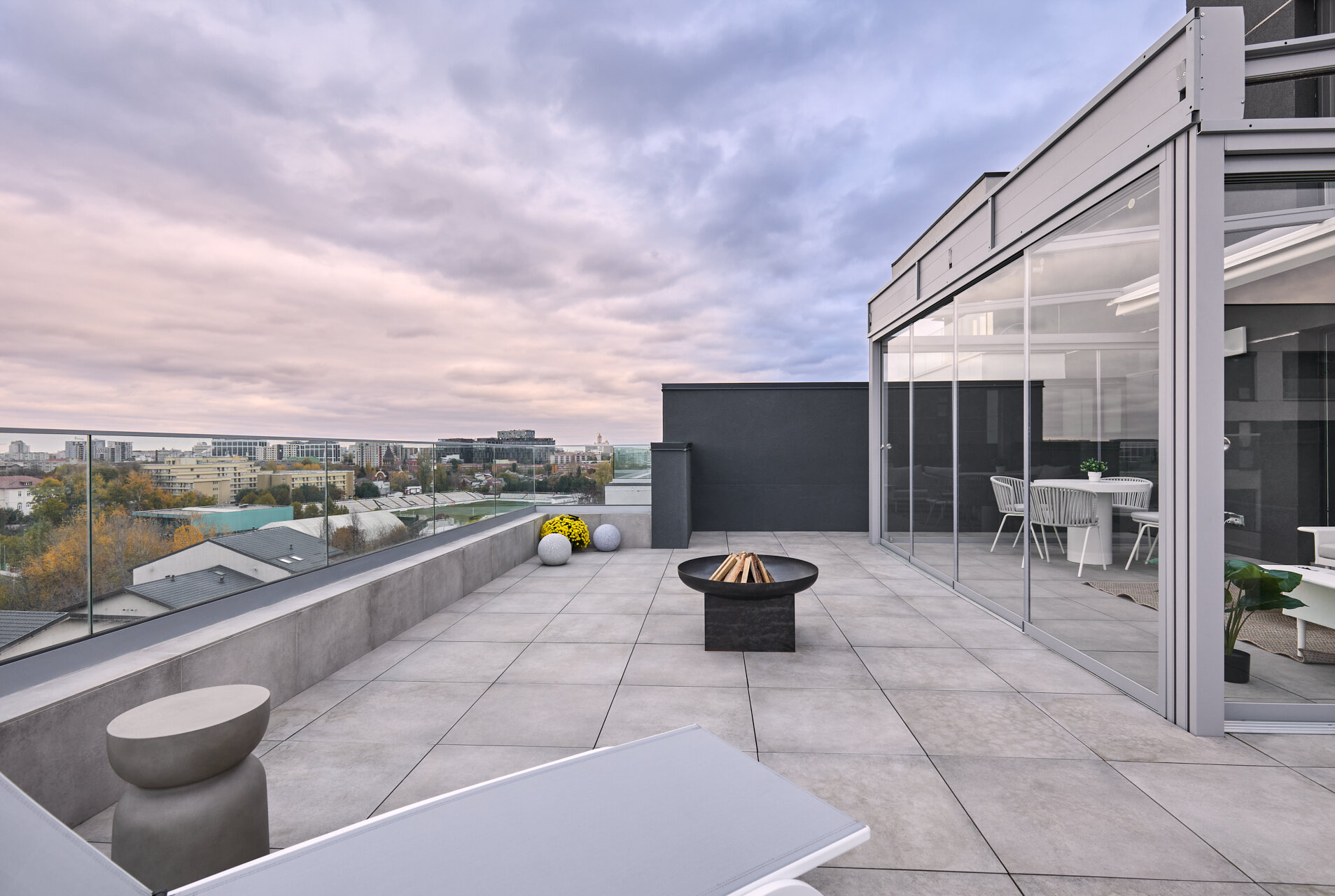 The generous terrace was designed for year-round use, enclosed with glass panels and covered by a pergola – an extension of the interior living area, regardless of season.
