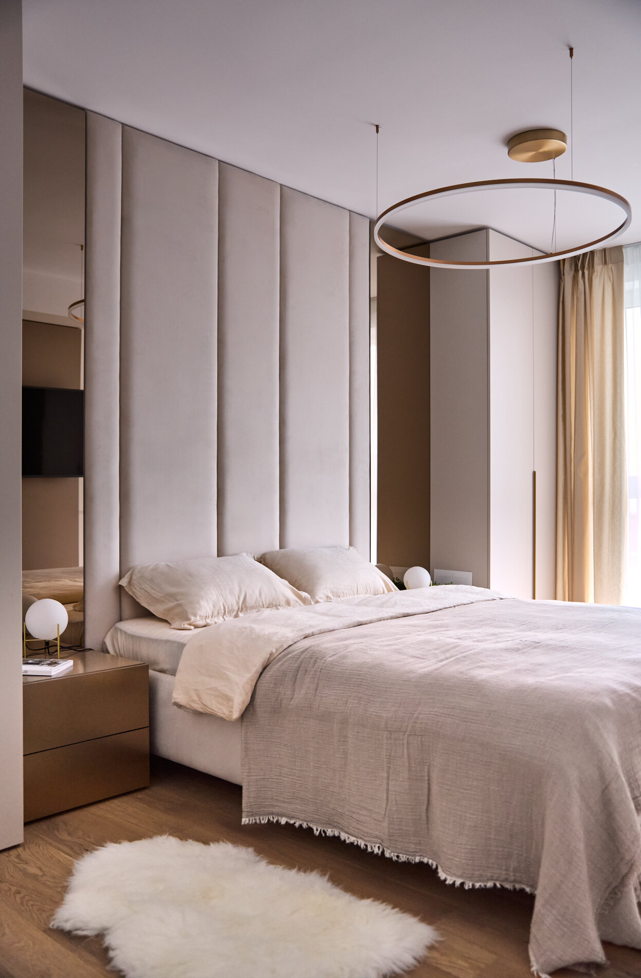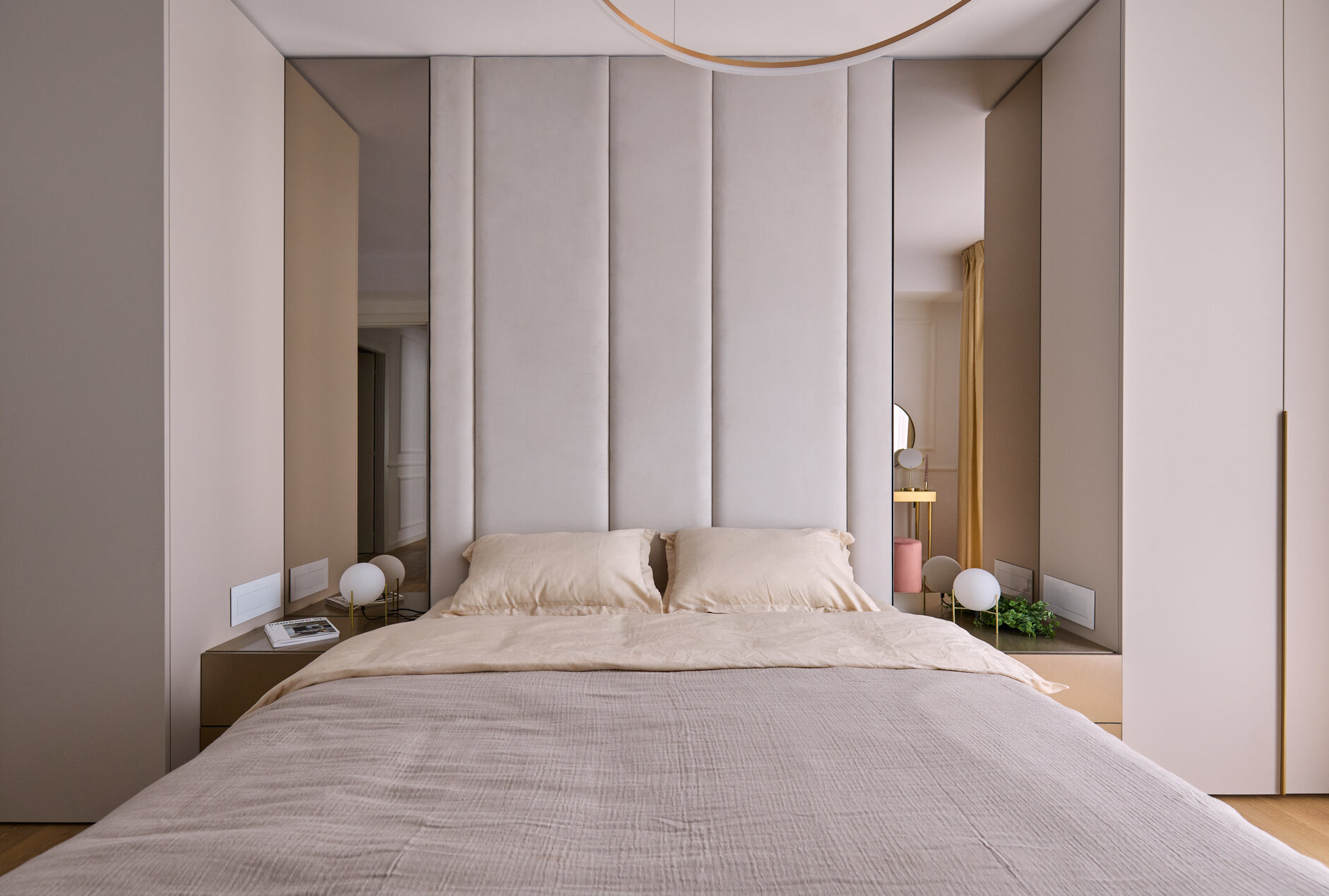 In the master bedroom, we reconfigured circulation, eliminating the walkthrough dressing area and relocating the wardrobe to the long wall beside the bed. The headboard extends full height, upholstered in the same tone as the custom-furniture, creating visual cohesion. Nightstands finished in bronze seem to merge seamlessly into vertical cognac-toned mirrors, a detail echoed from the living area.