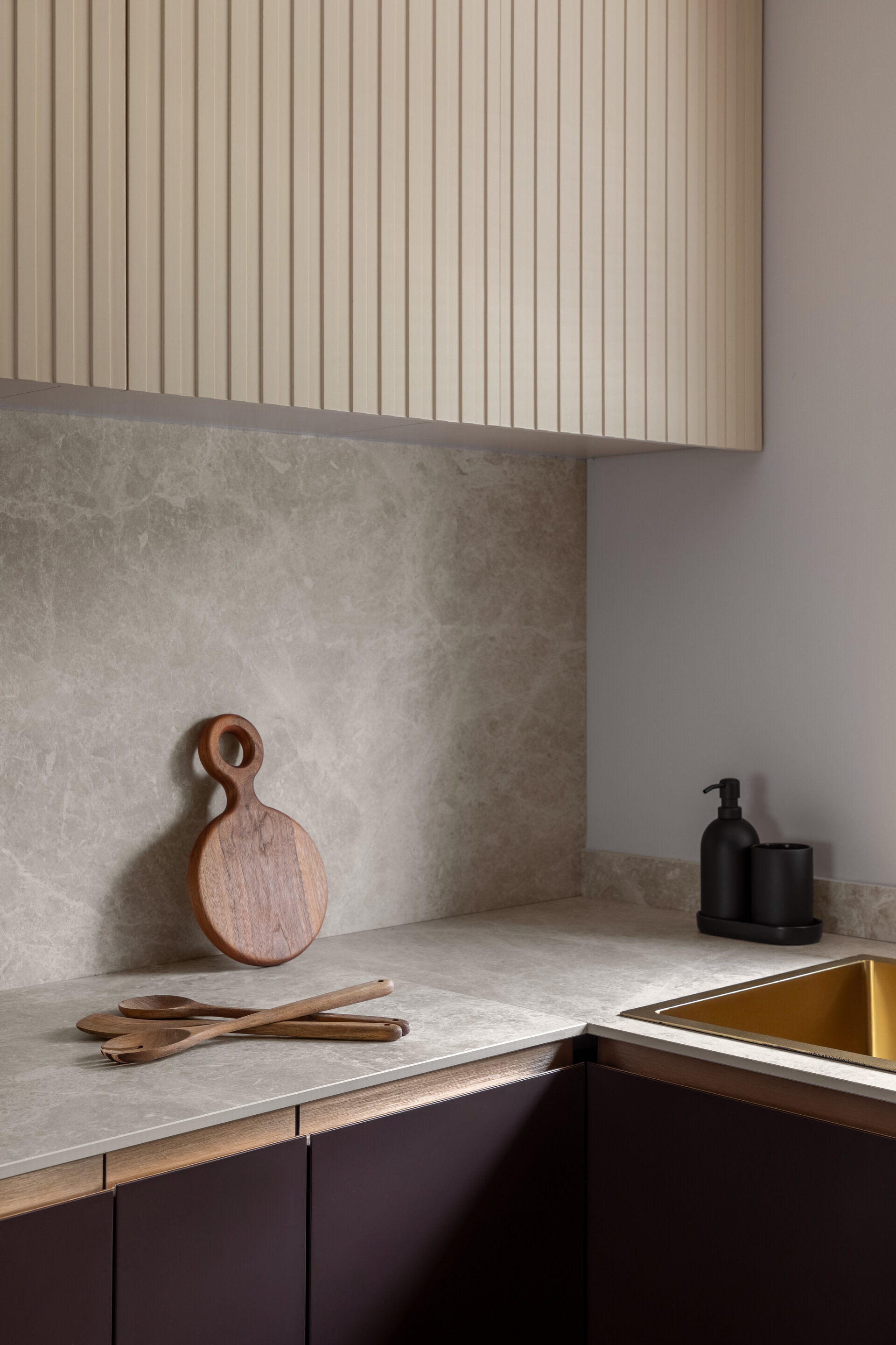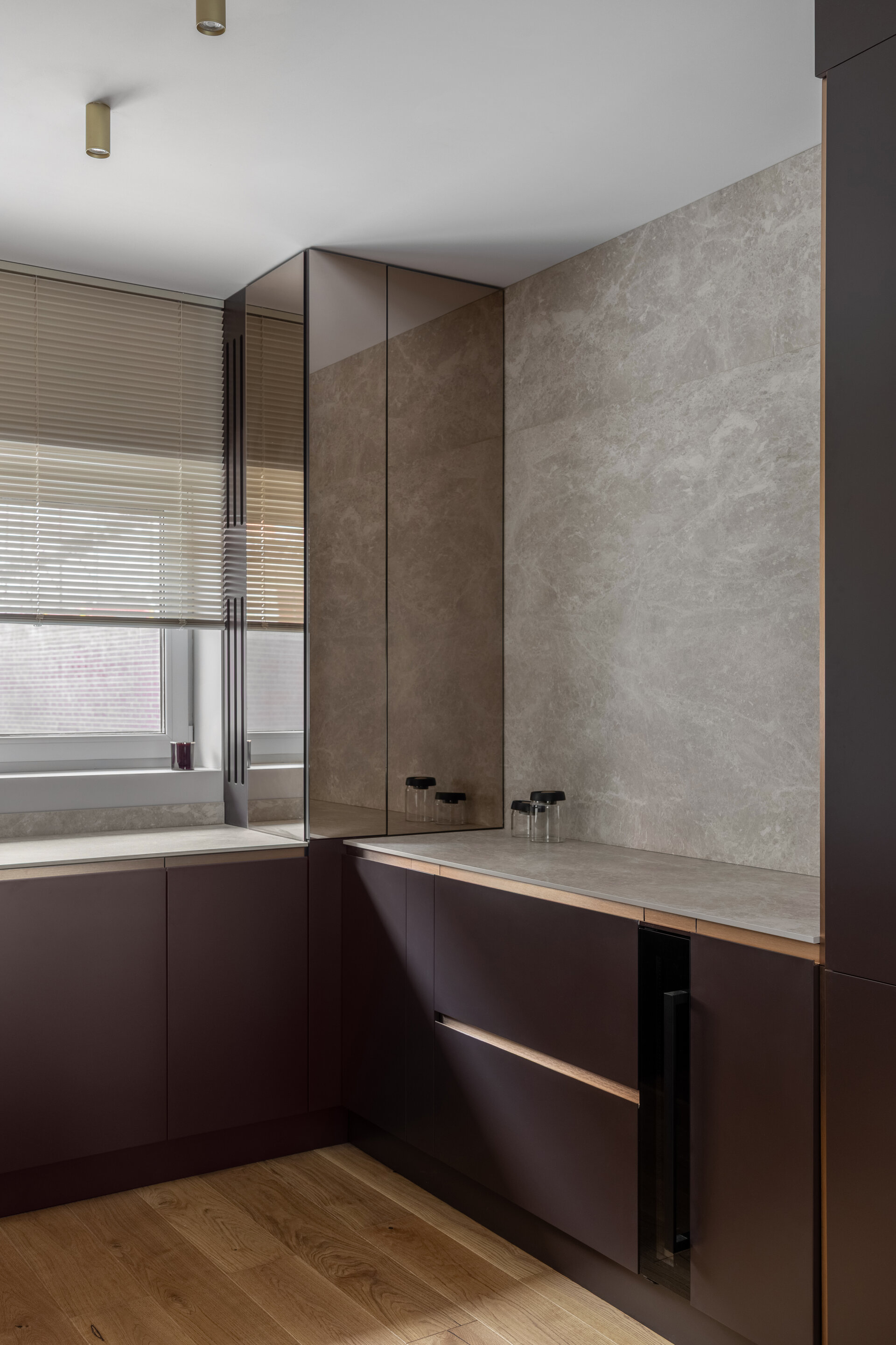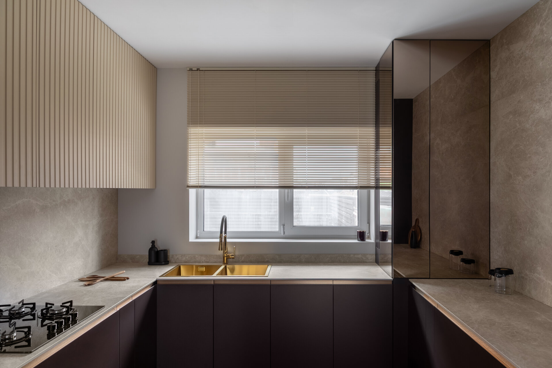 The kitchen was entirely custom-built using matte lacquered MDF, with golden handles routed directly into the cabinet fronts for a seamless look. To minimize the visual impact of the large boiler servicing the entire home, we clad the corresponding tall cabinet in cognac-tinted mirror – a solution that adds both depth and refinement to the space.