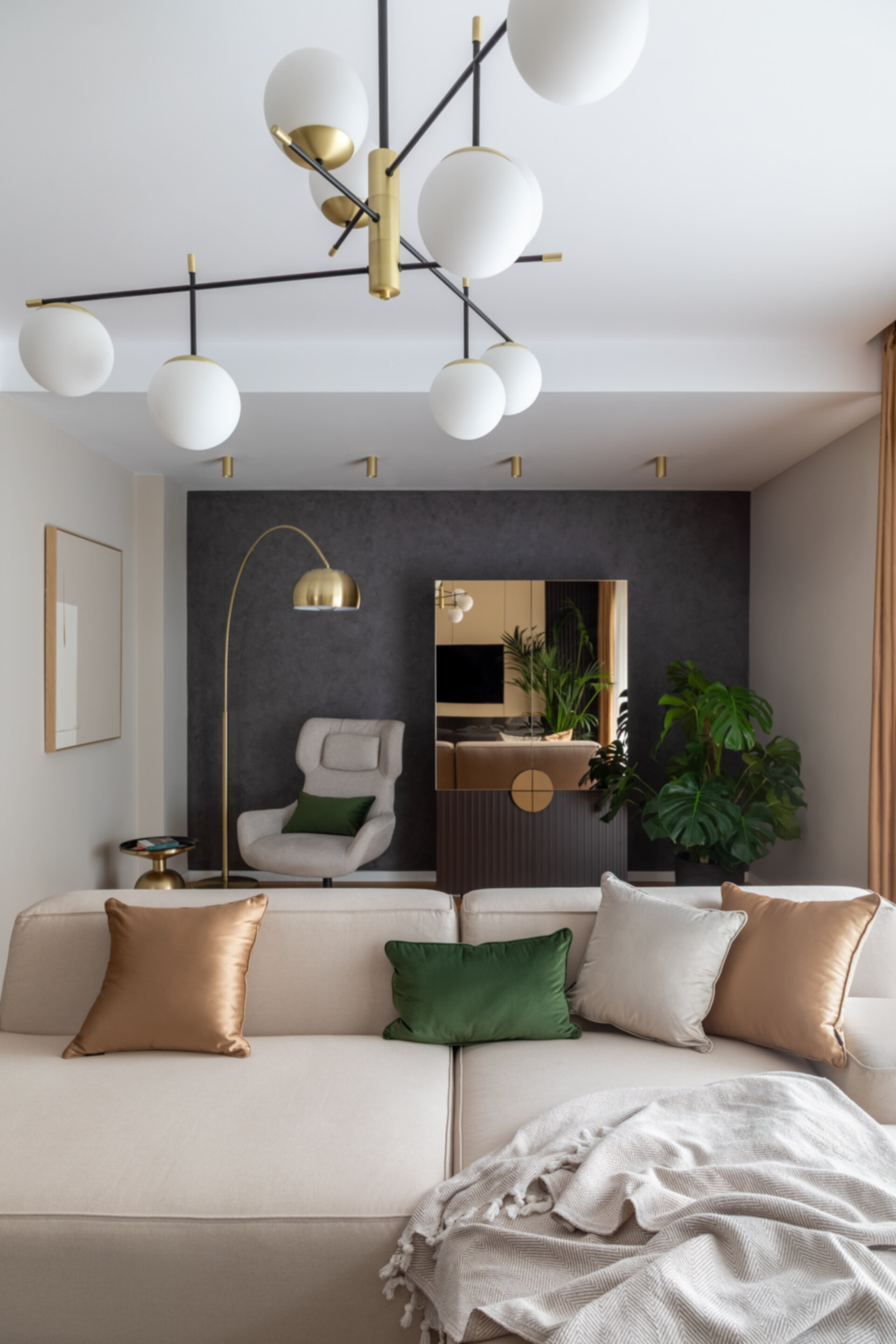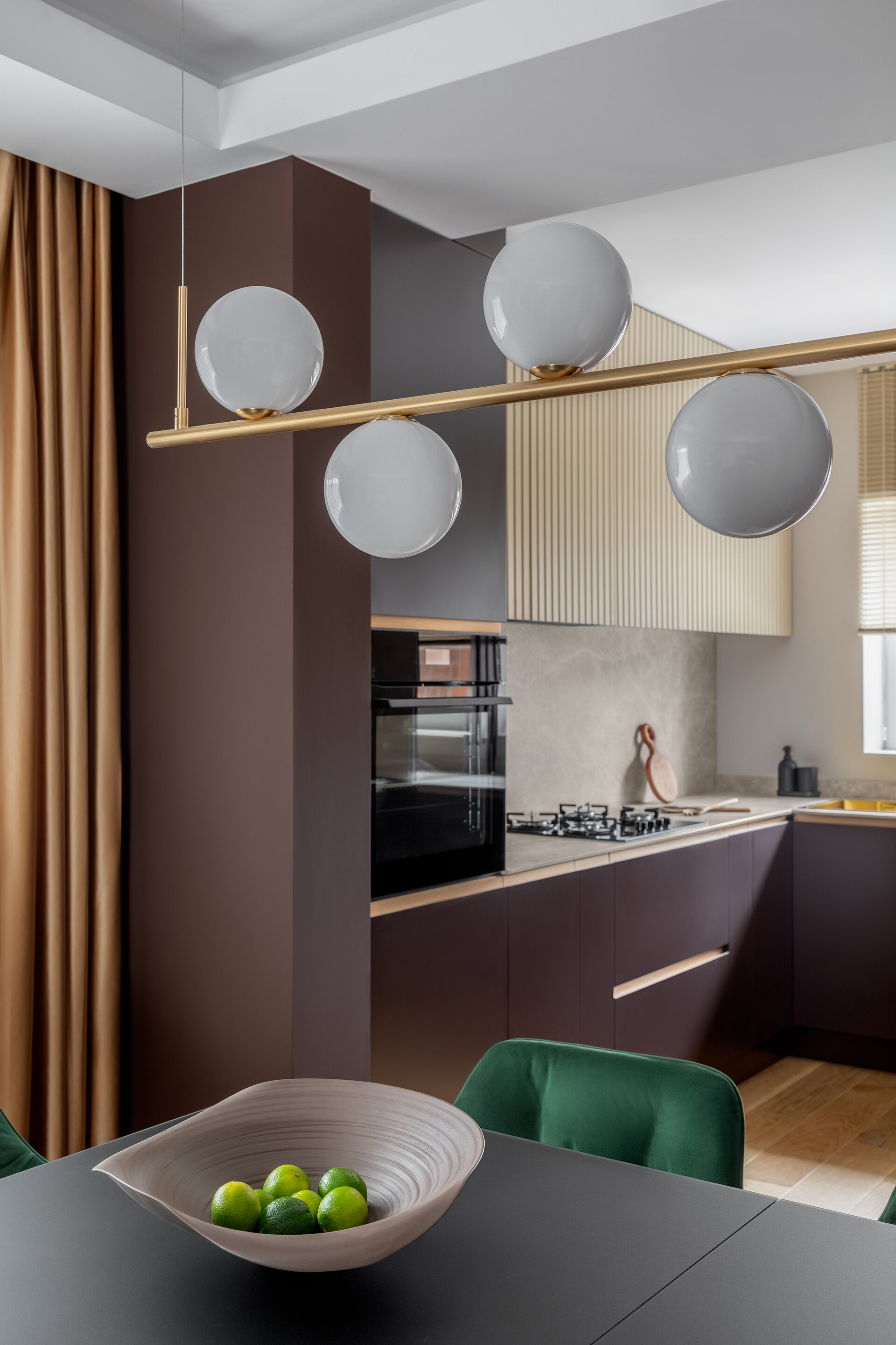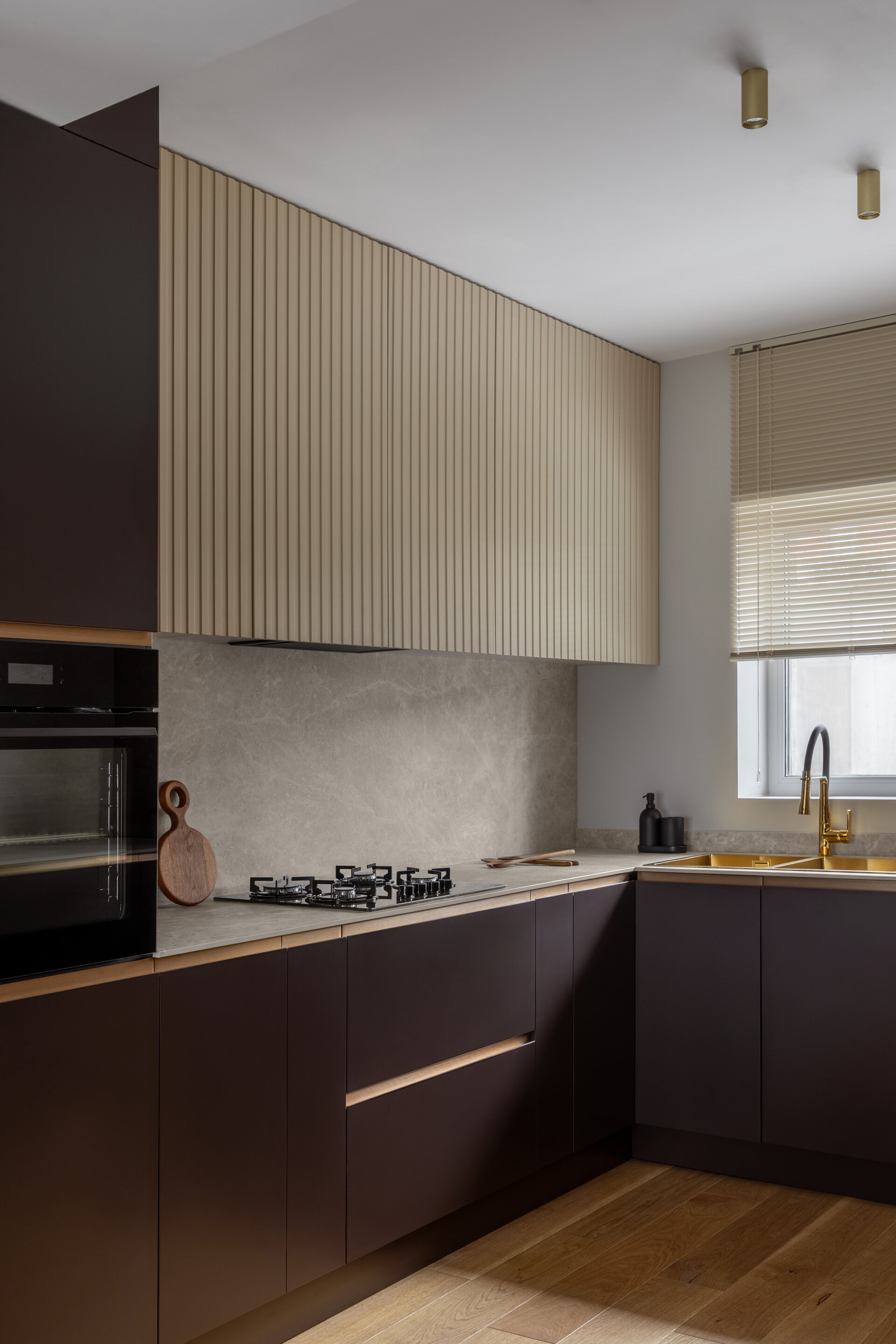 The kitchen was entirely custom-built using matte lacquered MDF, with golden handles routed directly into the cabinet fronts for a seamless look. To minimize the visual impact of the large boiler servicing the entire home, we clad the corresponding tall cabinet in cognac-tinted mirror – a solution that adds both depth and refinement to the space.