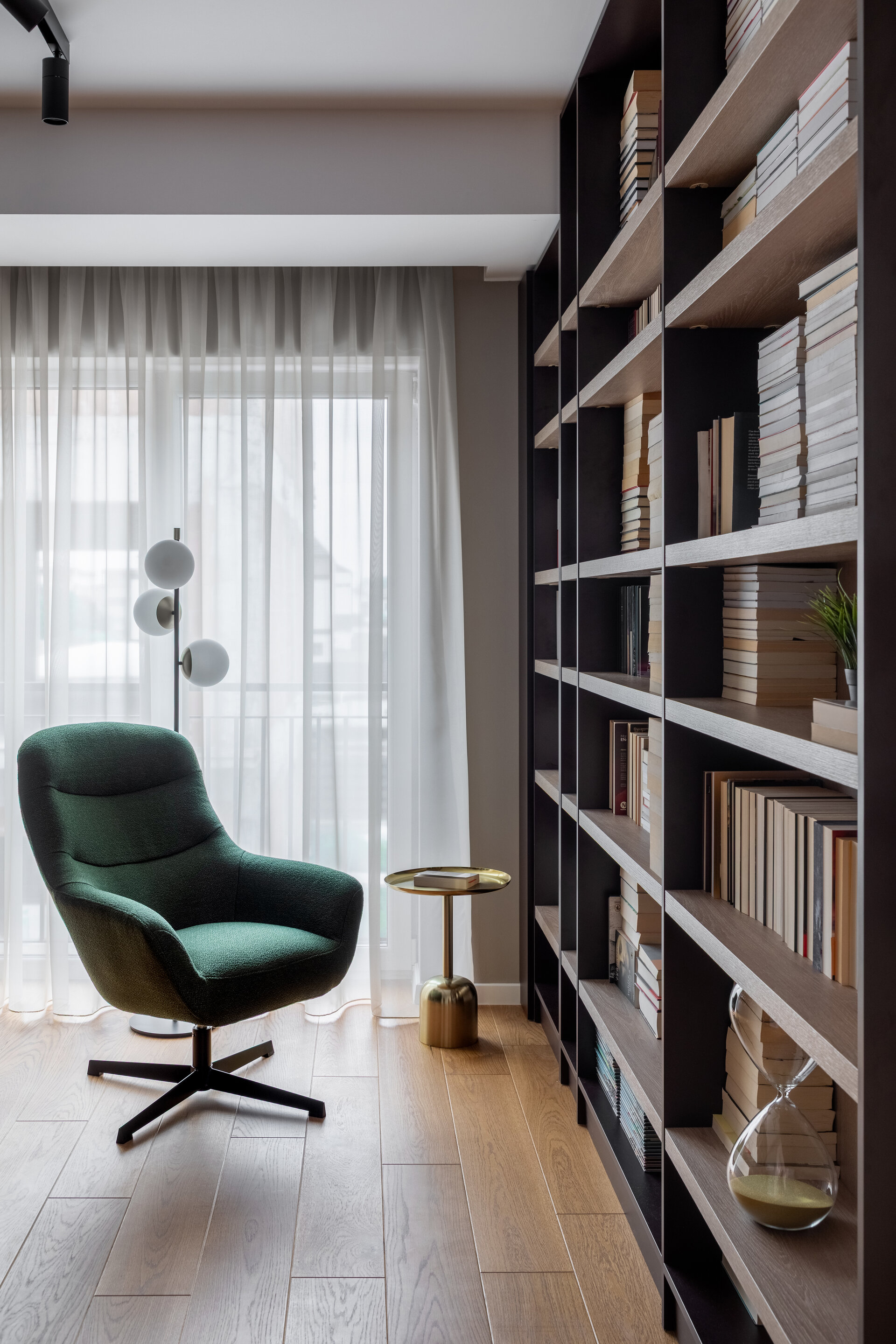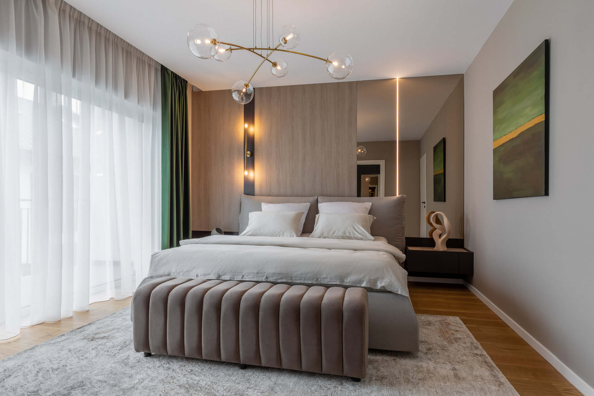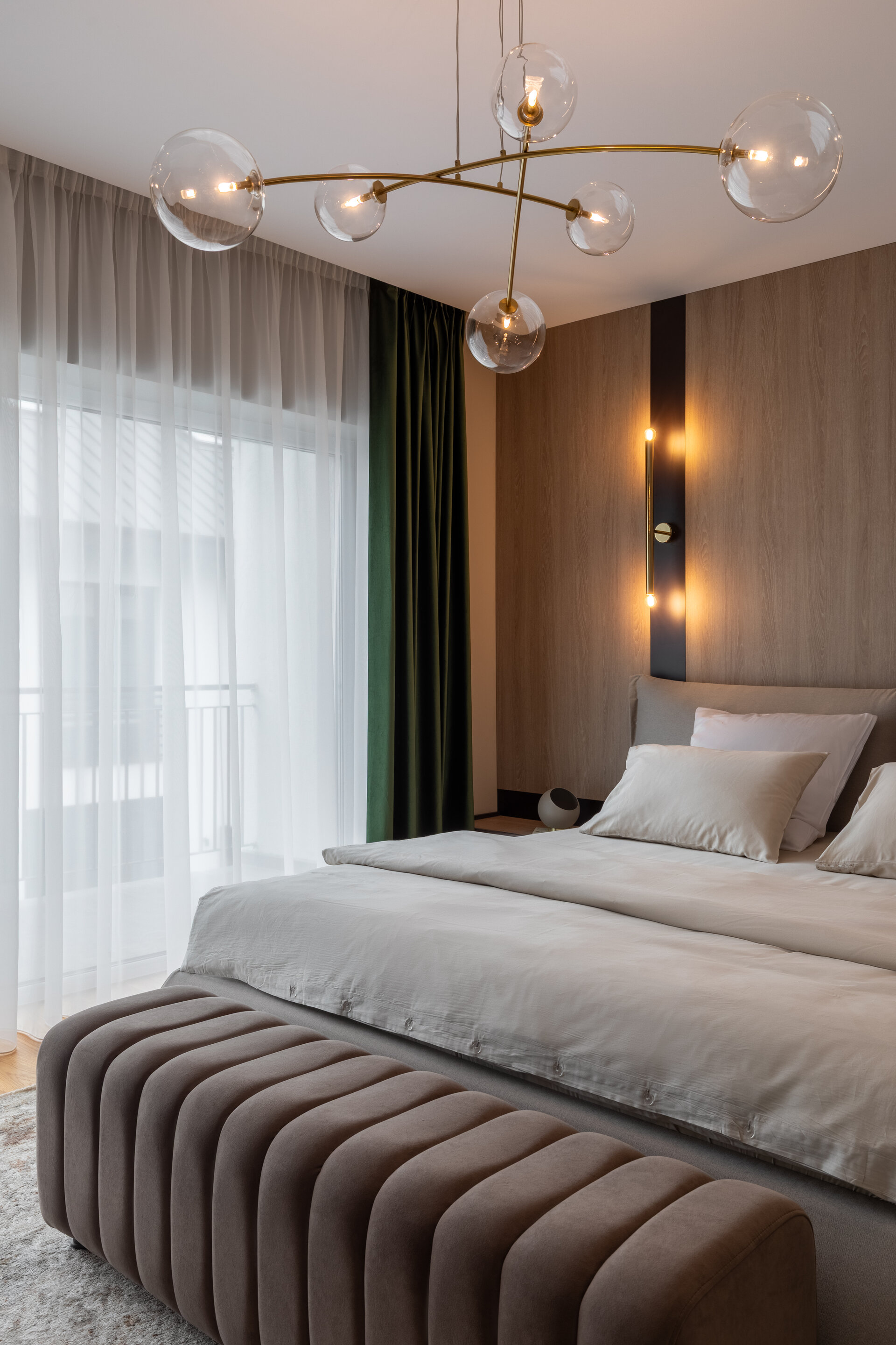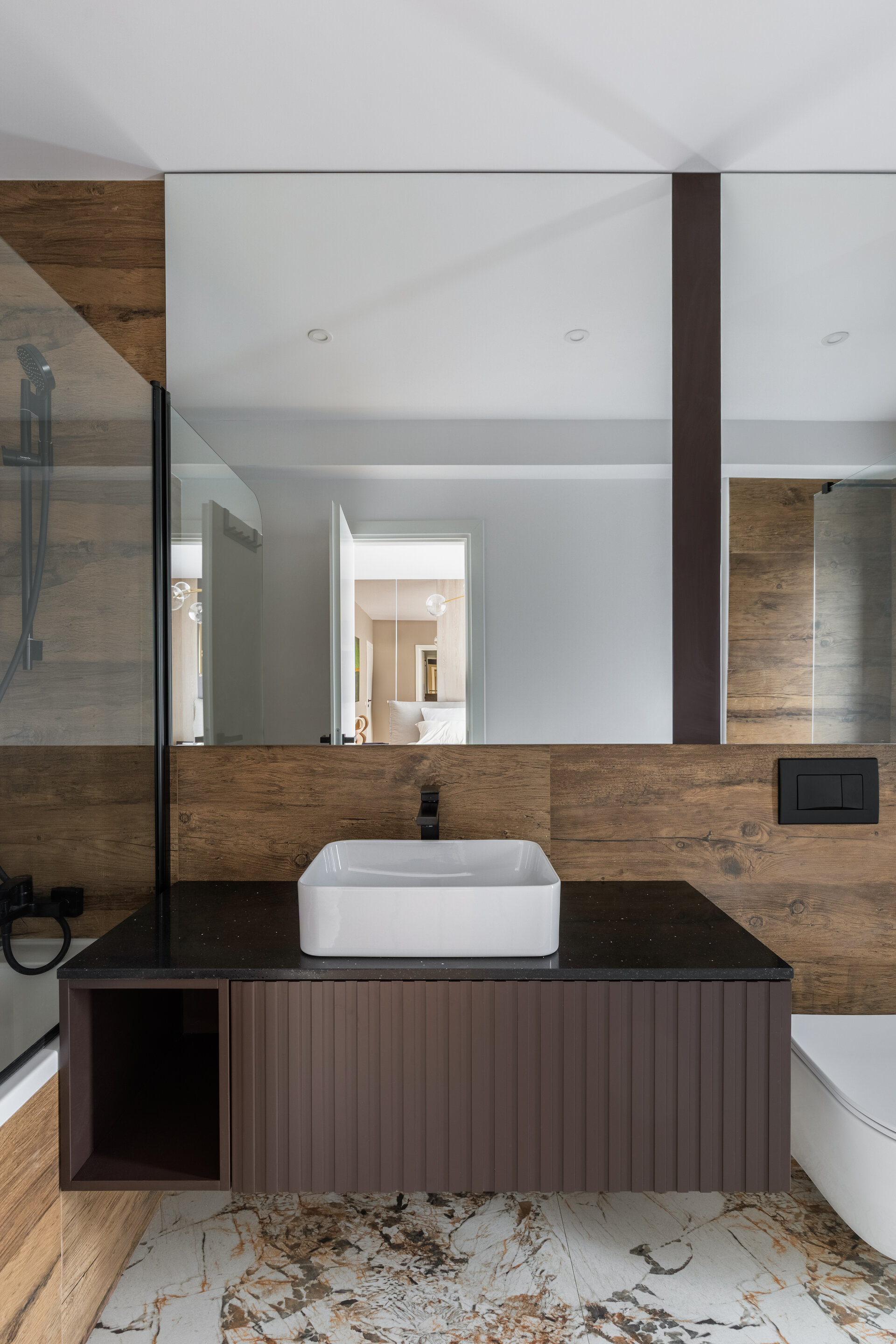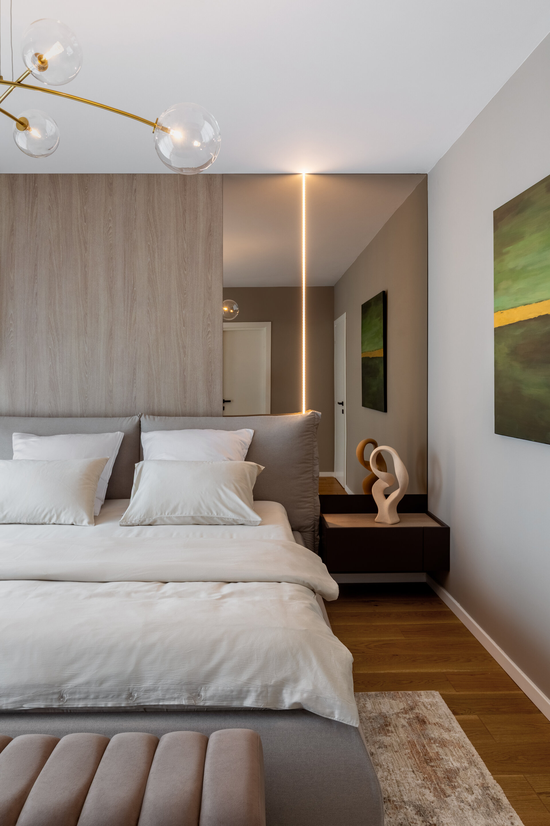 The first floor is dedicated to the sleeping area and includes the primary bedroom with en-suite bathroom, a guest bedroom, a secondary bathroom, and a room converted into a home library. In the master bedroom, the wall behind the bed becomes the focal point, treated as a full-height composition of wood cladding, an integrated LED strip acting as a bedside light, and a cognac mirror that brings depth and continuity to the design language established downstairs.