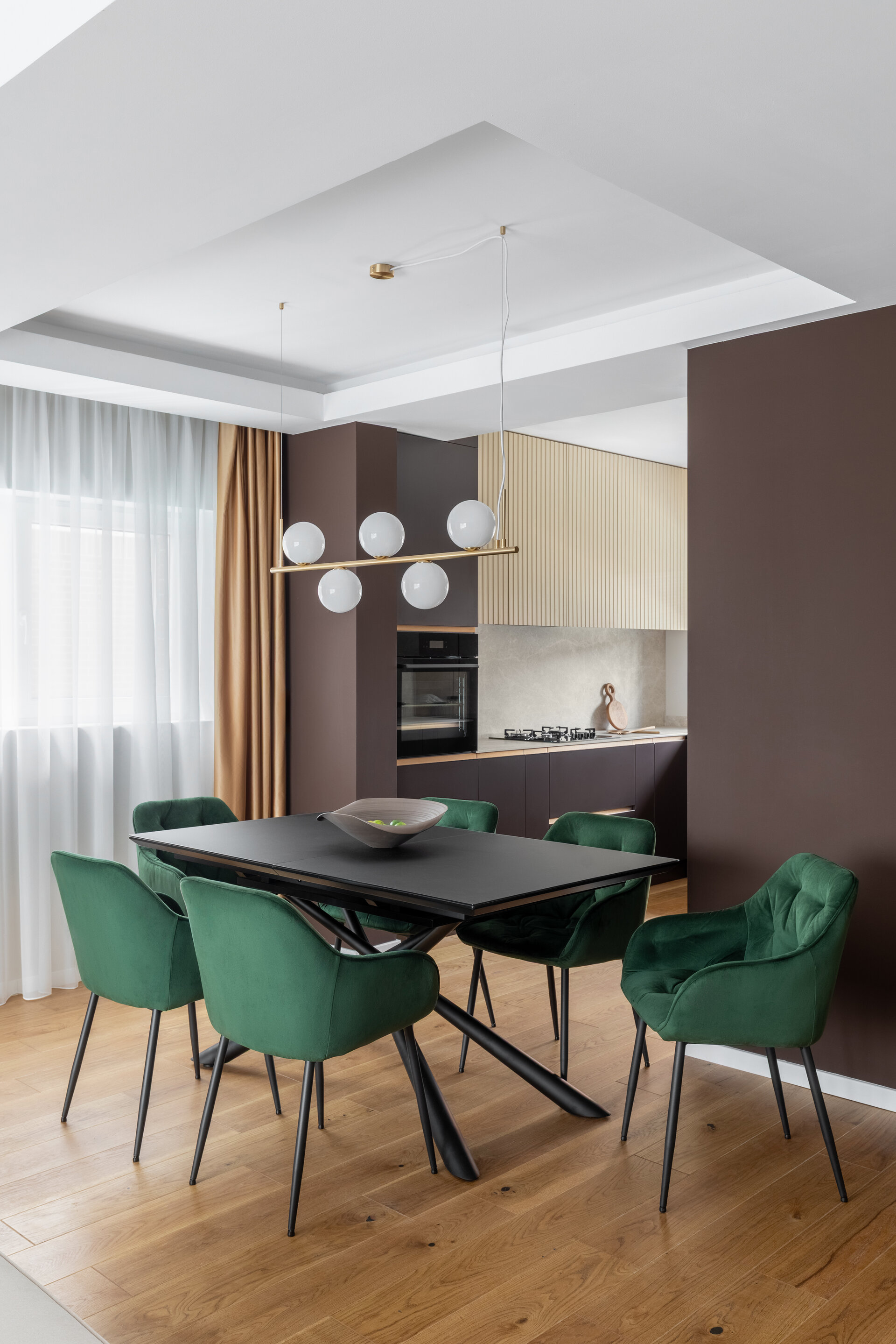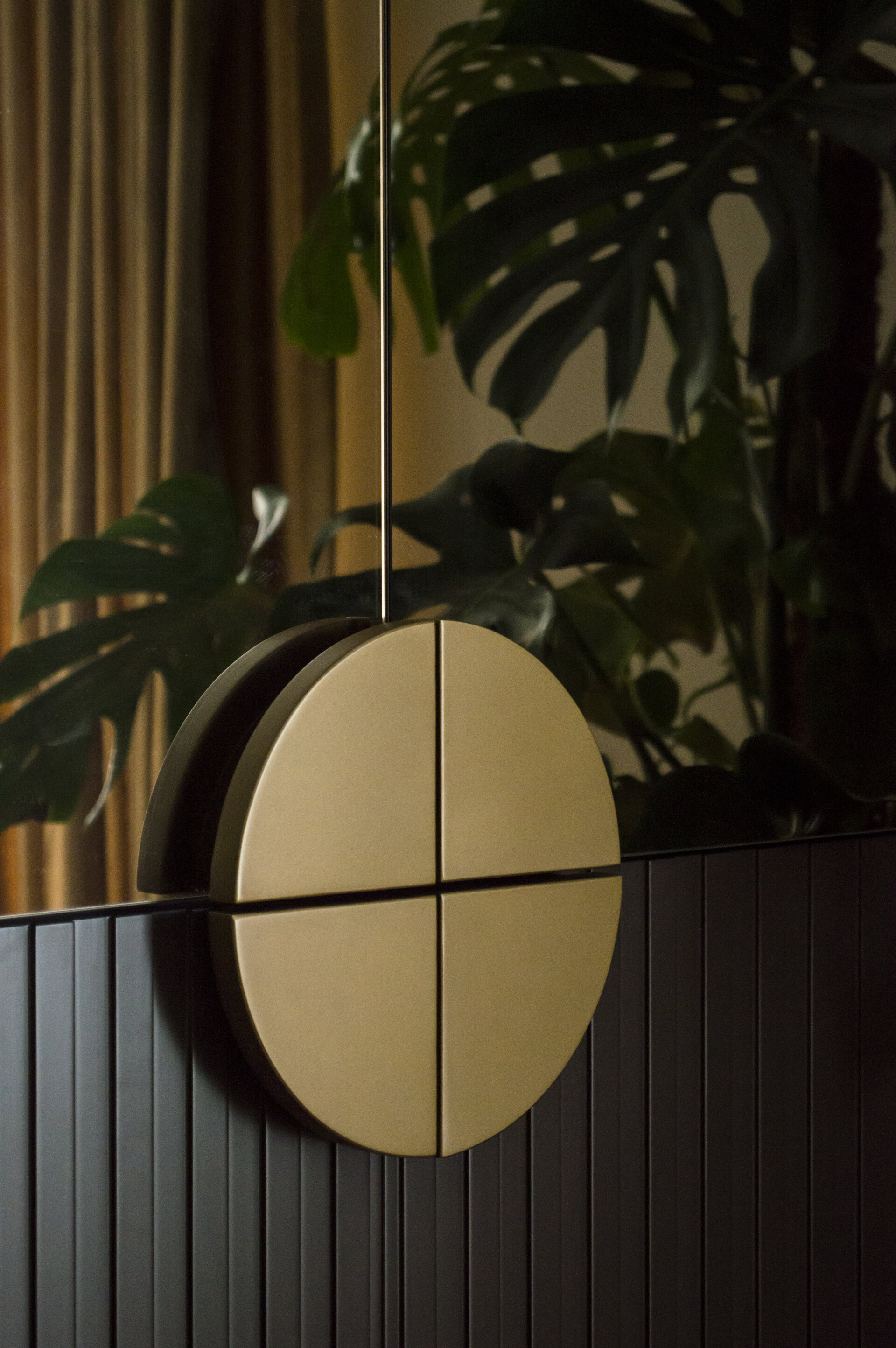 The client’s brief was clear: an elegant atmosphere, dominated by dark tones – especially warm brown hues – with green accents and golden touches. Around this chromatic palette, we developed a coherent visual language, where the circle motif – subtly reinterpreted in volumes, handles, mirrors, and lighting fixtures – ensures a discreet yet consistent thread throughout the entire interior.