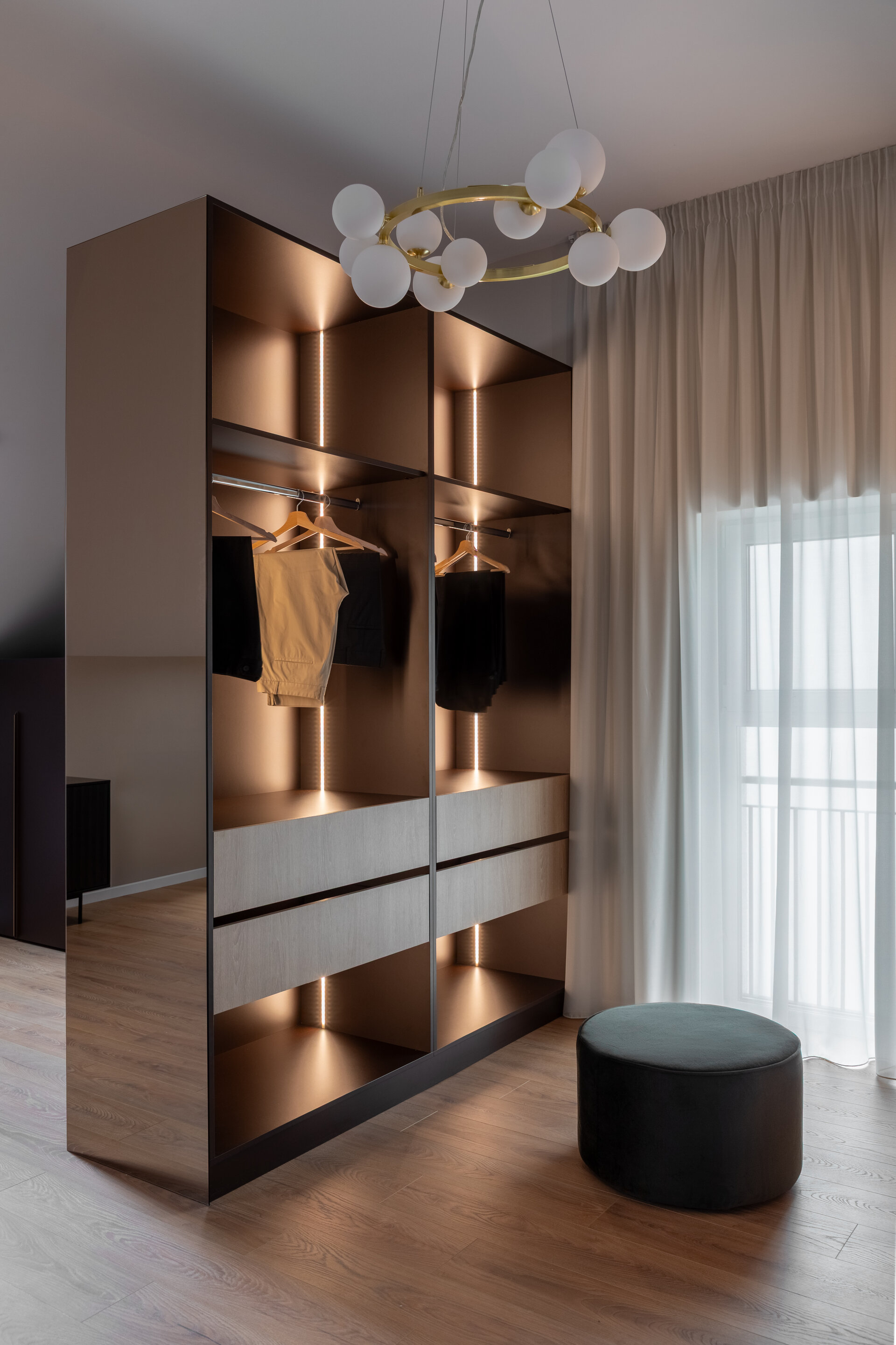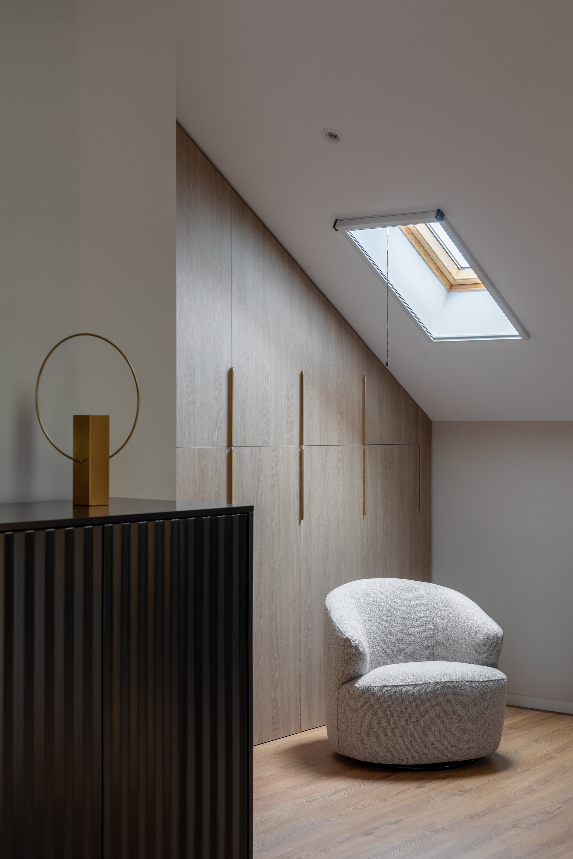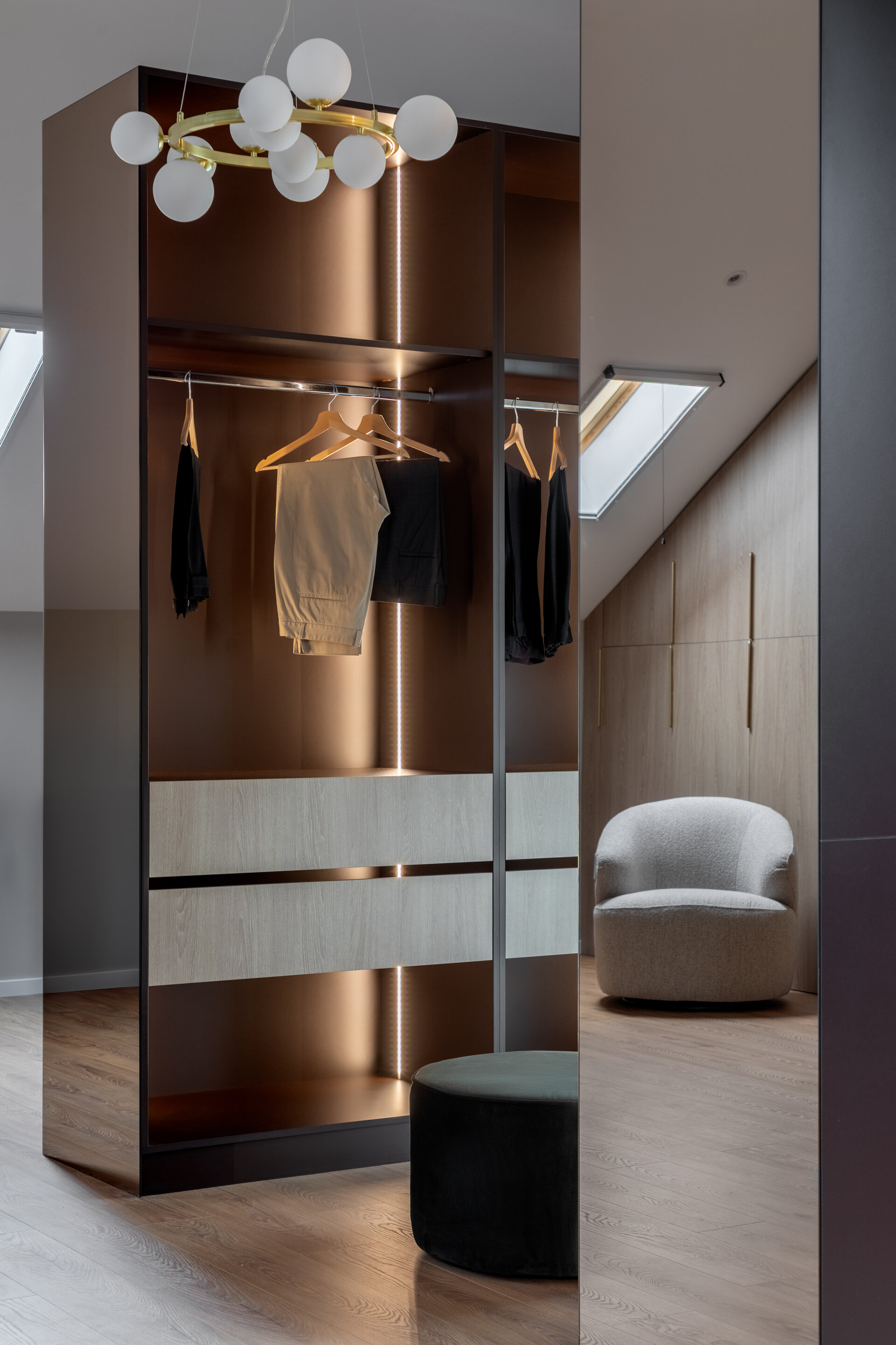 The attic is, without a doubt, the most spectacular space in the house. The client chose to transform the entire level into a dressing area – which also serves as a multifunctional room with a fitness zone. To maximize the storage potential of the attic, we designed two tall wardrobes perpendicular to the window wall, creating a rhythmic and functional spatial division. Additional cabinets of varying heights on the sides ensure optimal use of the interior volume, in harmony with the roof slopes.
