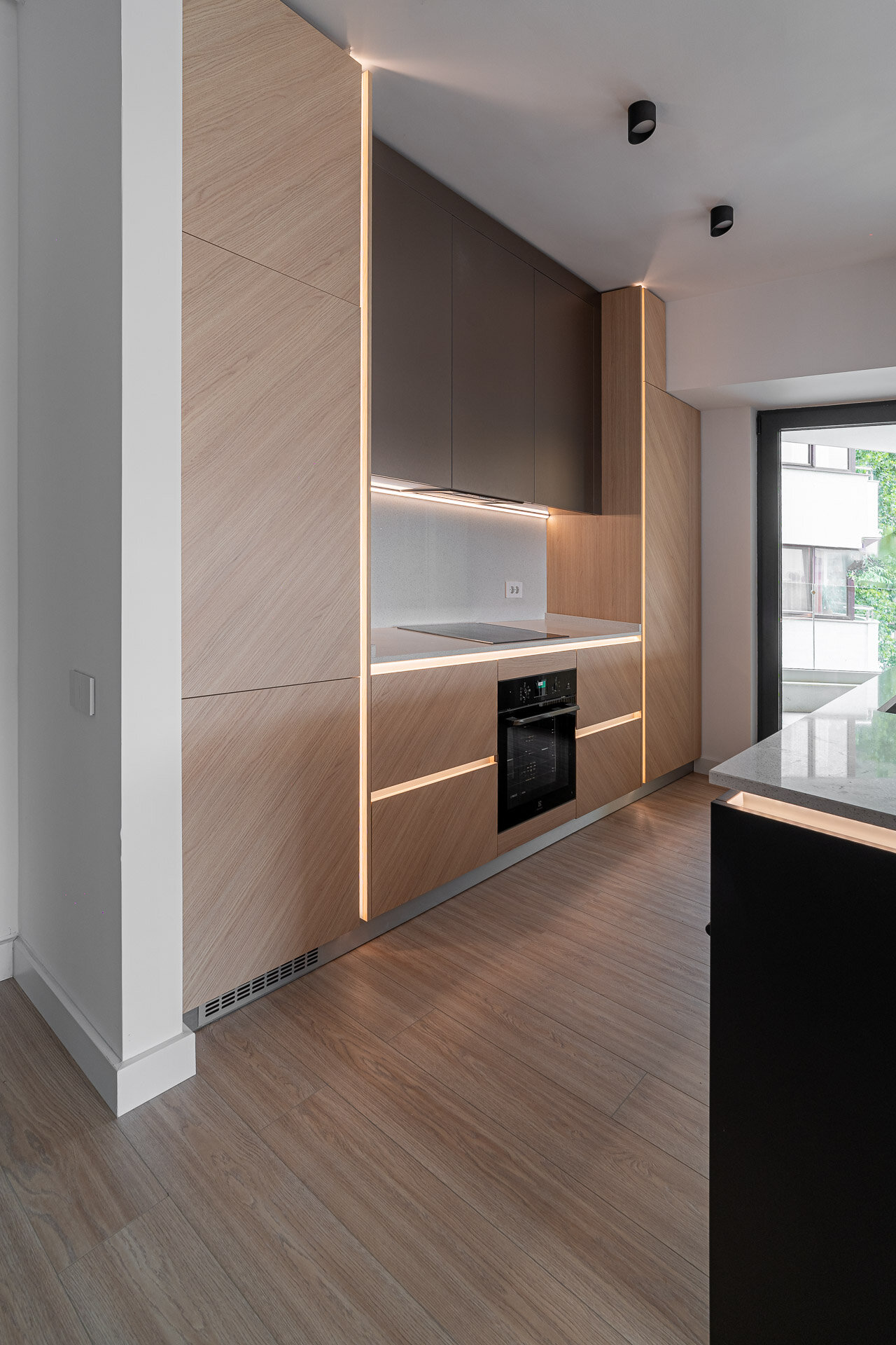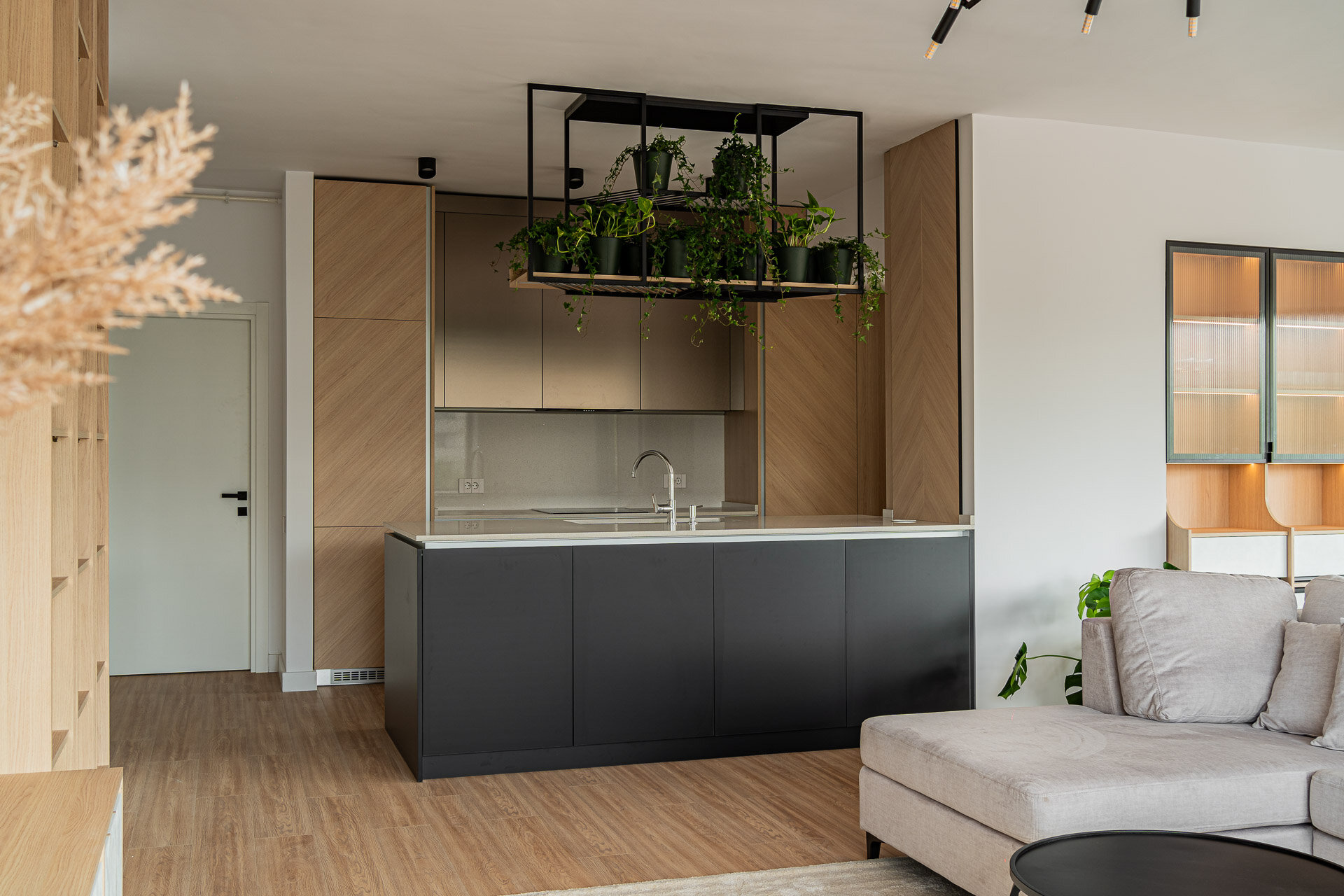 The kitchen is a focal point of the arrangement, being fluid in the living area. The bodies of front furniture, finished in dark tones, are balanced by the upper volume made of fronts in a brushed gold tone, light wood, accentuated by a black metal suspension, which hosts decorative plants and highlights the vertical axis of the space. The composite countertop, with subtle integrated LED lighting, emphasizes the island's geometry and creates a warm atmosphere, without compromising functionality.
