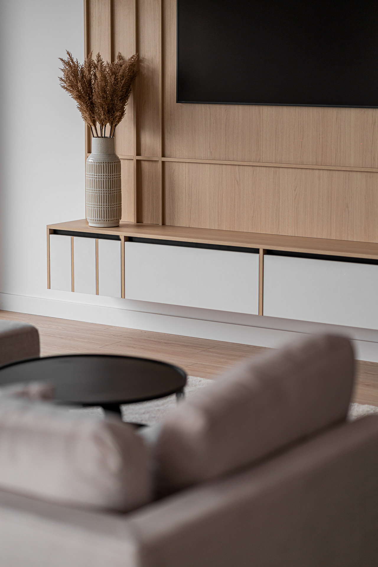 Overall, the arrangement proposes a mature aesthetic, in which the balance between textures, colors and volumes generates a space with a clear identity, but open to personal interpretations. The integration of the storage spaces, the use of natural materials and the treatment of light carefully make this apartment a contemporary, functional and welcoming home, but with character.