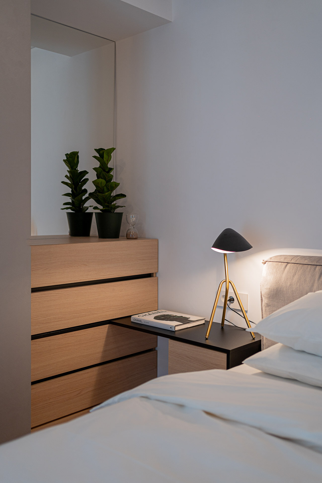 The bedroom follows the same formal and chromatic logic. The furniture is compact and integrated, avoiding visual overload. The matte finishes and the luminaires suspended at different heights add dynamism and coherence. The mirrors are strategically placed to capture natural light, especially in the dressing area, where the compartmentation is effective, and the simple lines dominate.