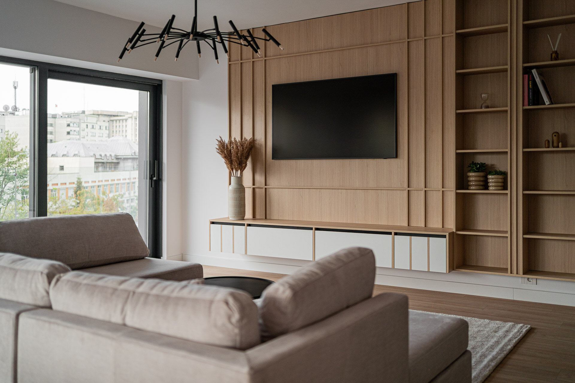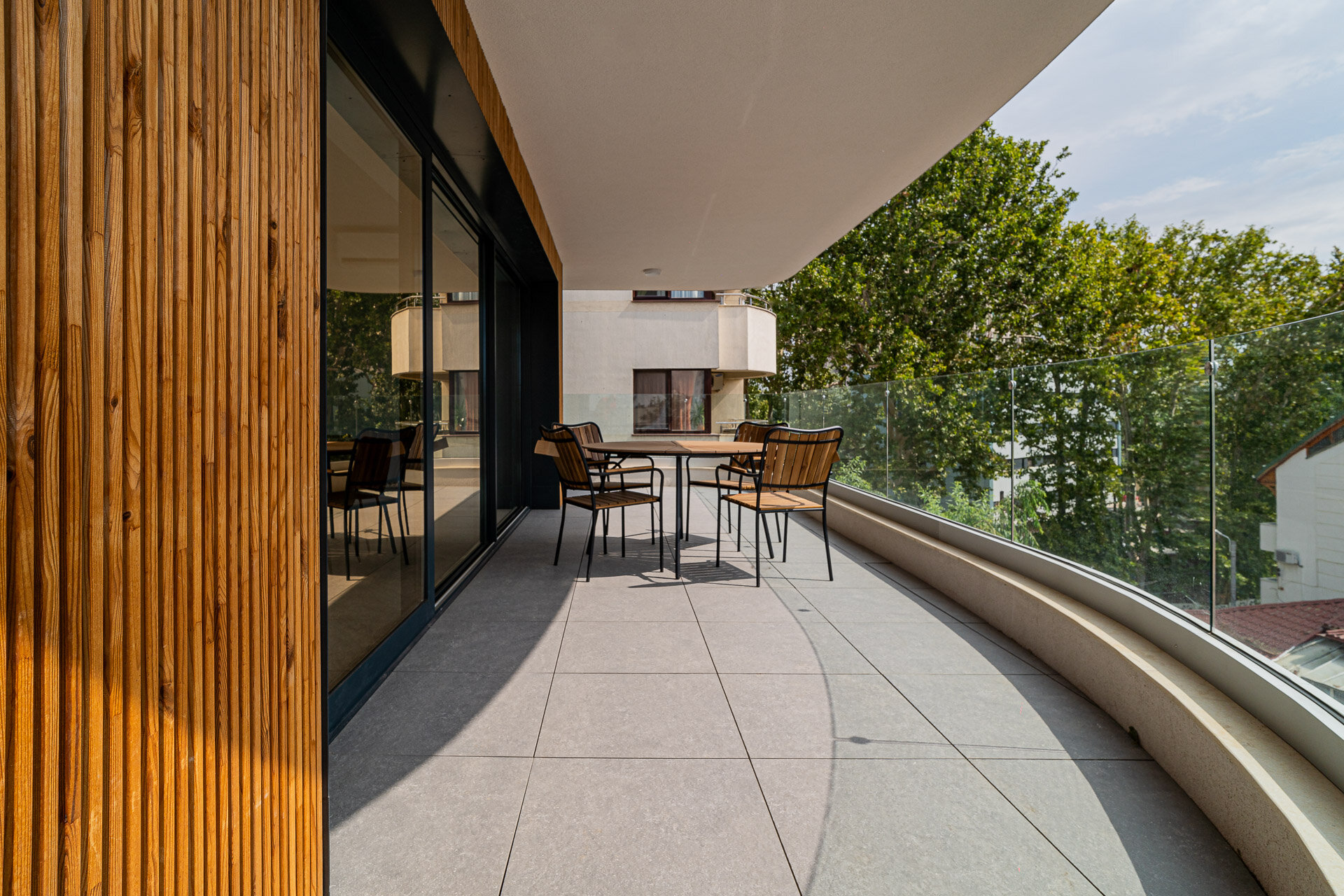 Another valuable element of the apartment is the terrace, generous and visually framed by a plated wall with a vertical wooden ripening, which tempers the light and adds the outer composition. Discreetly furnished, this becomes a natural extension of the living area, ideal for relaxation or socialization.