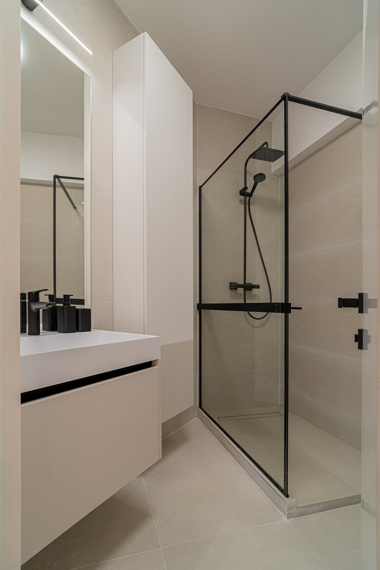 The bath continues the aesthetic language of the whole apartment through natural materials, neutral tones, clear volumes. The shower area is delimited by a transparent glass screen, without visible profiles, maintaining a clear and fluid perception of the space. The suspended furniture and white washbasin make up a minimalist, but well proportioned image.