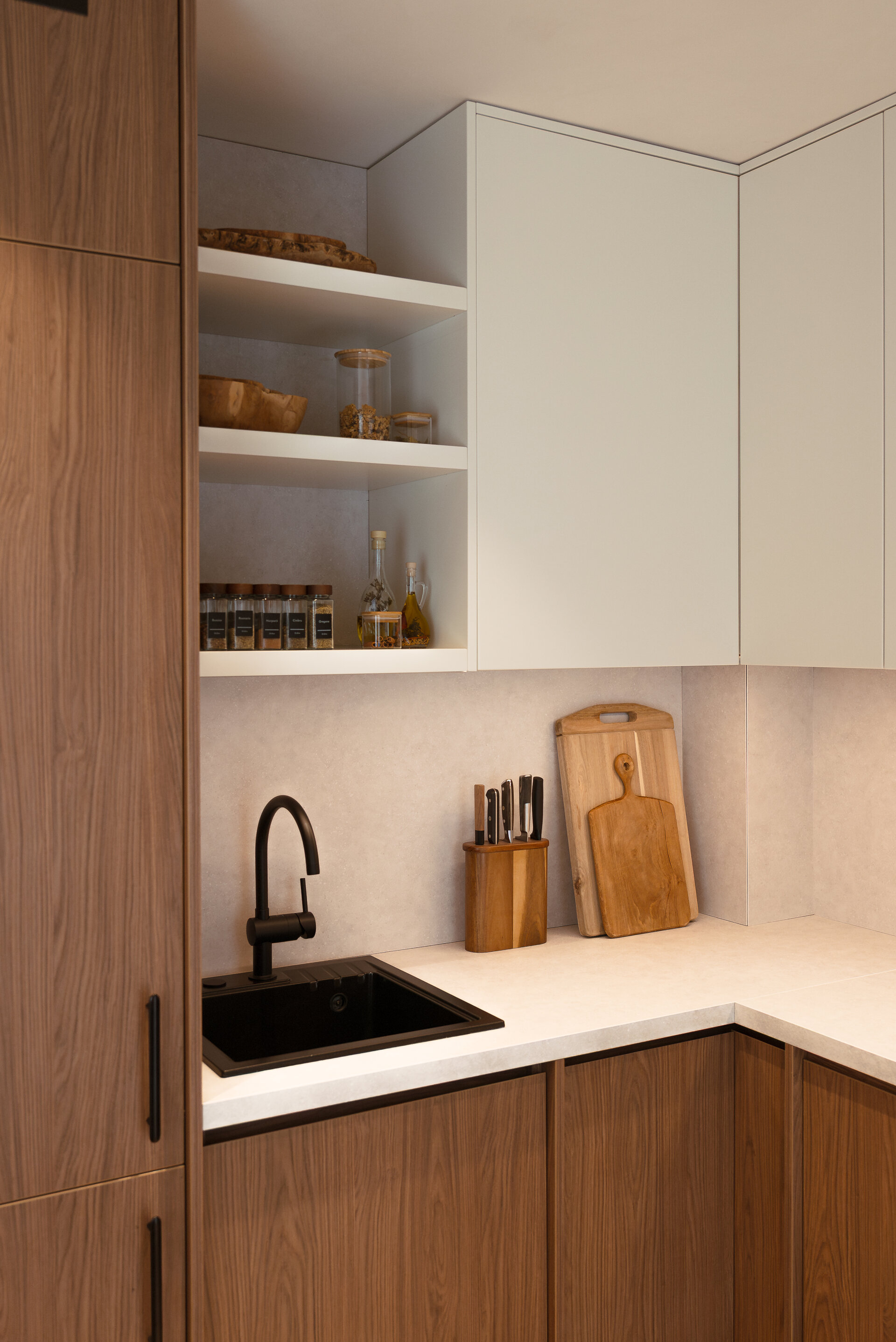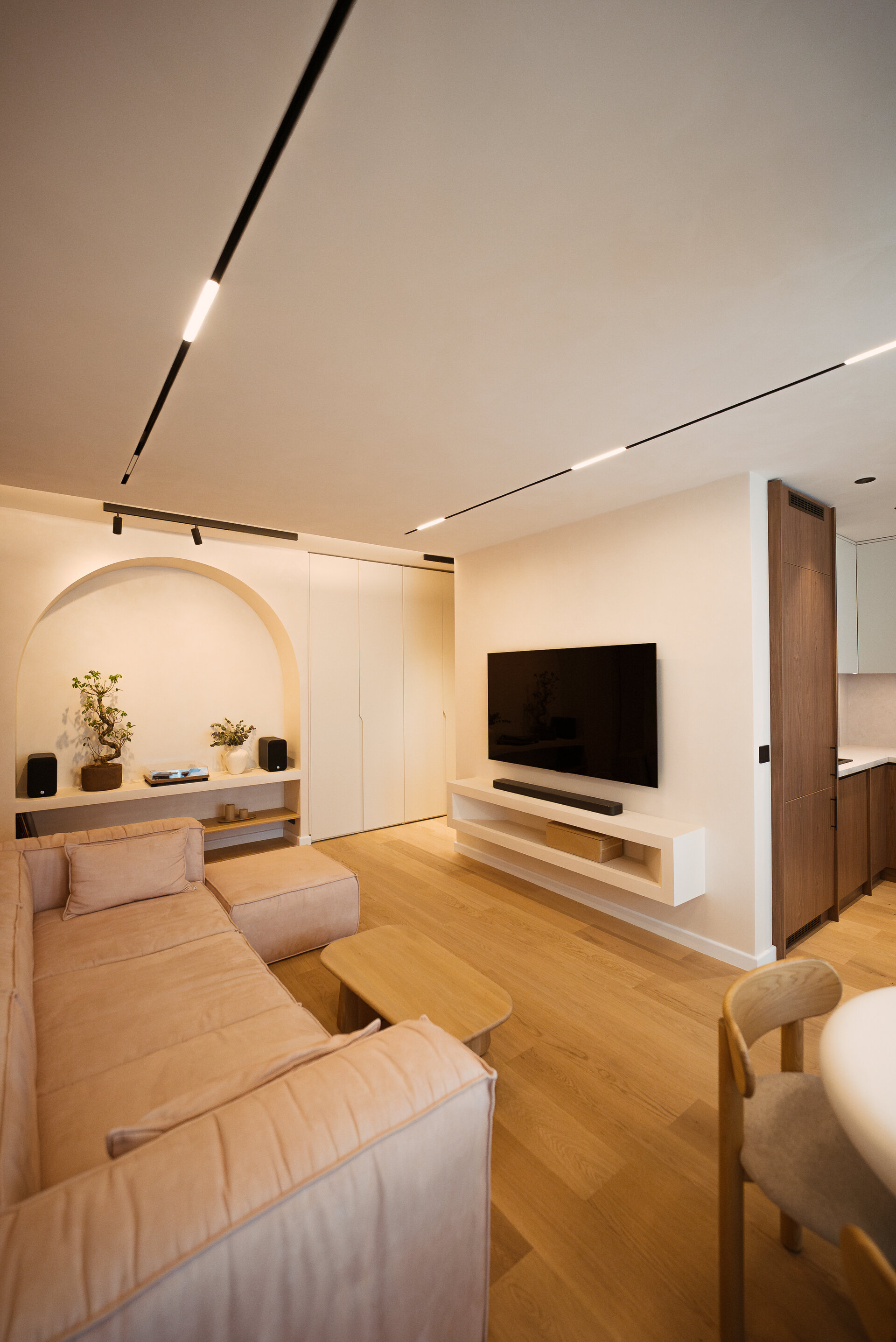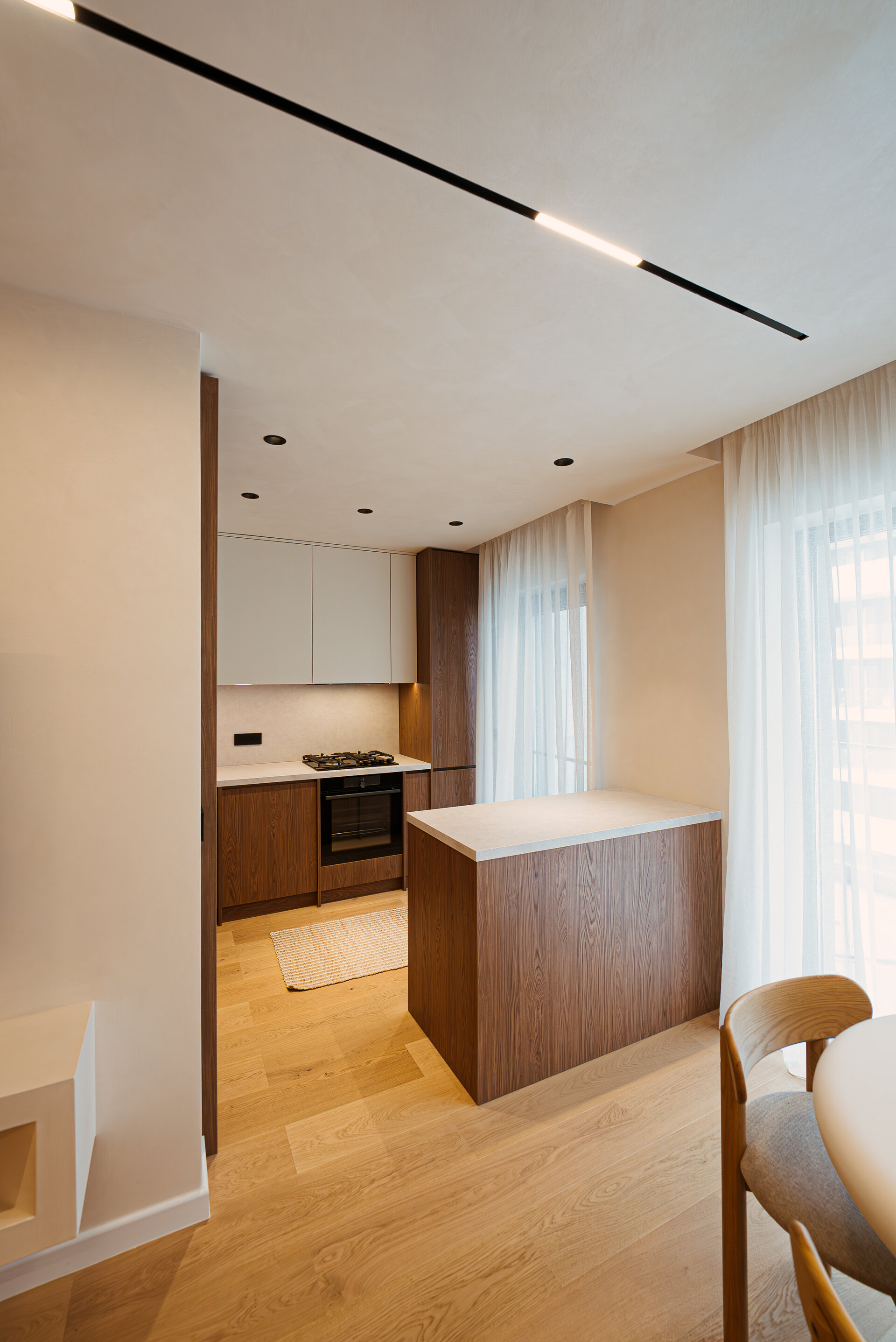 Located in the northern part of Bucharest, this apartment is an exercise in balance between functionality and material poetry. The project explores a discreet aesthetic inspired by the Wabi-Sabi philosophy, where imperfection becomes a mark of authenticity, and the naturality of materials is distilled into every detail.