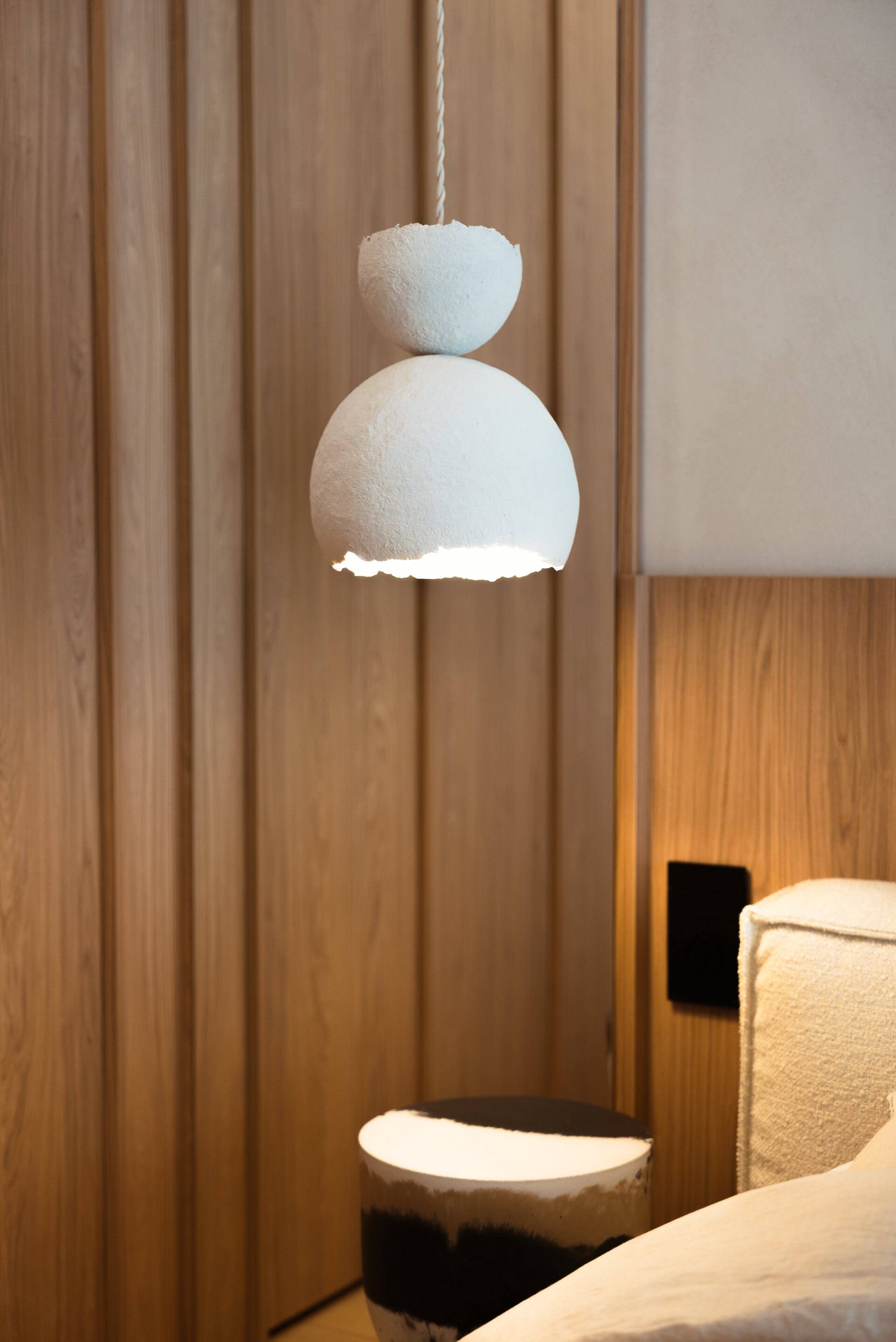 Textures act as narrative elements. Mineral finishes, seemingly untreated wood, and raw textiles create a calm, timeless atmosphere. Light is filtered through indirect sources that highlight surfaces without overwhelming the perception. The color palette is subdued, with neutral tones allowing materials to speak naturally.