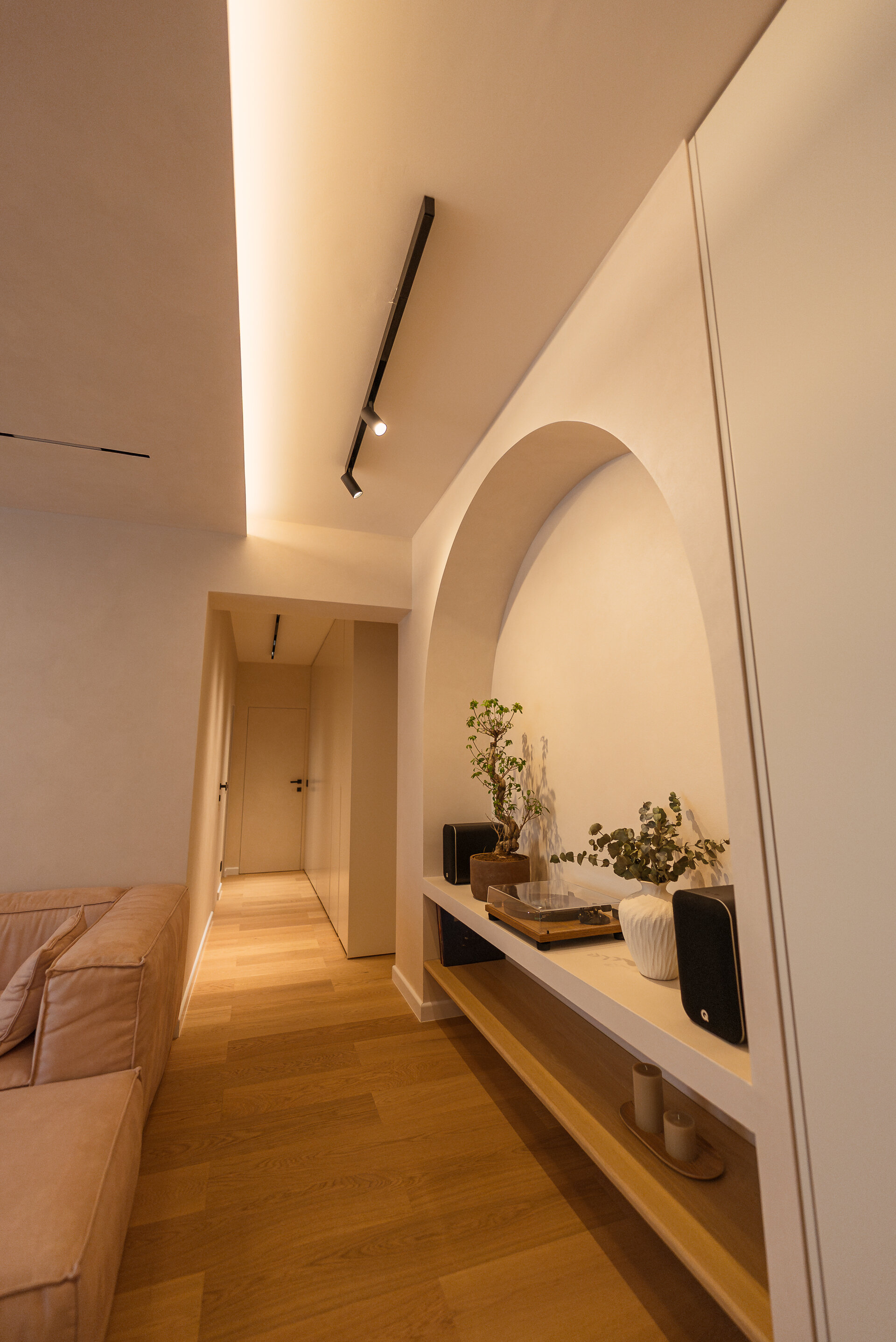 Interior volumetry is treated gently, with hard lines replaced by organic shapes, generous arches, and sculptural insertions that seem carved into the mass of the walls. These architectural gestures define the space without fragmenting it, creating a fluid continuity between functional areas. The furniture is reduced to the essentials and discreetly integrated, in a process of dematerialization that emphasizes spatial quality rather than the accumulation of objects.