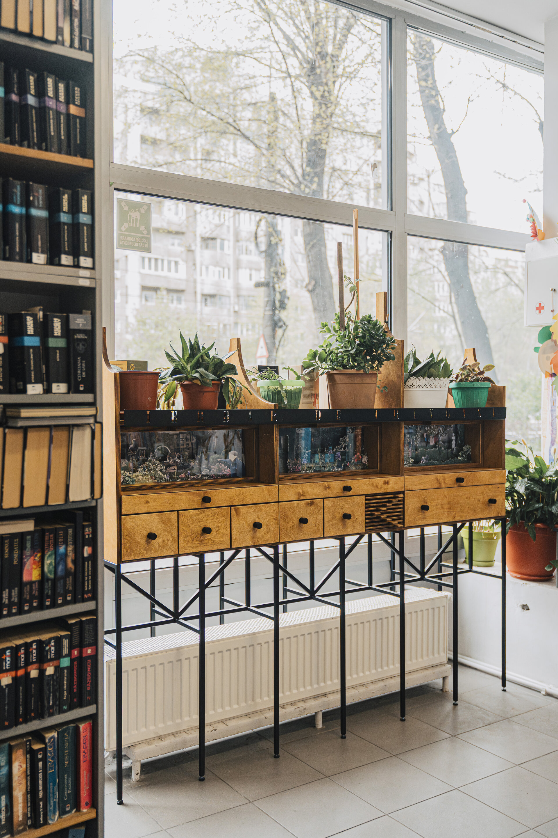 Seeking to illustrate the findings about the necessary conditions, resources and formats through which informal practices are enabling (environmental) commons, the research went propositional and materialized into a communication equipment. Constructed at the intersection between a museum artefact, a school research lab and a furniture specific to a public library, The Crângași Herbarium aims to fill a gap in the institutional landscape by enacting around it a hybrid model of a local knowledge centre, where the content design adapts to the community’s features and interests highlighted by the research. Placed in a public library, the device seeks to articulate the knowledge related to the topic of informal practices and gardens in a new and distinct section, thus signalling their importance and evidencing their value, against its constant dismissal in the public discourse. The equipment and its uses also illustrate designers’ capacity to play a critical role in imagining new forms of community regeneration of collective housing districts by explicitly observing, valuing and sustaining such forms of ‘vernacular ecologies’ (Gandy, 2022, p.34) as part of the ecosystem of environmental commons.