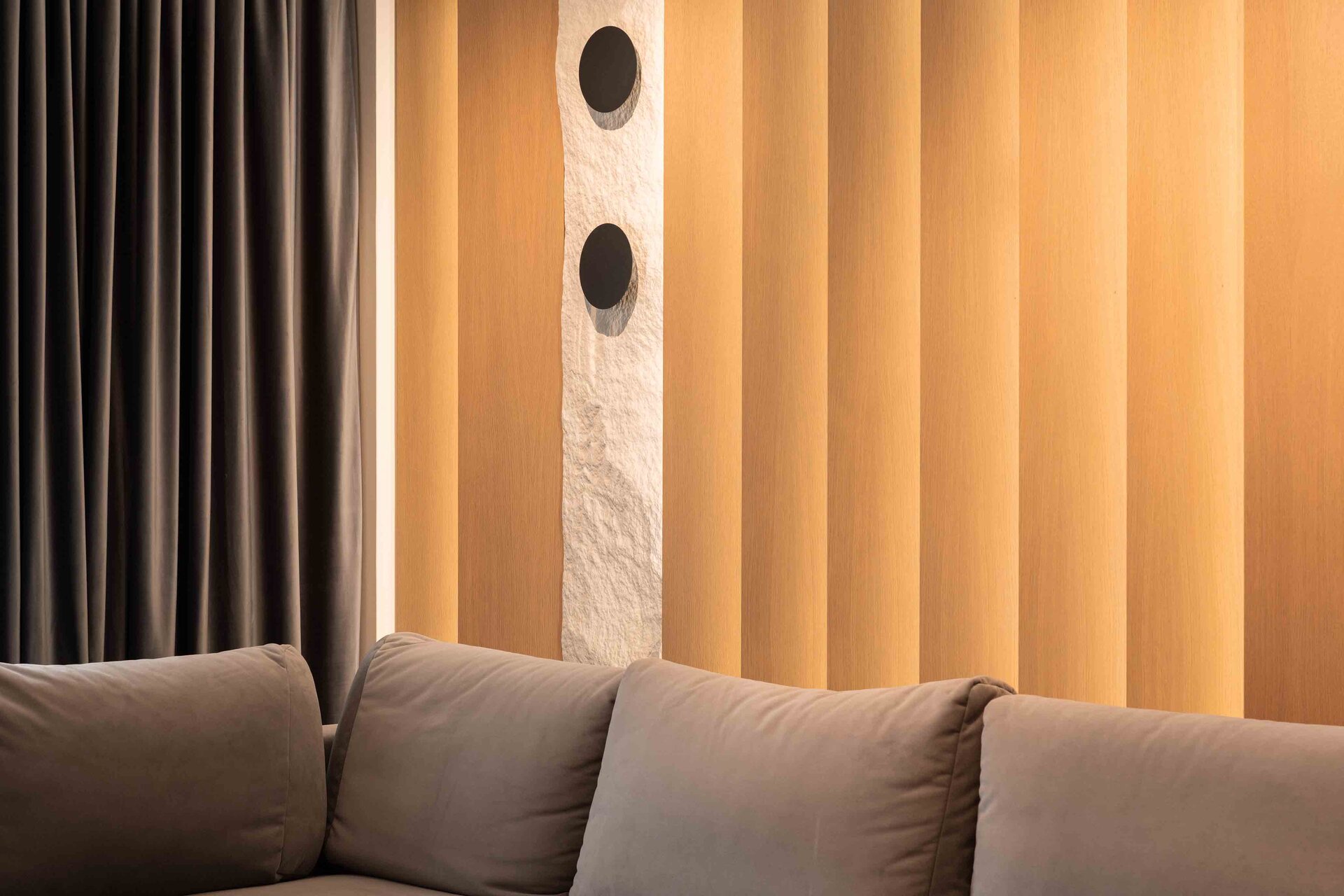 The living area is open and welcoming, yet defined by a rigorous composition, tactile refinement, and discreet balance. Vertical wooden panels, installed against a backdrop of mineral plaster with a raw finish, generate a sculptural rhythm that gives depth and identity to the space.
