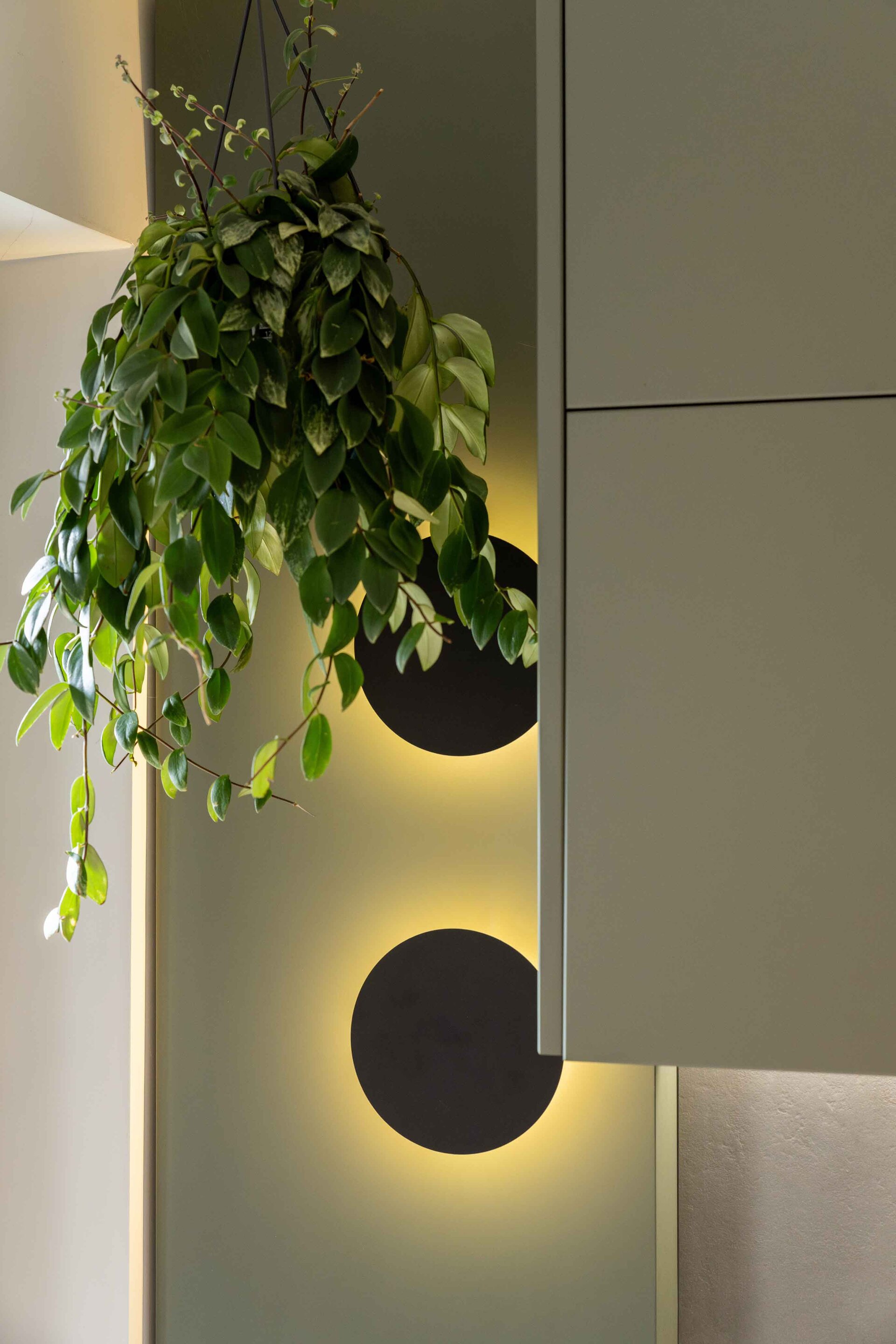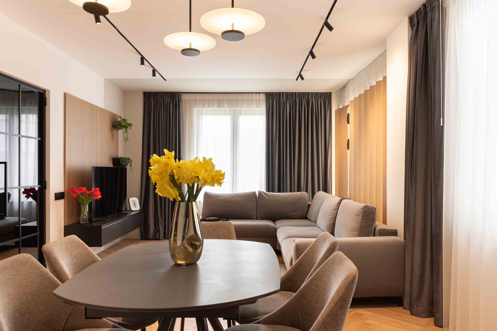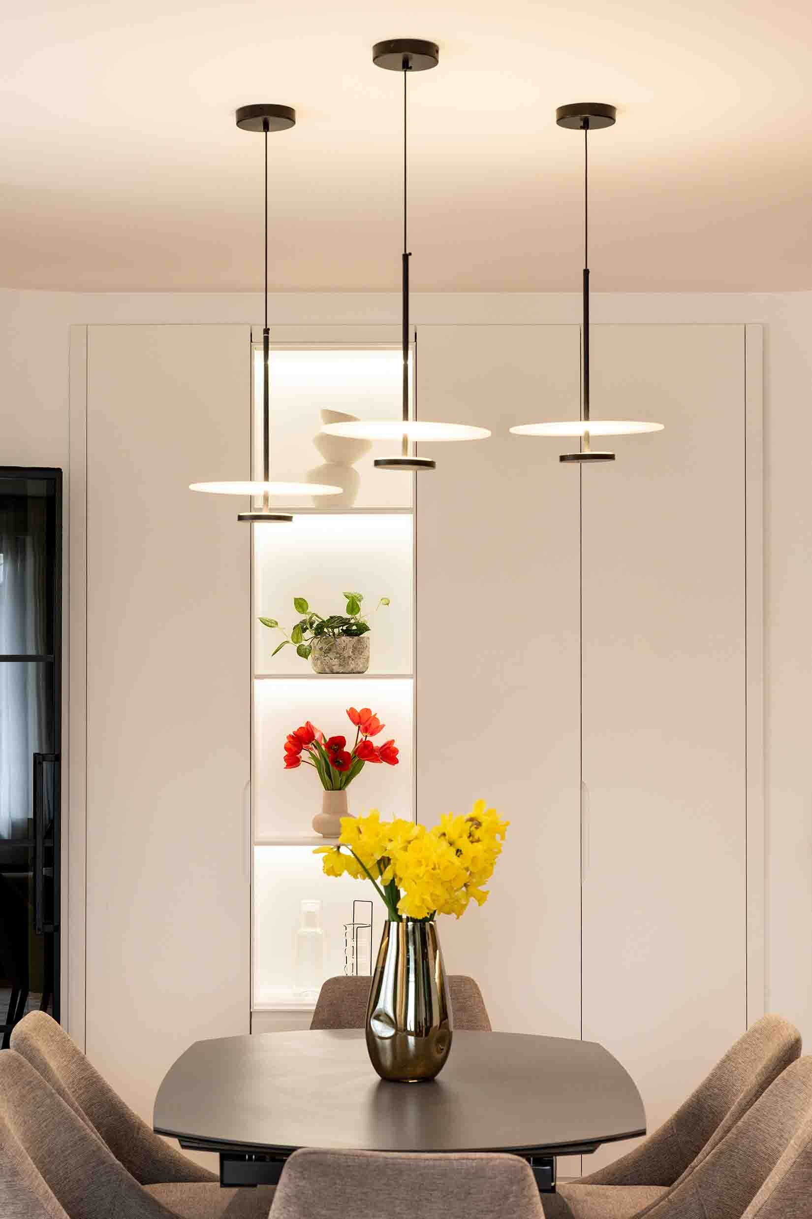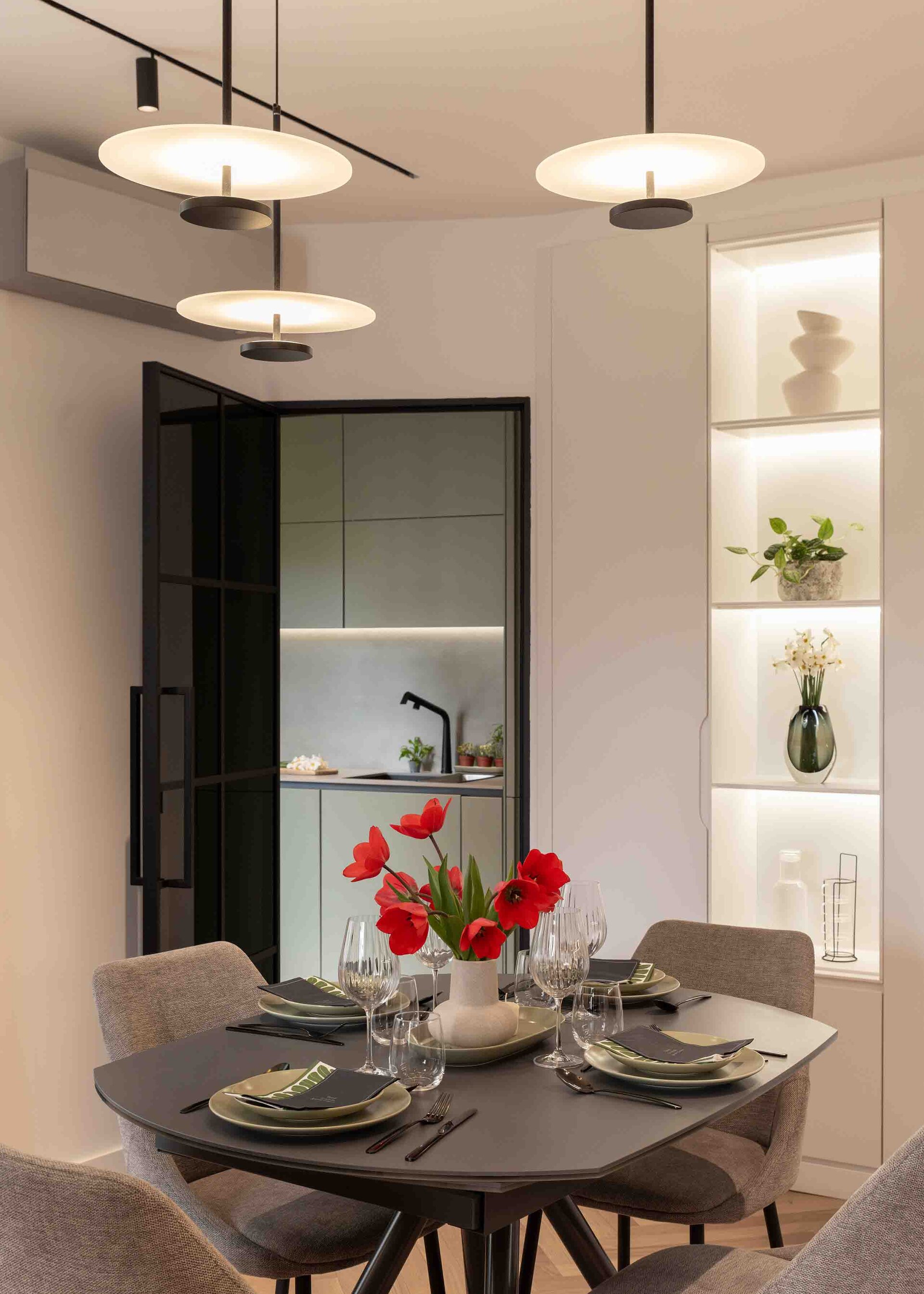 The dining area unfolds as a natural extension of the living room, where the interplay of light—created by circular pendants and illuminated niches—brings depth and refinement. These lighting accents are subtly complemented by the layout of technical spotlights.